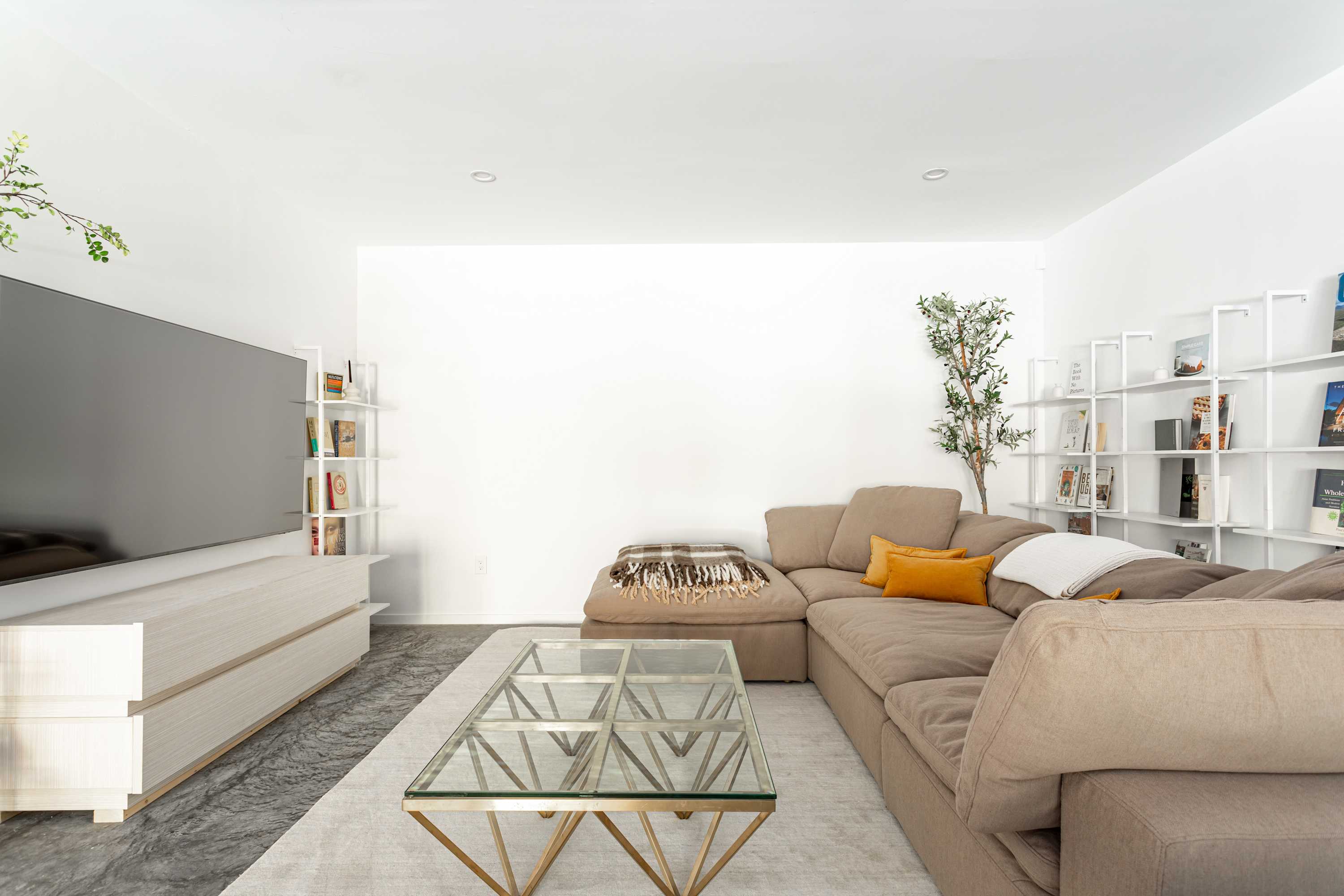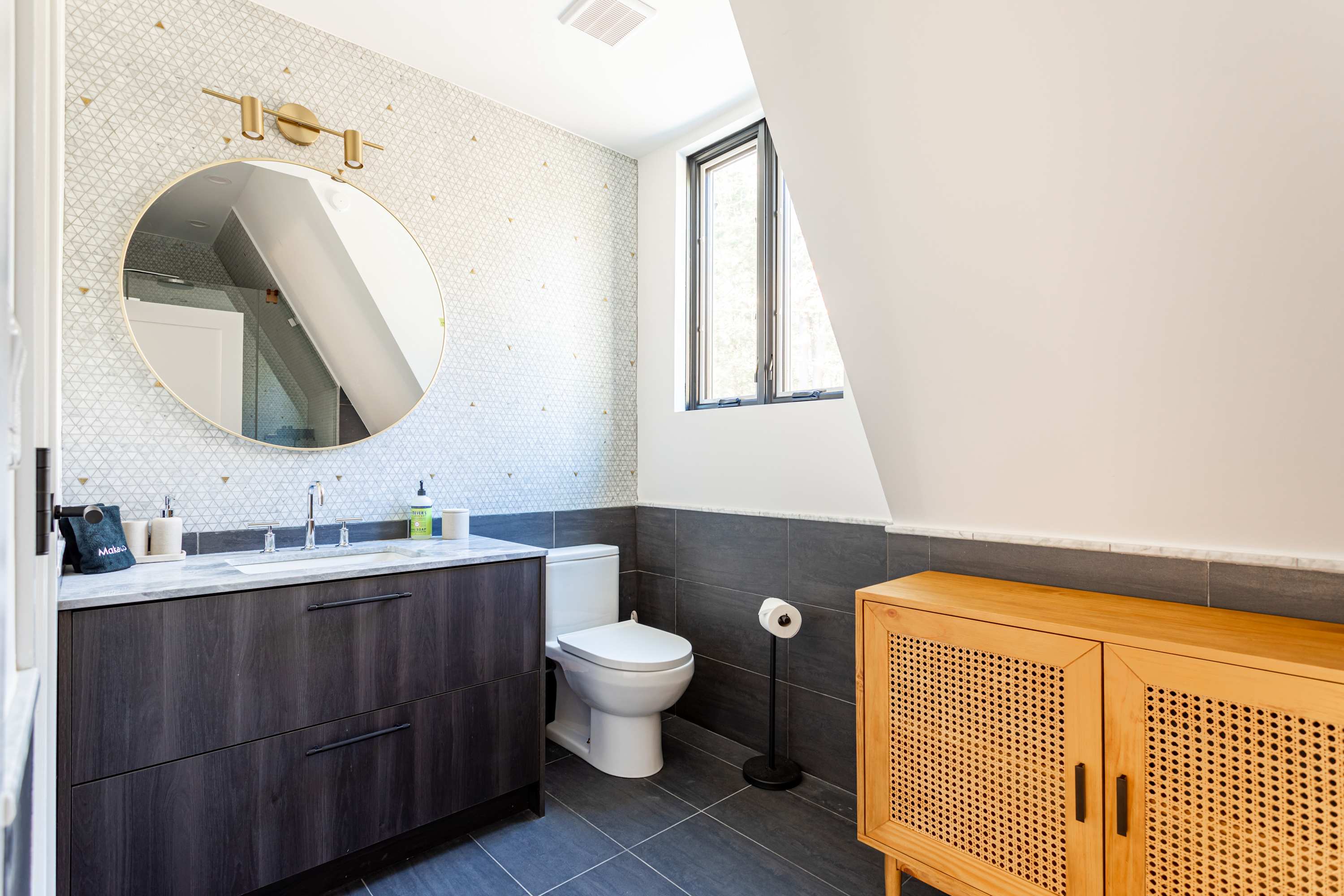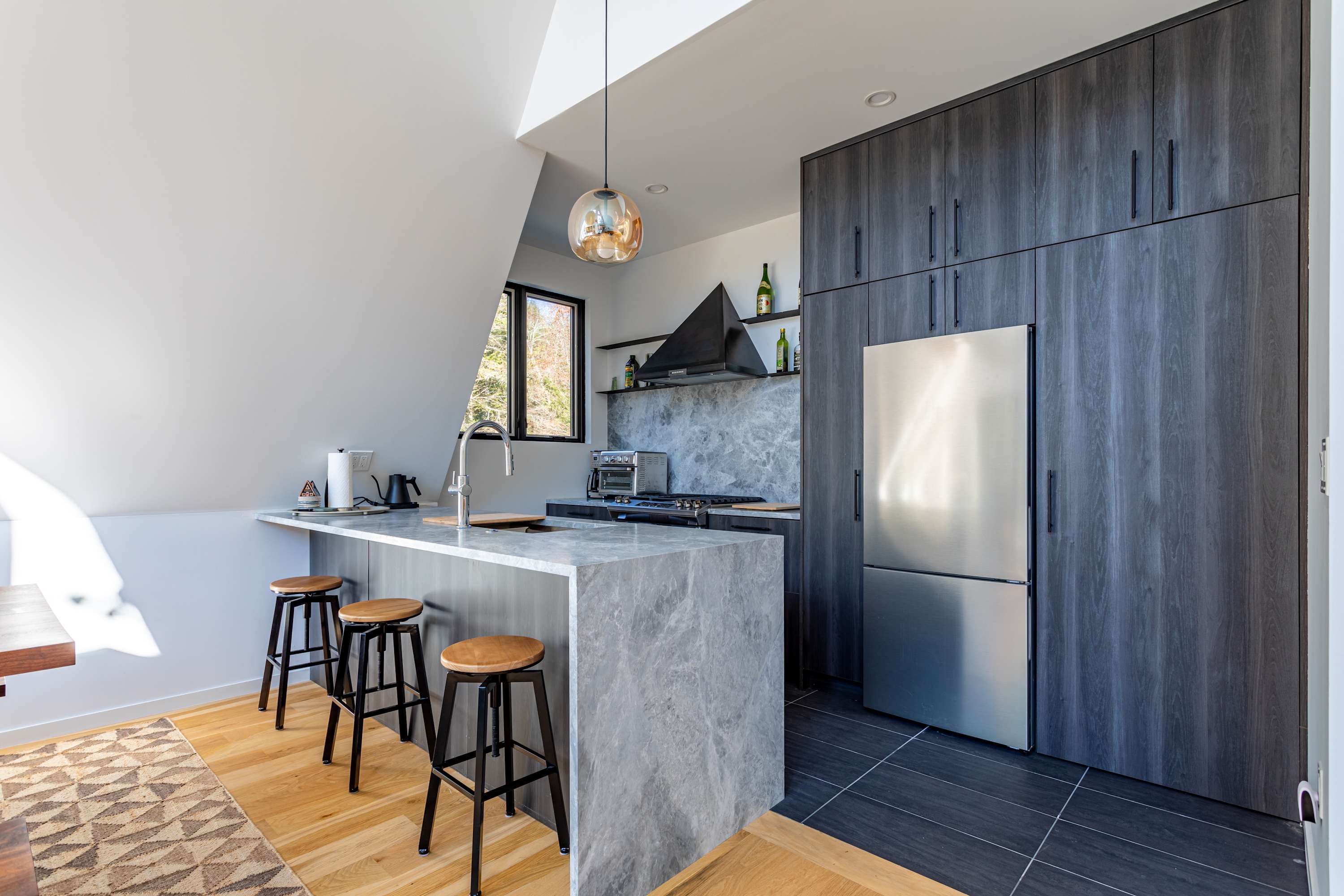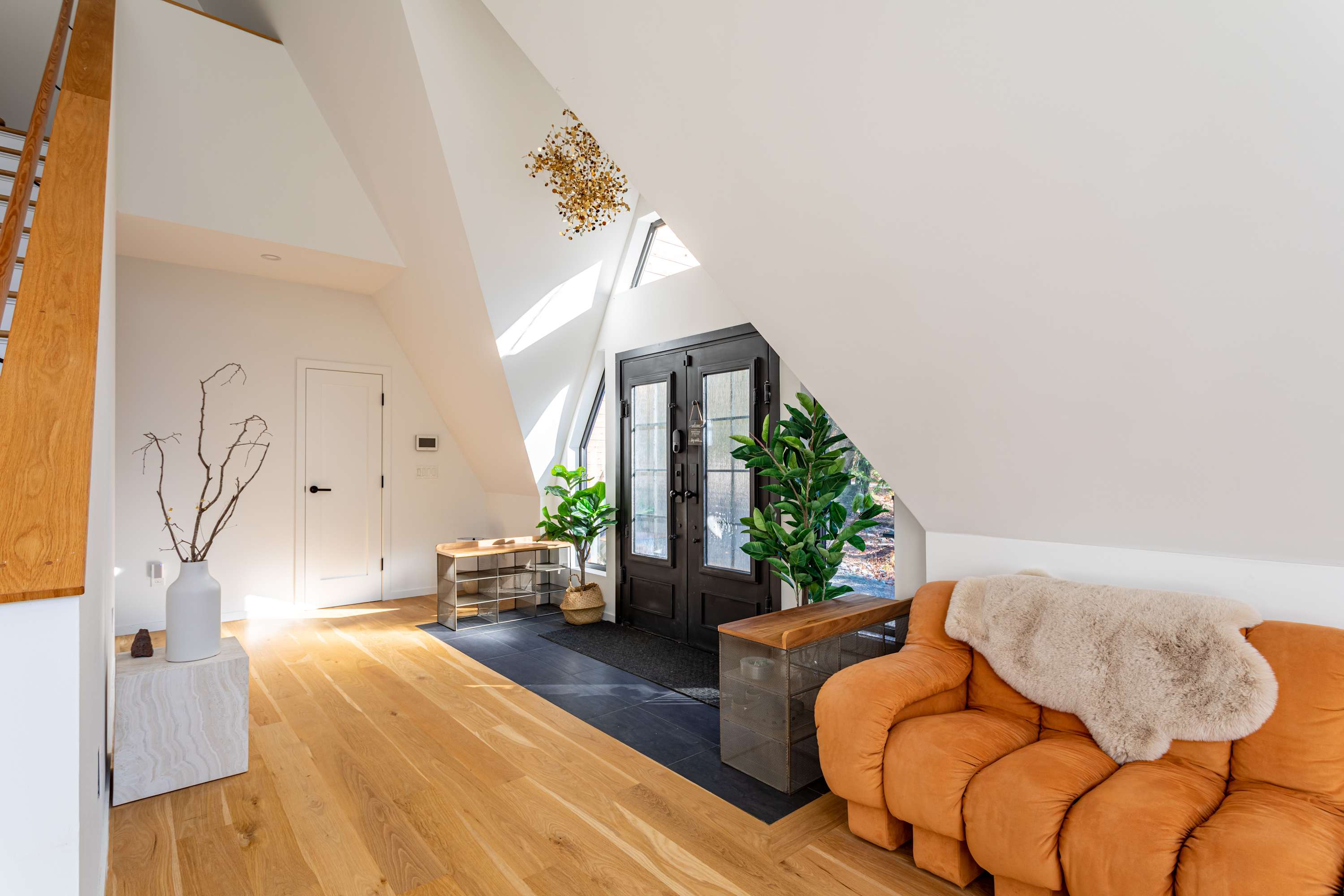 The open-concept main floor is bright, airy, and beautifully designed for gathering and relaxation. The living area features a striking A-frame ceiling with expansive windows that fill the space with natural light and frame views of the surrounding forest. A plush, rust-colored curved sectional invites you to unwind by the suspended fireplace, creating a cozy focal point for evenings in.