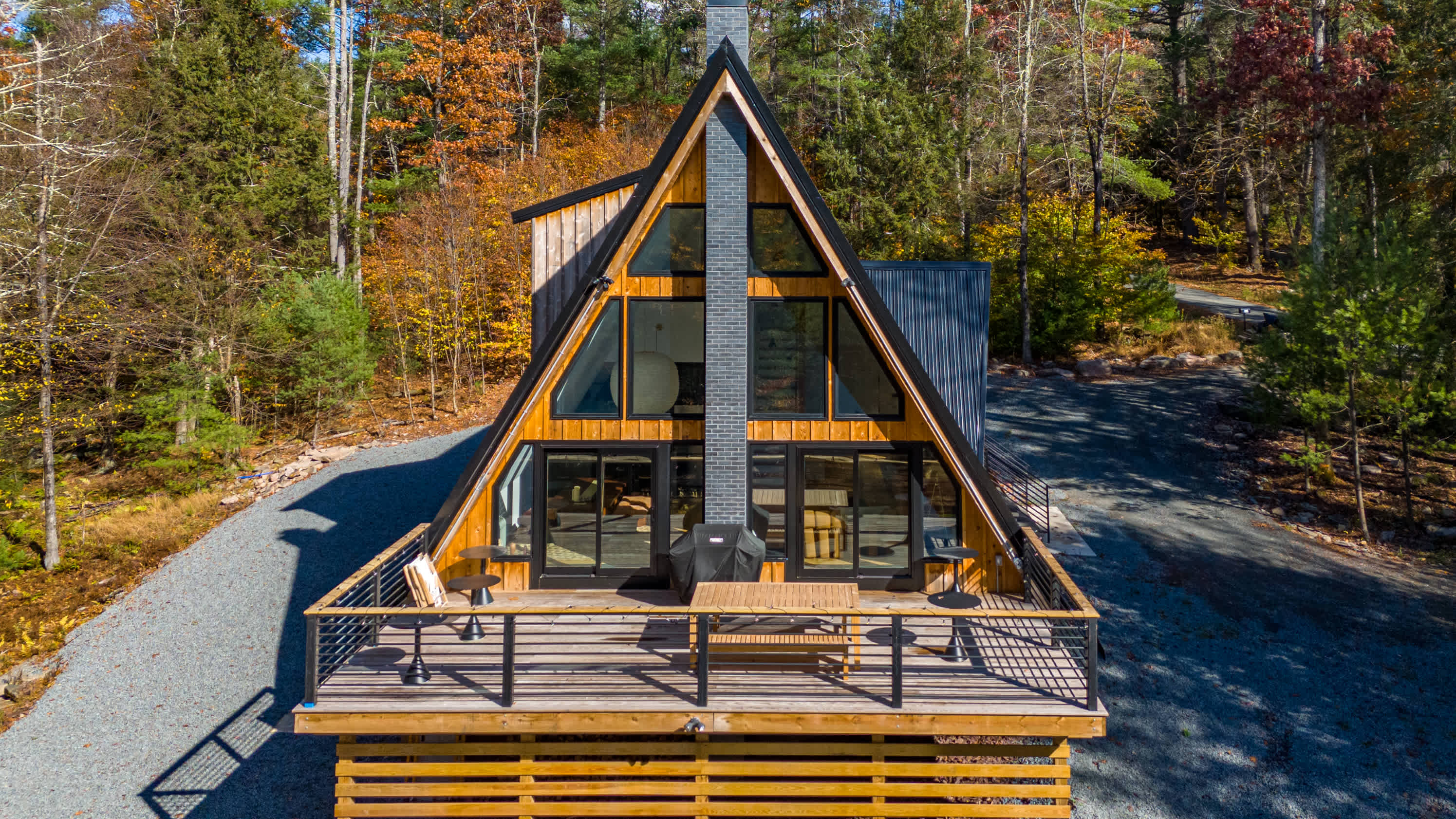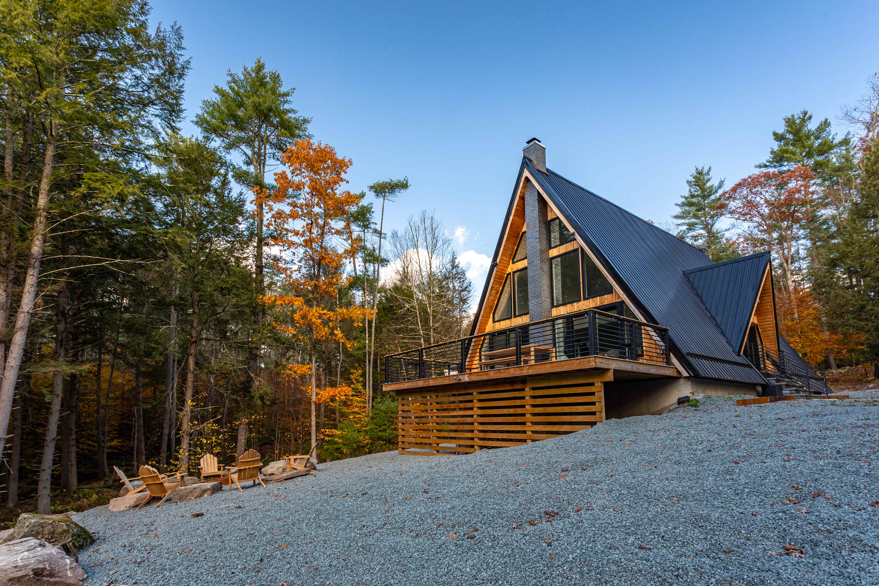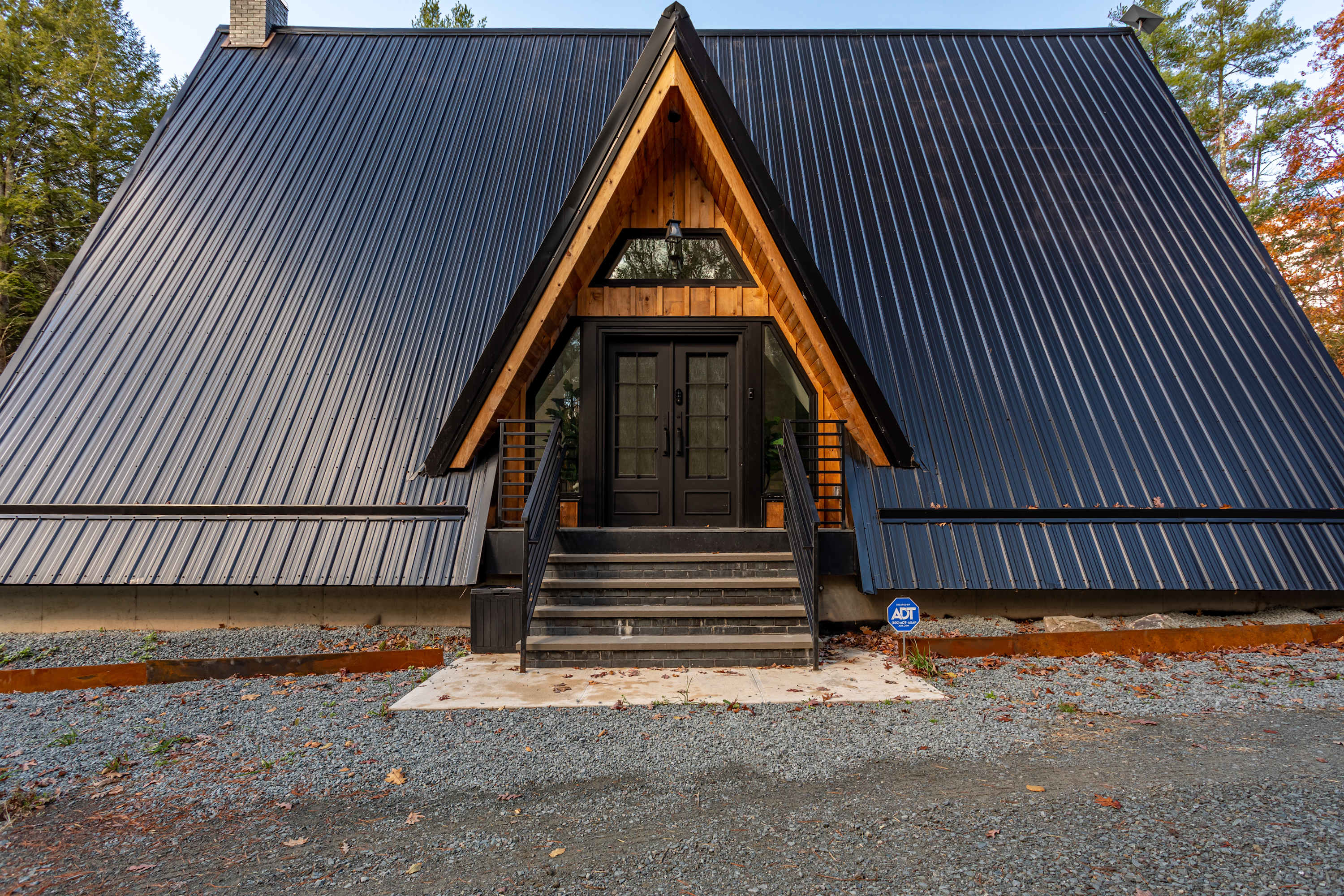 Tetra A-Frame is a striking modern A-frame getaway tucked deep within a private wooded setting with a dramatic charcoal metal roof and warm natural wood accents. A long gravel driveway leads you through the trees to the front entrance and the home is surrounded by peaceful forest views in every direction.