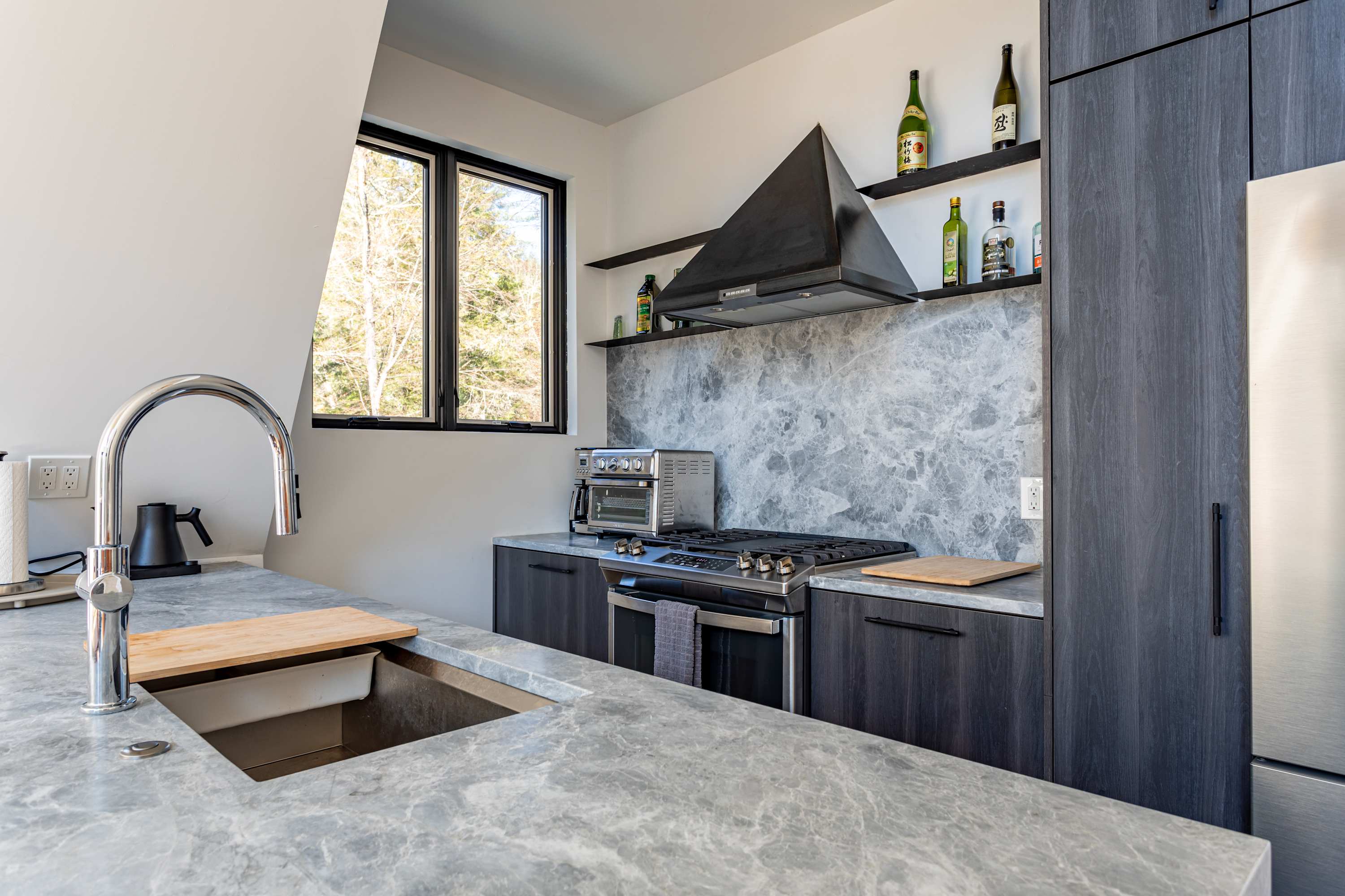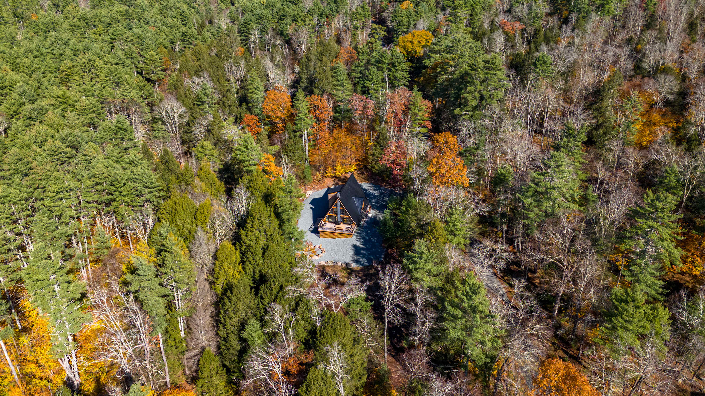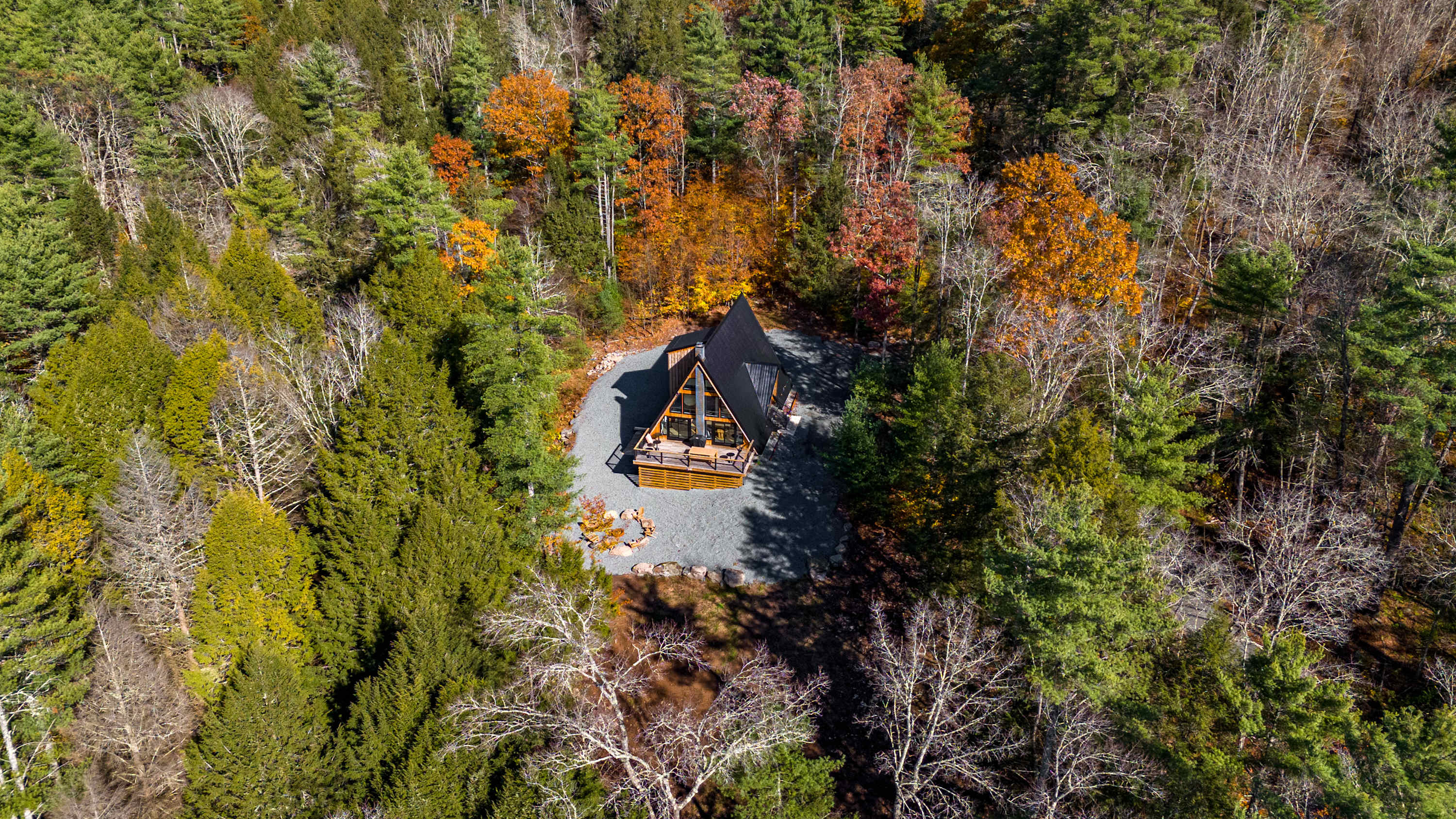 Tetra A-Frame is a striking modern A-frame getaway tucked deep within a private wooded setting with a dramatic charcoal metal roof and warm natural wood accents. A long gravel driveway leads you through the trees to the front entrance and the home is surrounded by peaceful forest views in every direction.