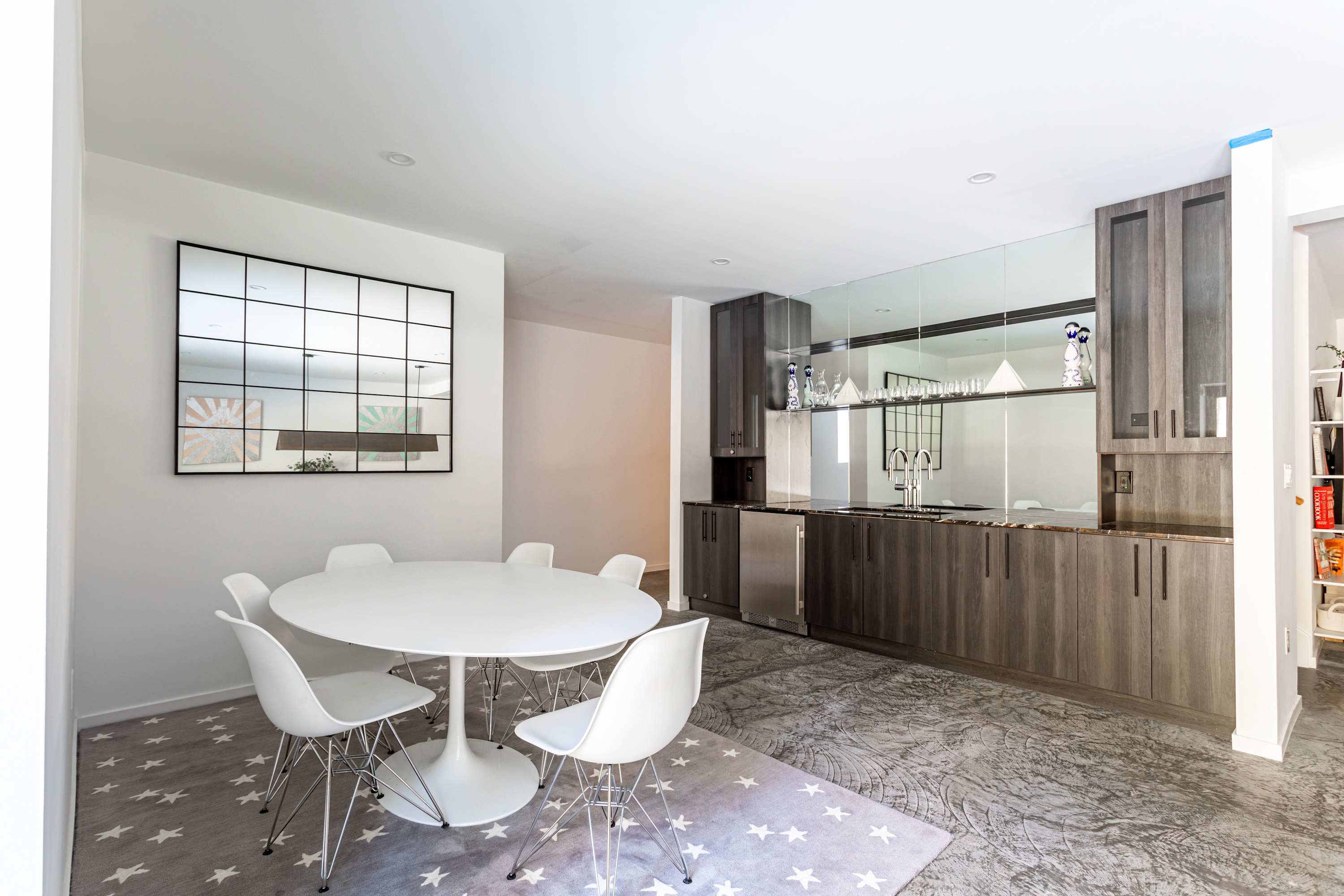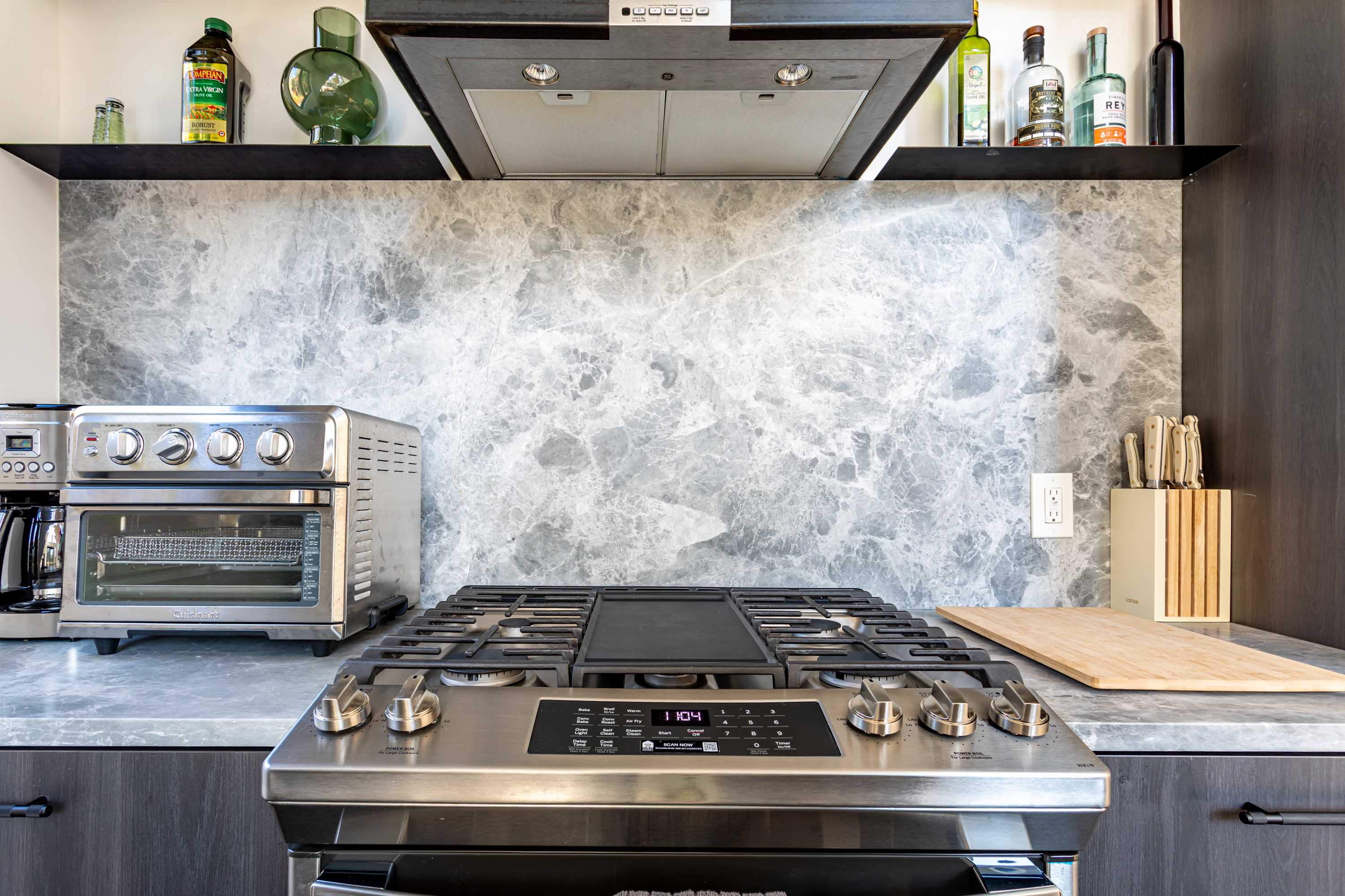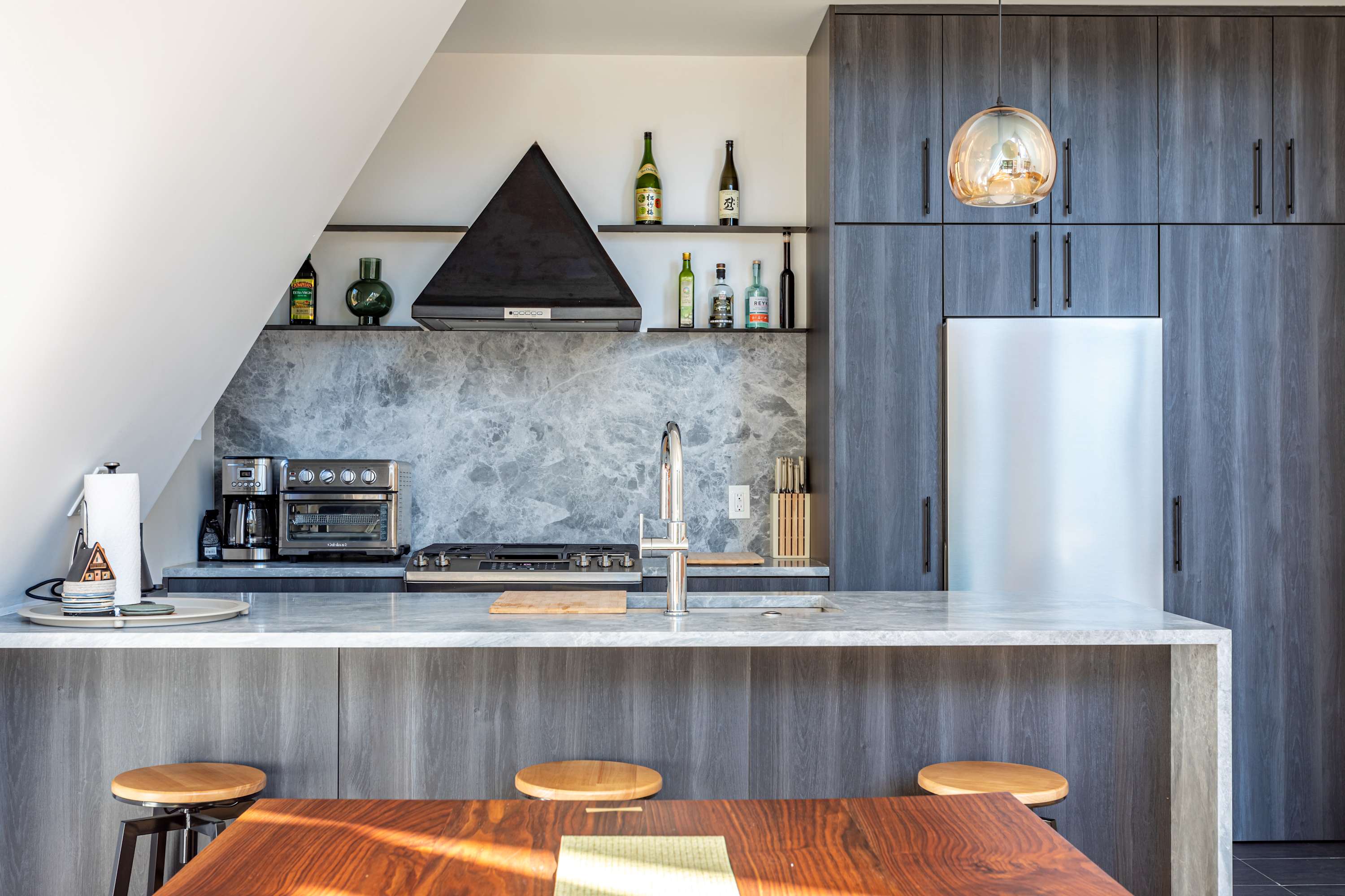 The kitchen offers a marbled backsplash and counters, black cabinetry, stainless steel appliances, and bar seating for casual meals or morning coffee. Adjacent to the kitchen, the dining area features a solid wood table with matching benches and soft cushions, perfect for shared meals or game nights.
