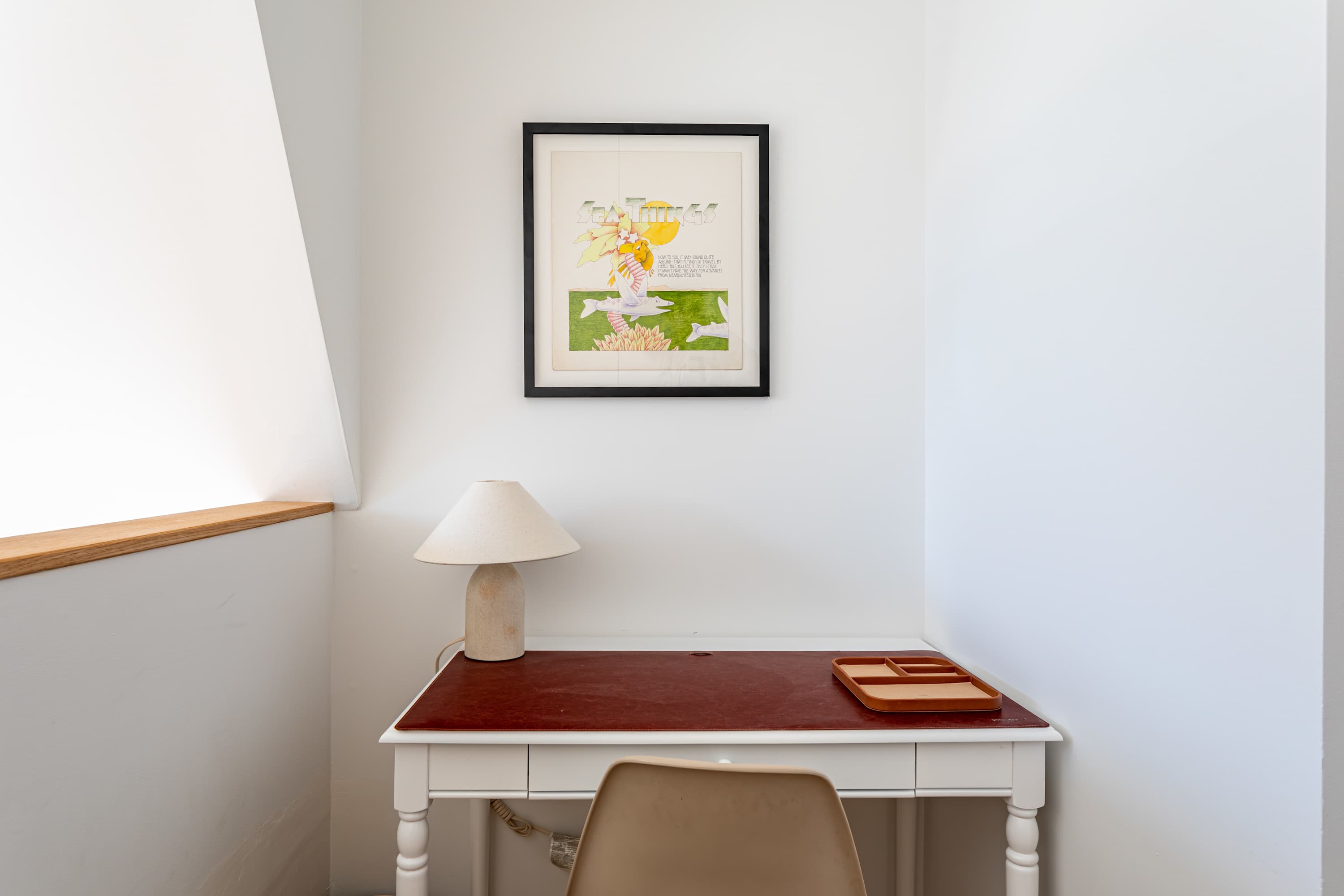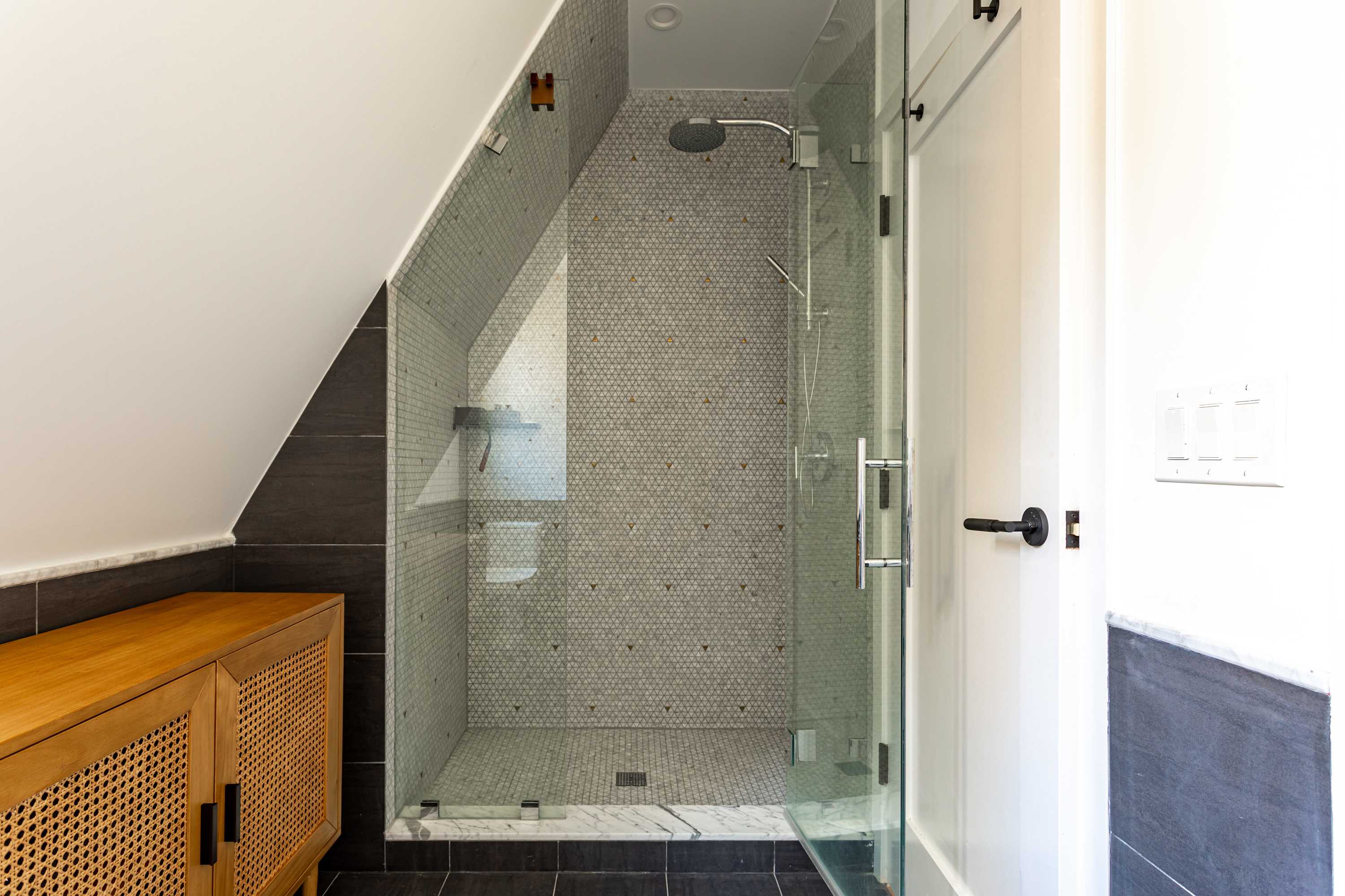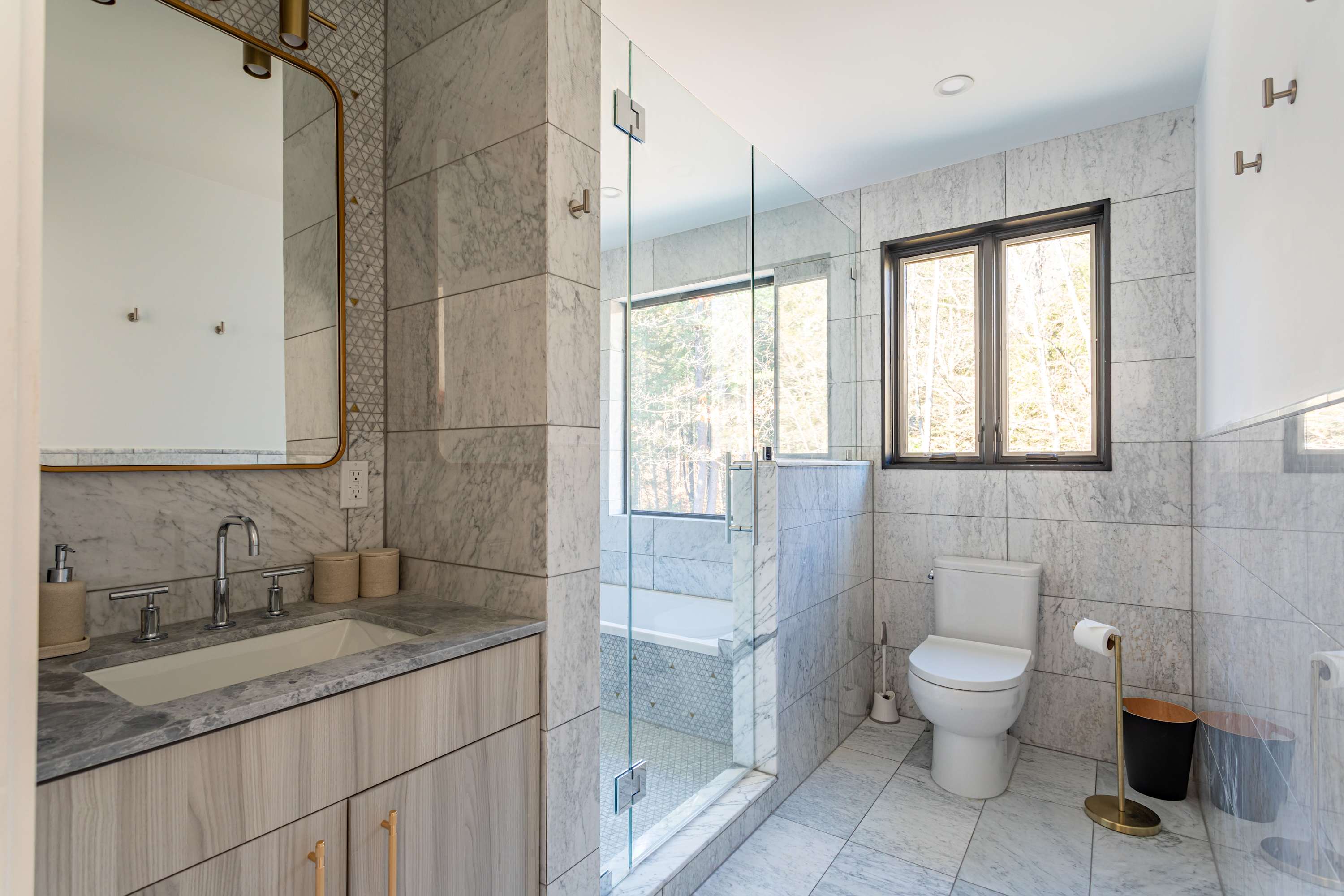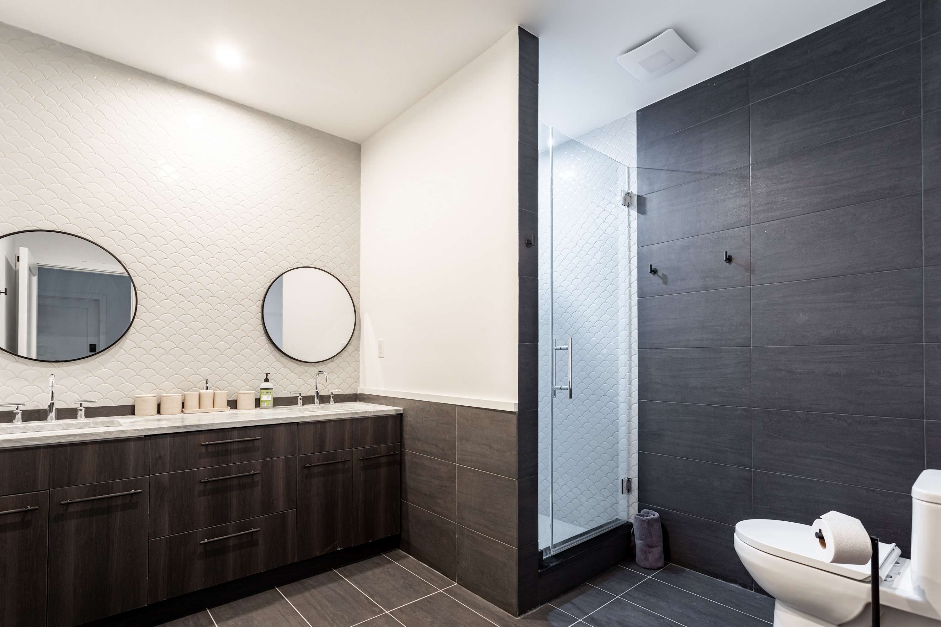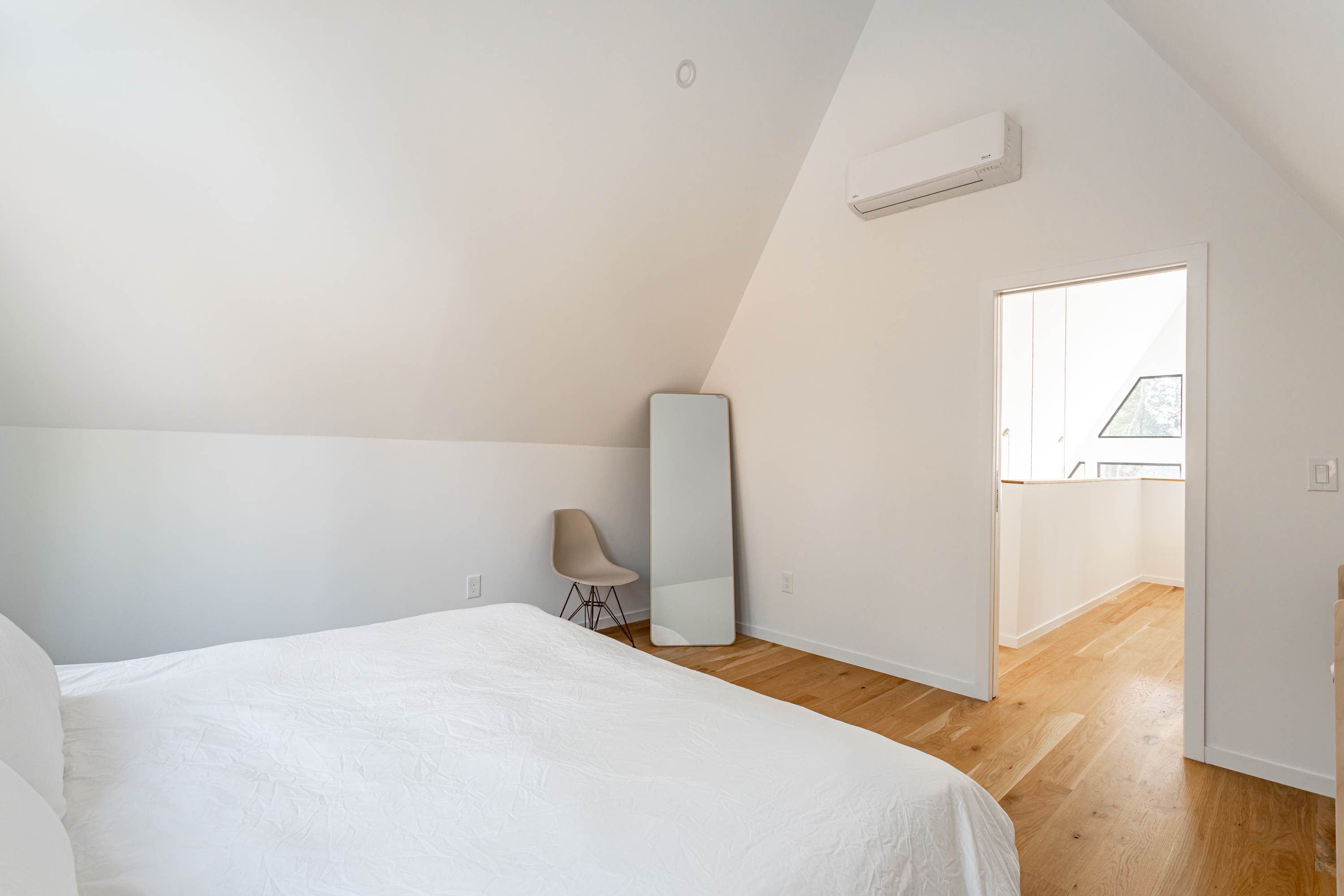 On the upper level is the primary bedroom featuring a king size bed, a cozy workspace area and a bathroom with a walk-in shower and bath tub. Two additional guest bedrooms, located on the main floor, offer a queen size bed, a laptop friendly workspace and share a bathroom with a walk-in shower.
