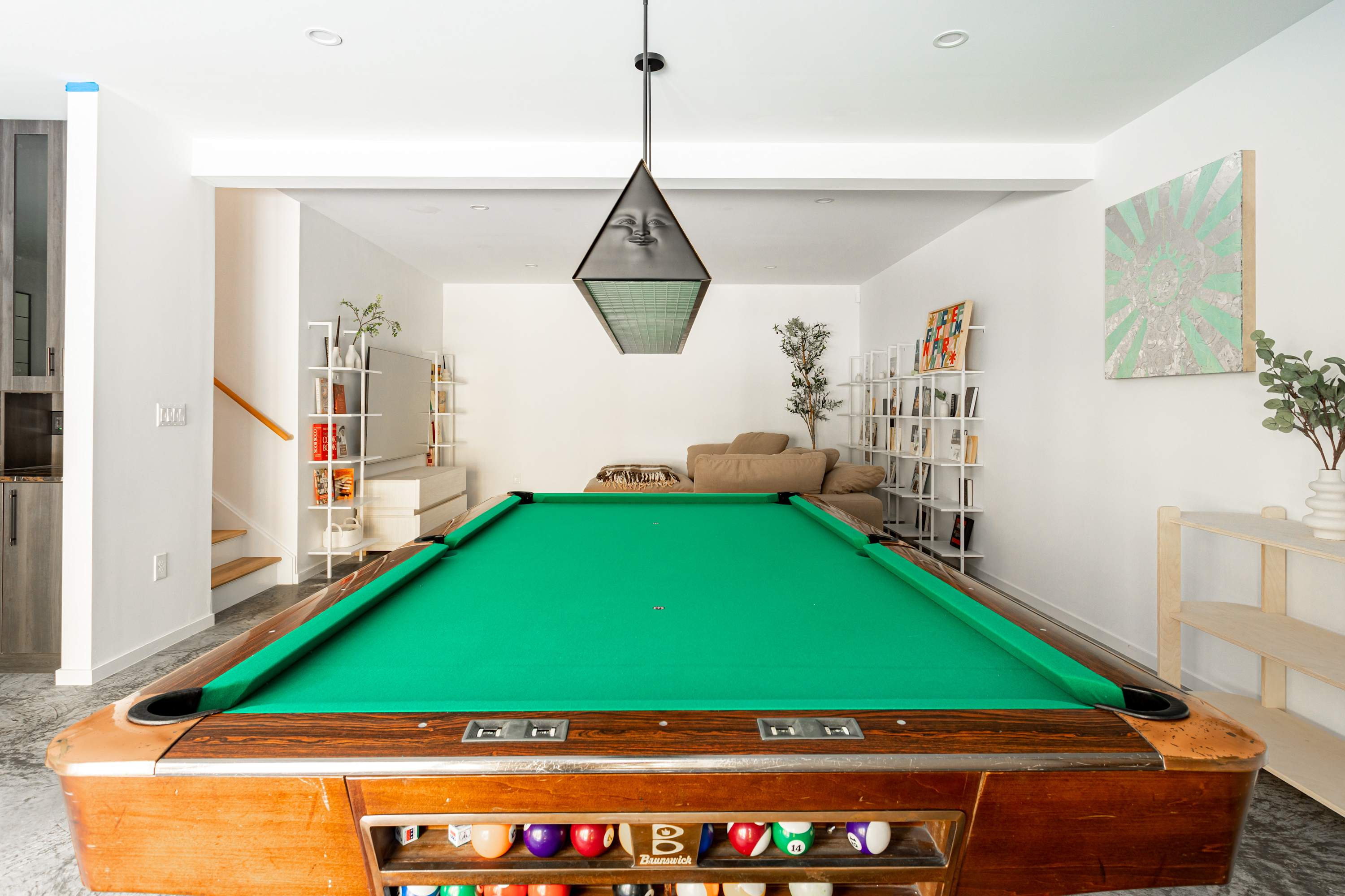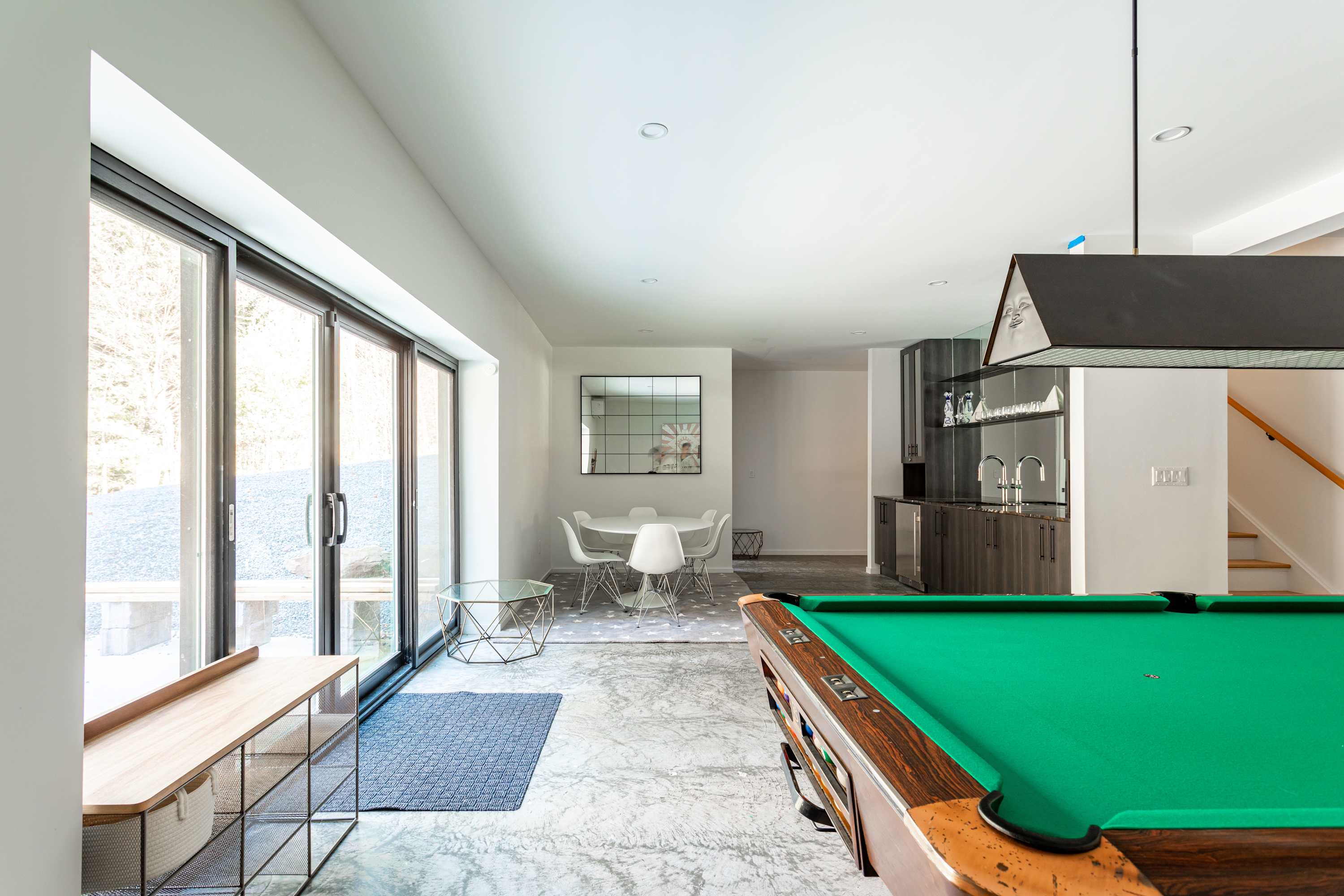 The lower-level is a cozy retreat perfect for movie nights, games night or quiet relaxation. The media lounge offers a comfy sectional couch, pool table, kitchenette, circular dining table for six and direct access to the outdoors. Also on this level is the kid’s room with 2 bunk beds and a bathroom with dual sinks and a walk-in shower.