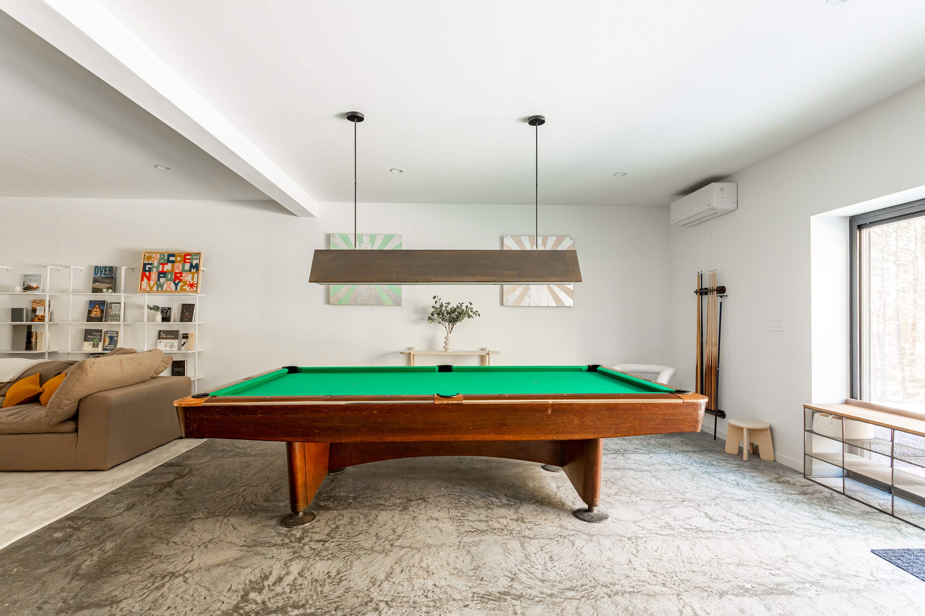Tetra A-Frame is a contemporary 4 bed, 3 bath escape just under 3 hrs from NYC & a short drive to Cochecton River Access. Featuring striking architecture, inspiring forest views, multiple workspaces, & a cozy media lounge with a pool table and kitchenette, guests can enjoy outdoor living on the expansive deck with a grill & firepit. Your forest getaway awaits!