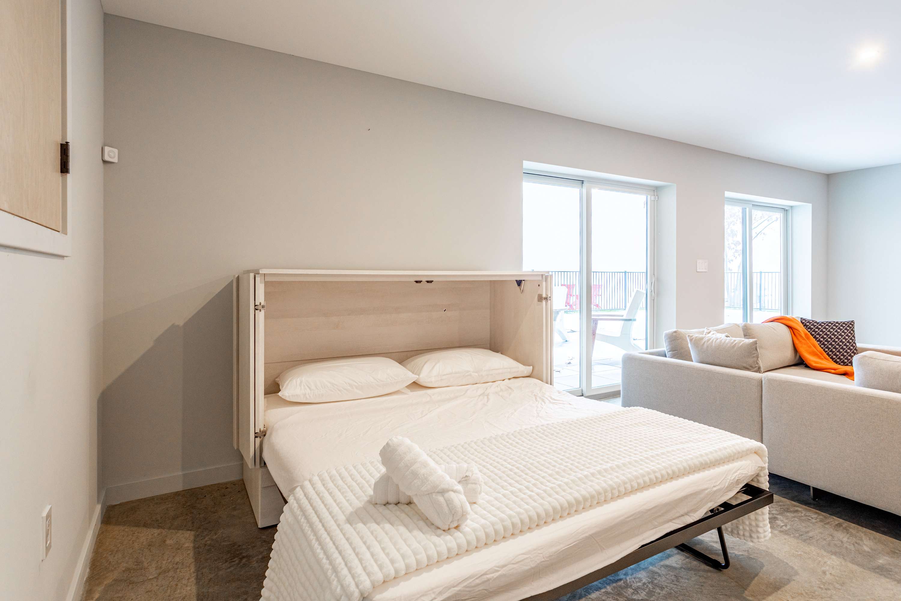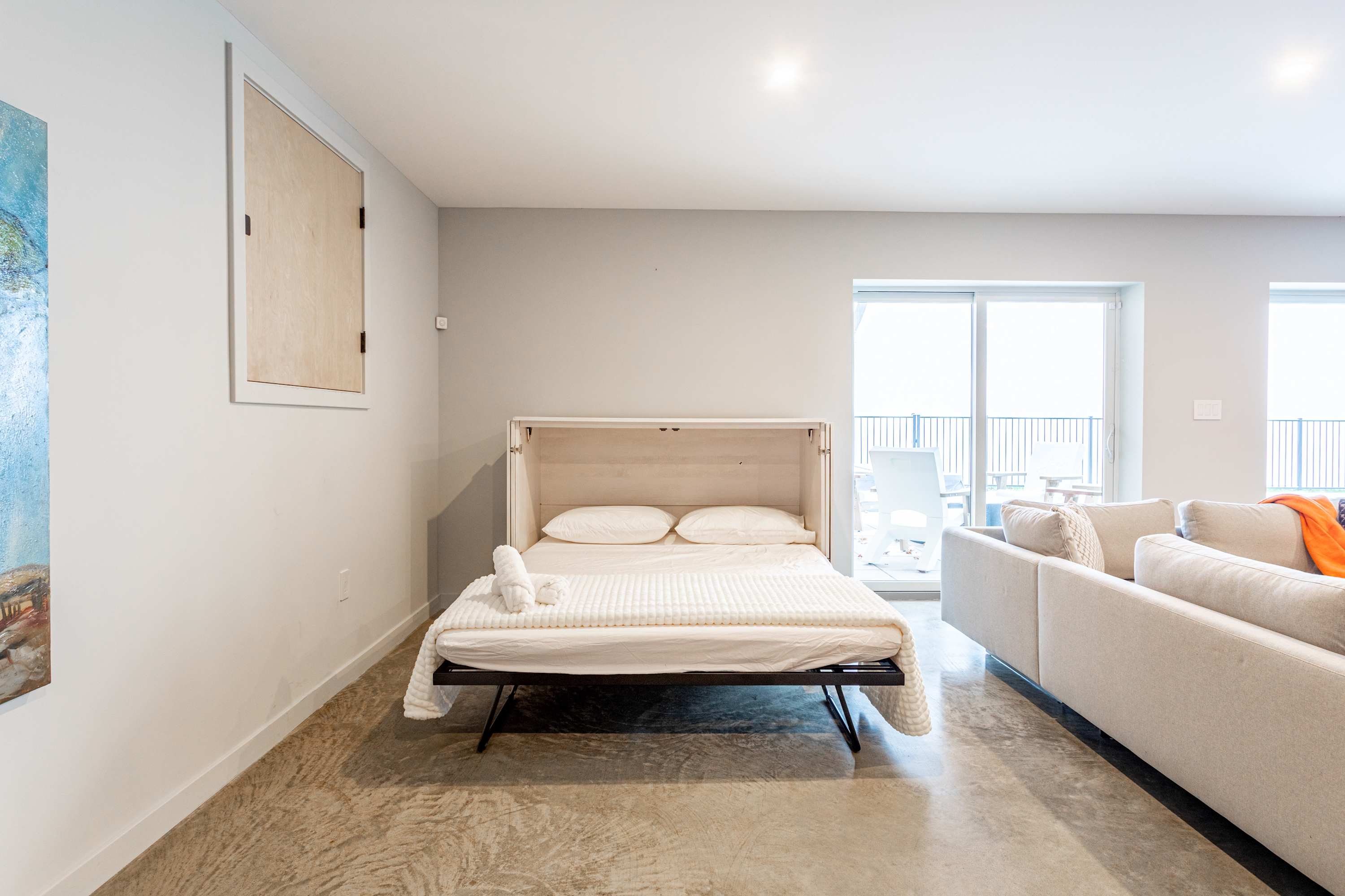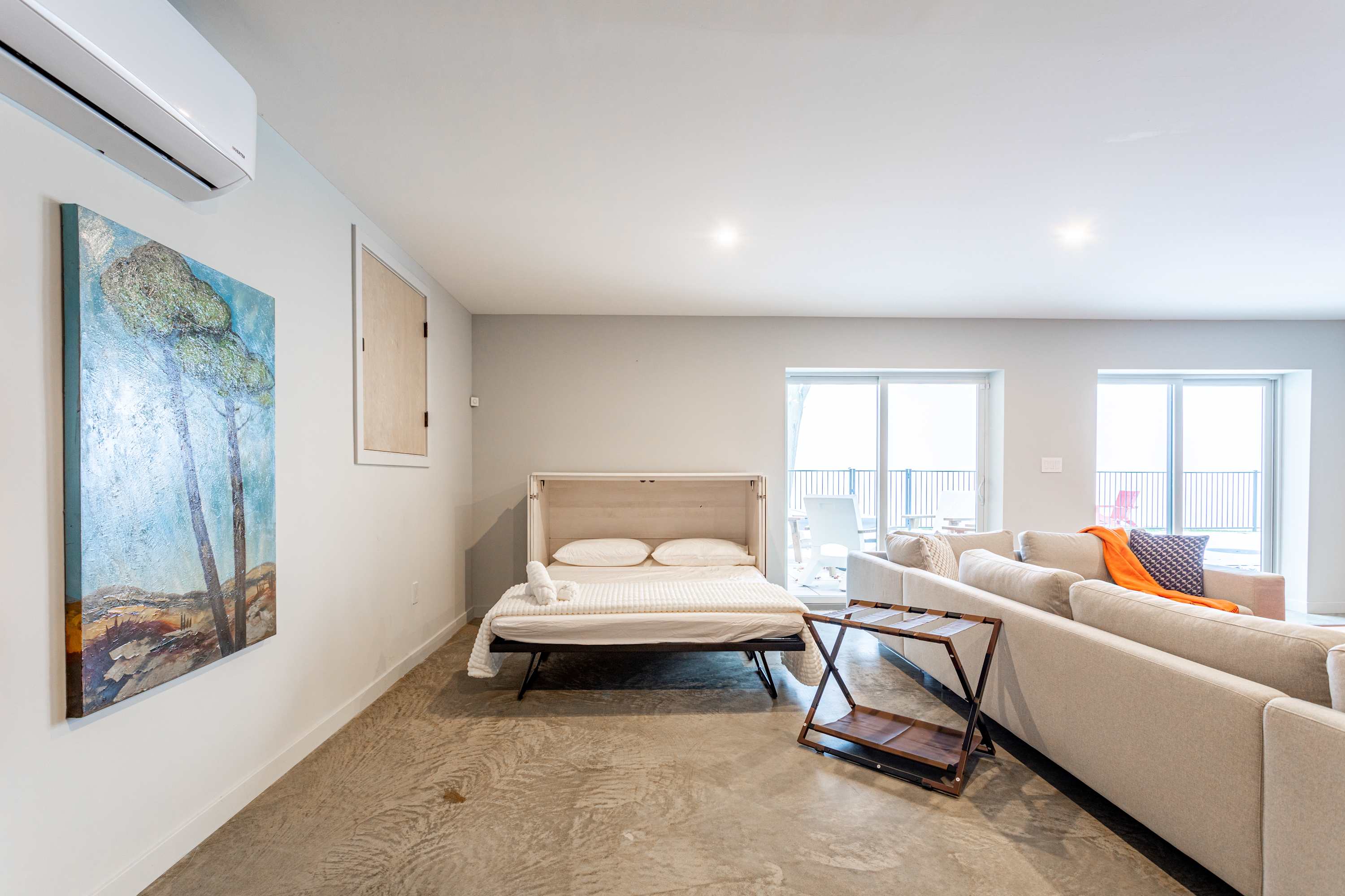 Downstairs, guests can enjoy a spacious entertainment room with an oversized sectional and event worthy big screen TV, a queen-size Murphy bed in its own dedicated hutch against the wall, and sliding doors that open directly onto a stone hardscaped patio where you'll find the pool and hot tub.