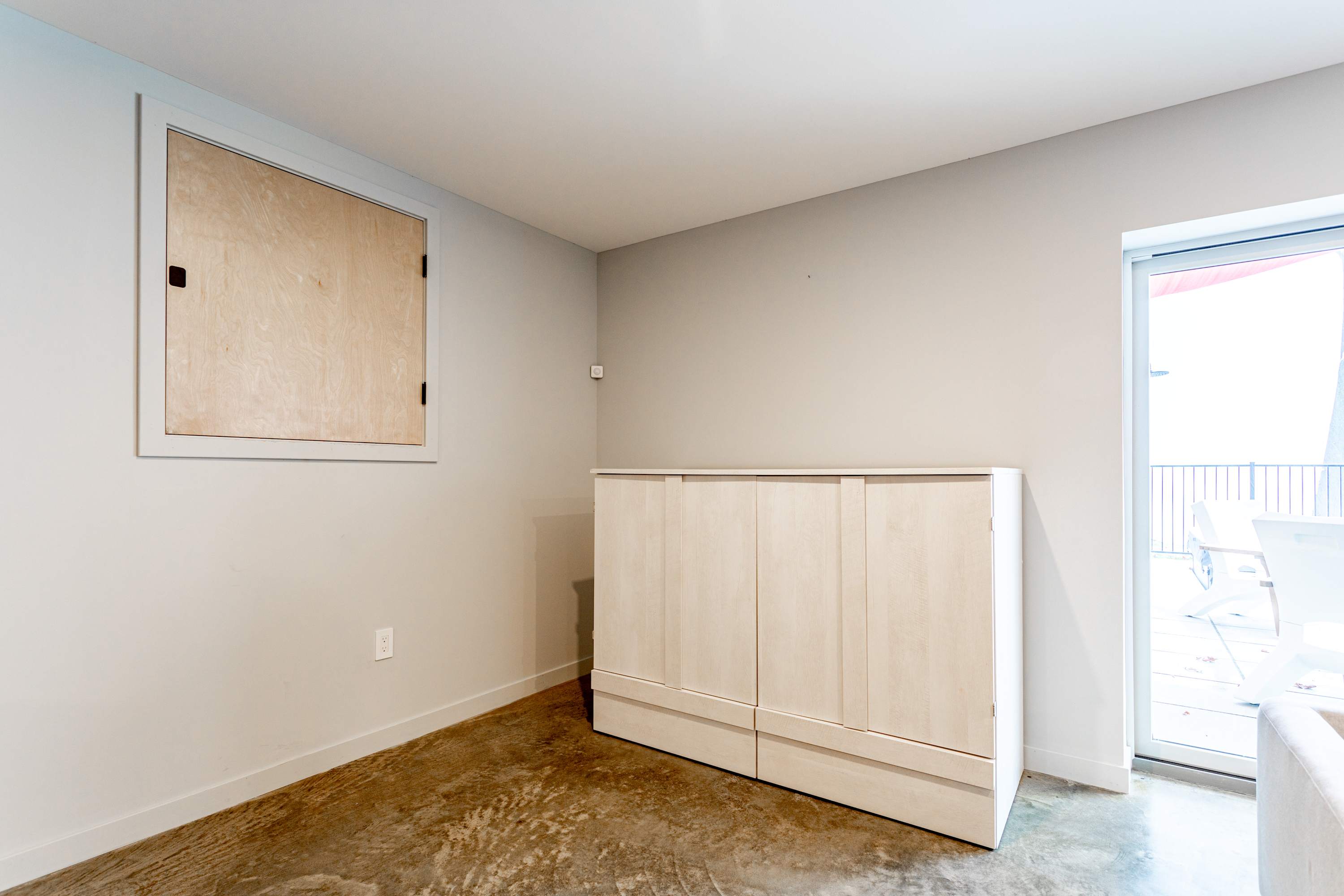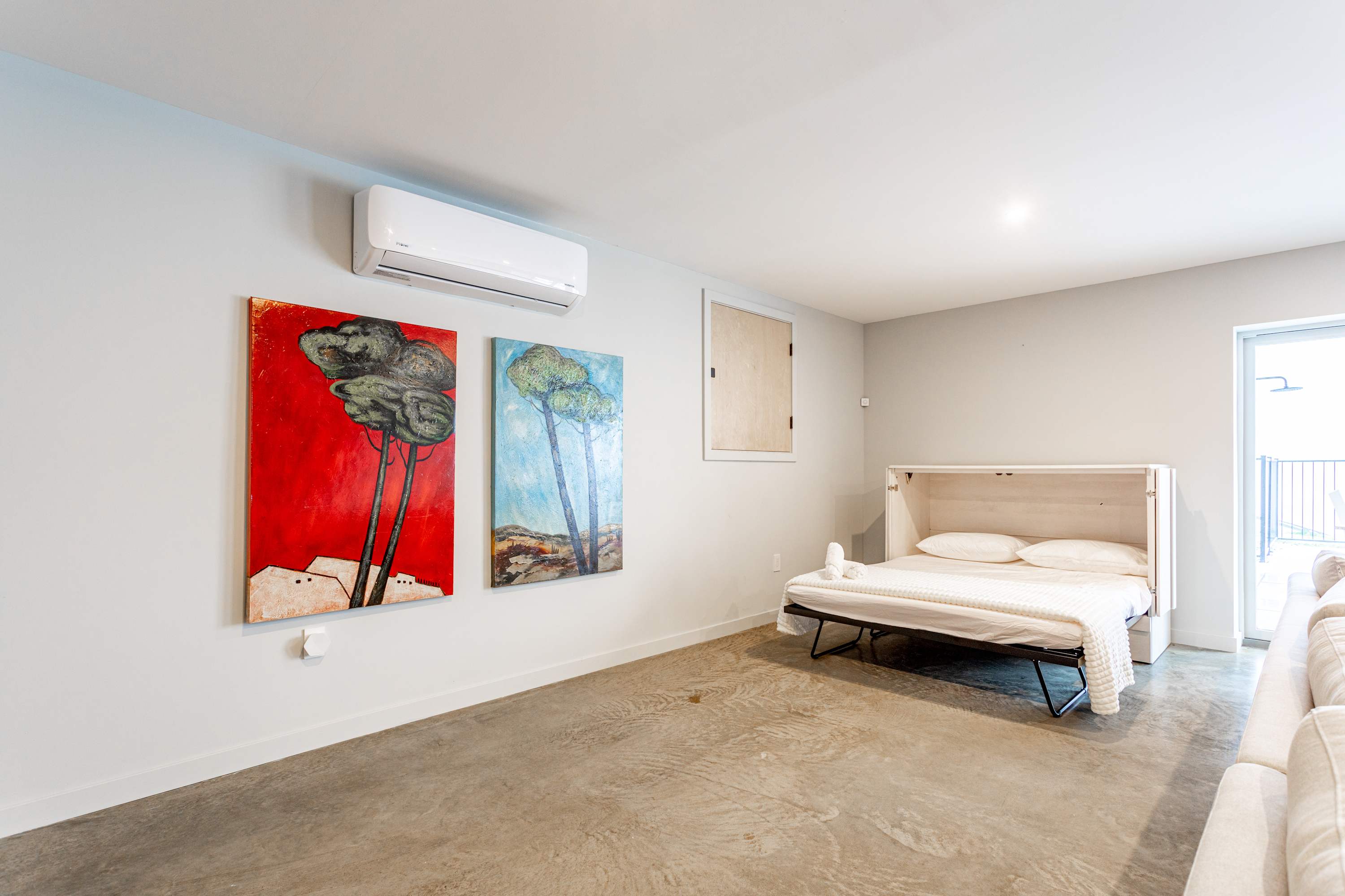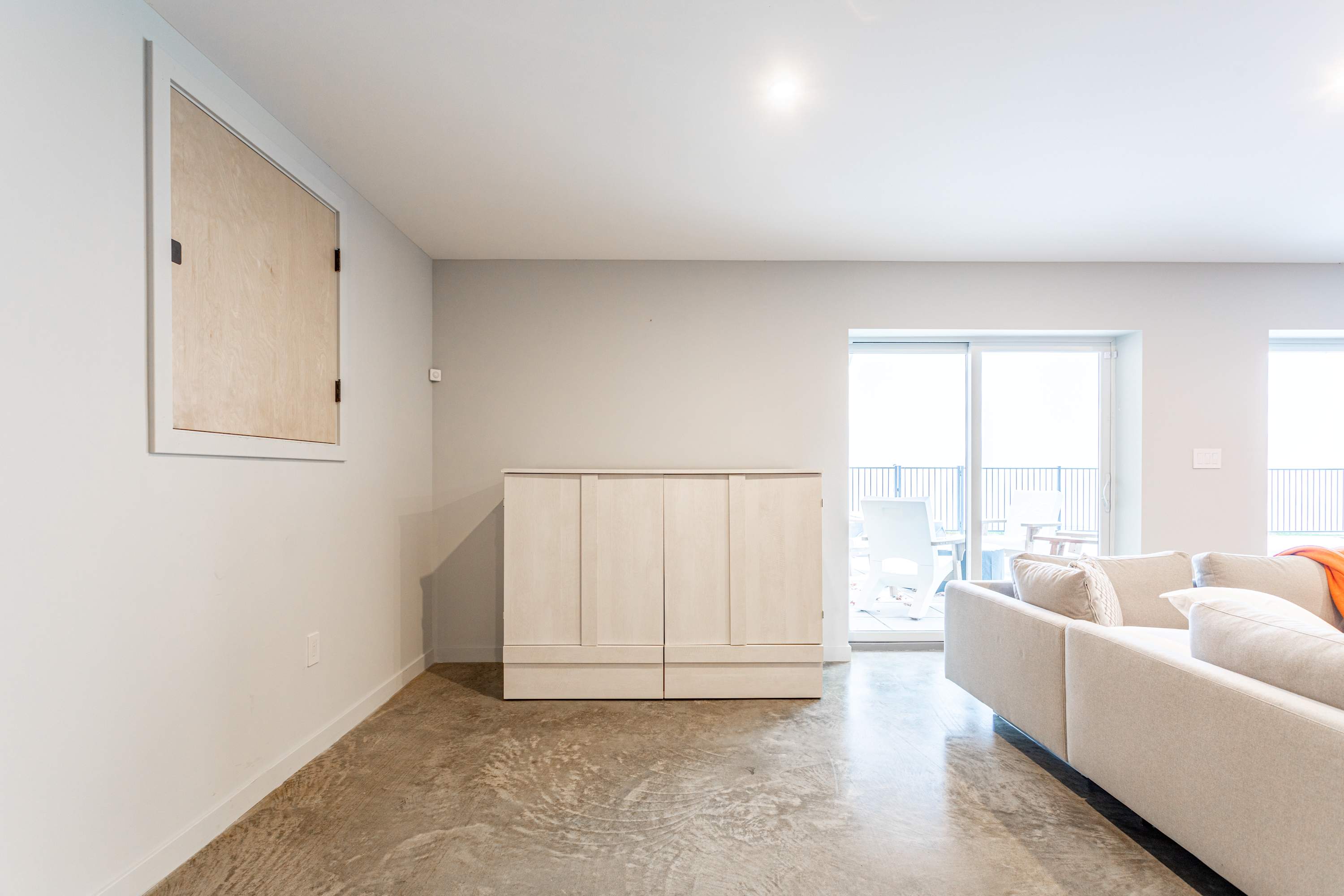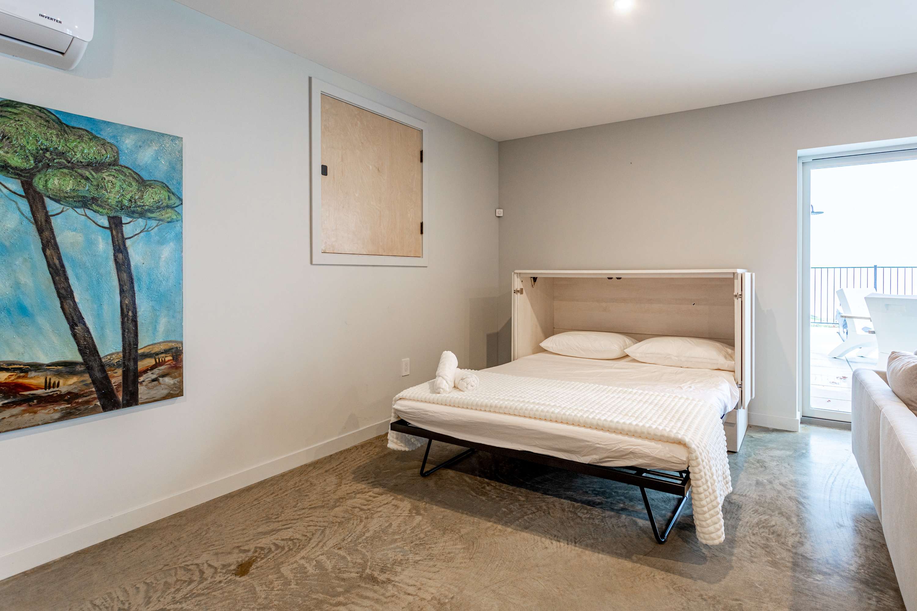 Downstairs, guests can enjoy a spacious entertainment room with an oversized sectional and event worthy big screen TV, a queen-size Murphy bed in its own dedicated hutch against the wall, and sliding doors that open directly onto a stone hardscaped patio where you'll find the pool and hot tub.
