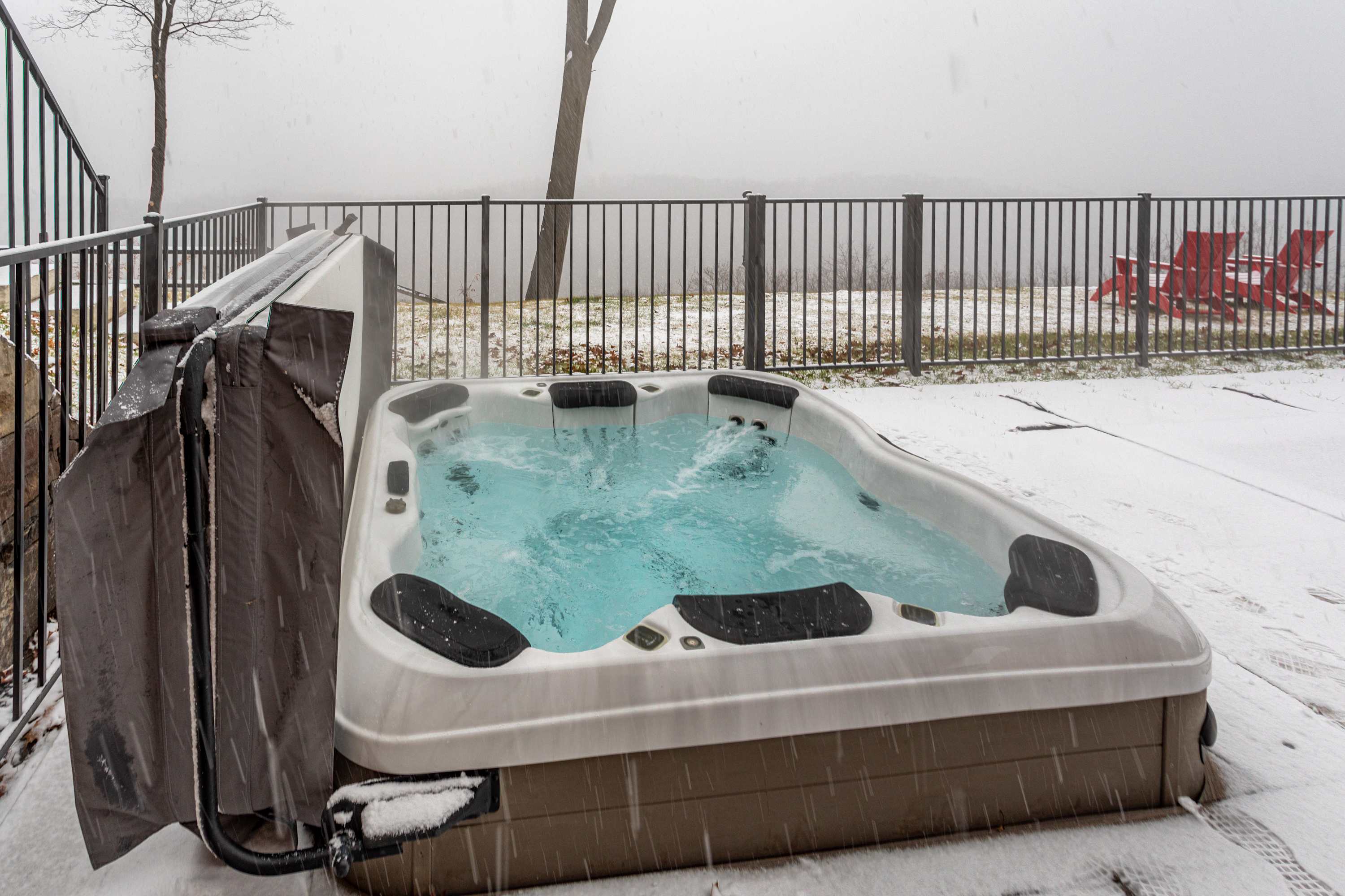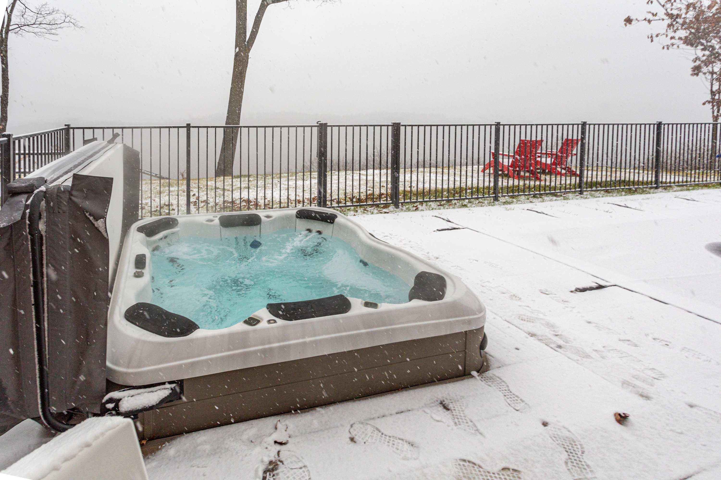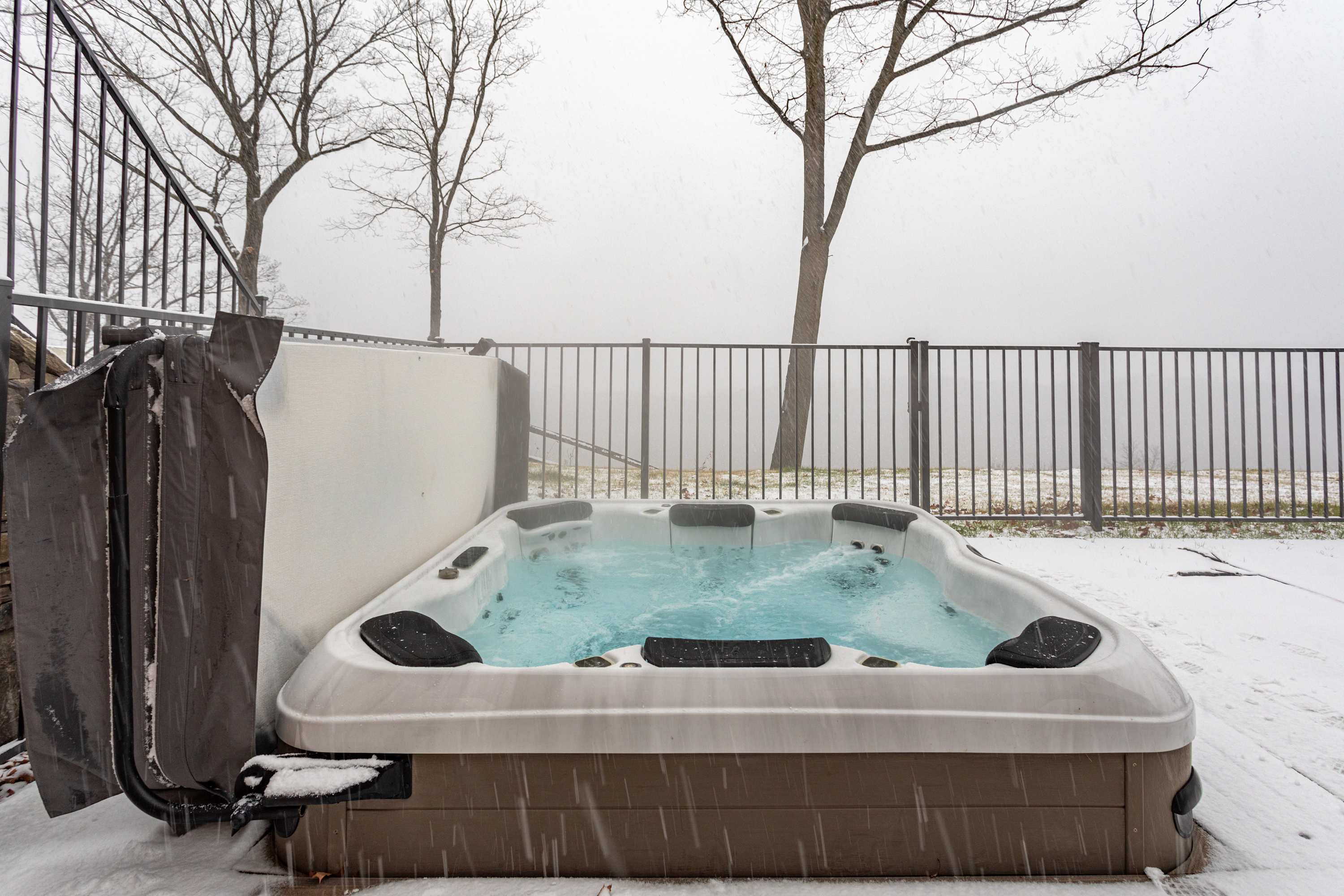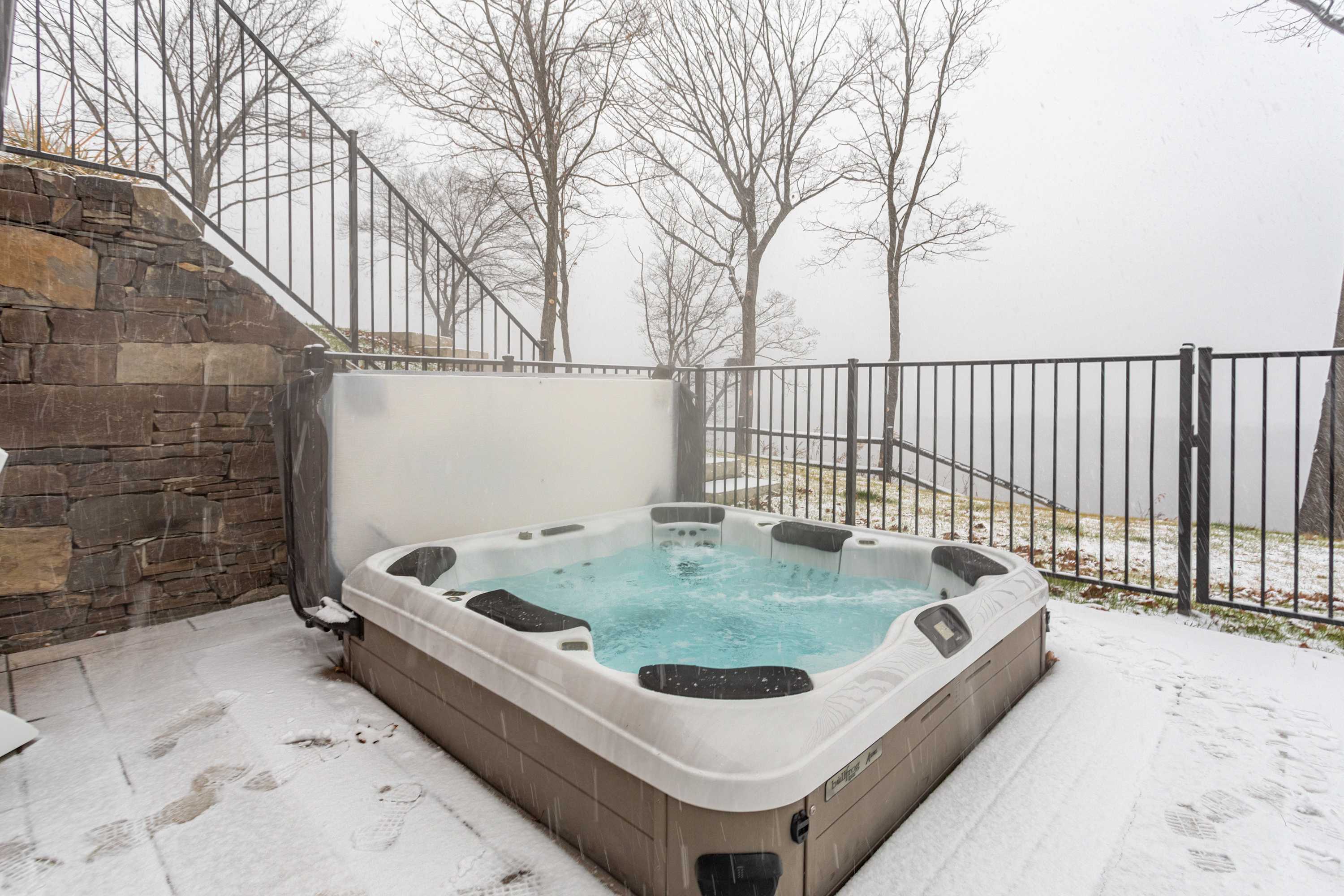 Exit the dining room to a covered deck with a dining table and grill, perfect for al fresco dining with a view. Two comfy hanging chairs make for a great lounging area, but you'll spend much your days out by the pool and hot tub - stone steps lead down to the pool deck, where you’ll find lounge chairs, an outdoor shower, and a fire pit for evening gatherings.