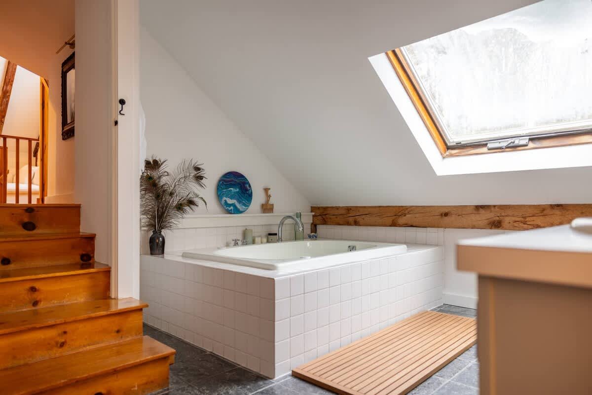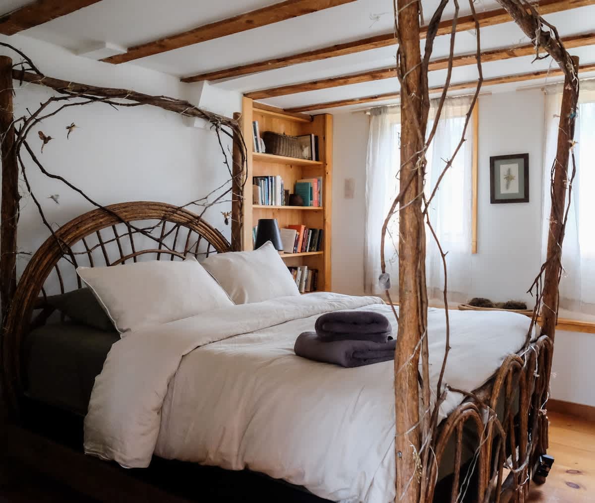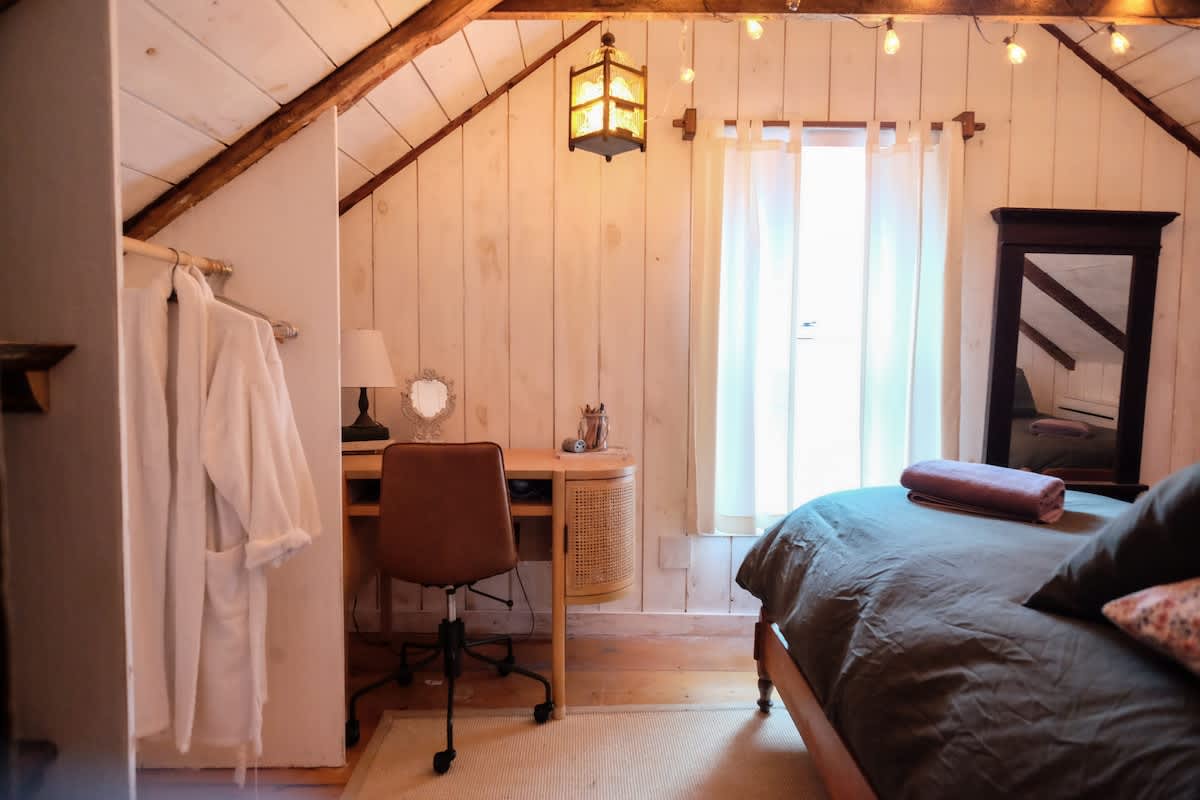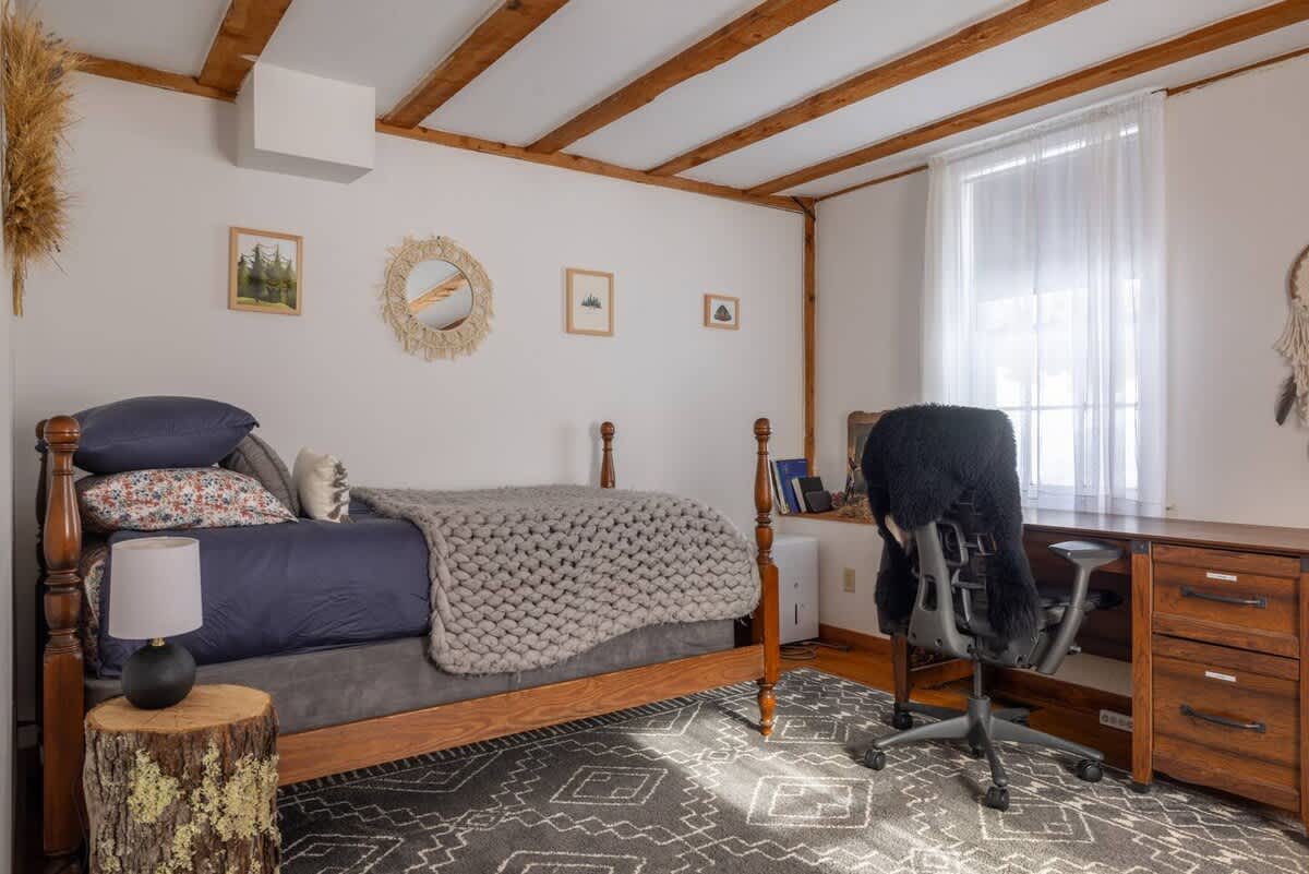 The house features four bedrooms: (upstairs) bedroom 1: king with ensuite bathroom, bedroom 2: two twins (upstairs) bedroom 3: queen, bedroom 4: one twin, two full bathrooms (one upstairs, one downstairs), a fully stocked, open-concept kitchen with stove, oven, toaster, drip coffee maker, wood burning fireplace, curated farmhouse decor, Starlink WiFi, TV, Marshall blue tooth speaker, record player, dedicated workspace, soaking tub, Public Goods products, yoga mats, selected literary works, and countless cozy nooks to read, draw, and relax!