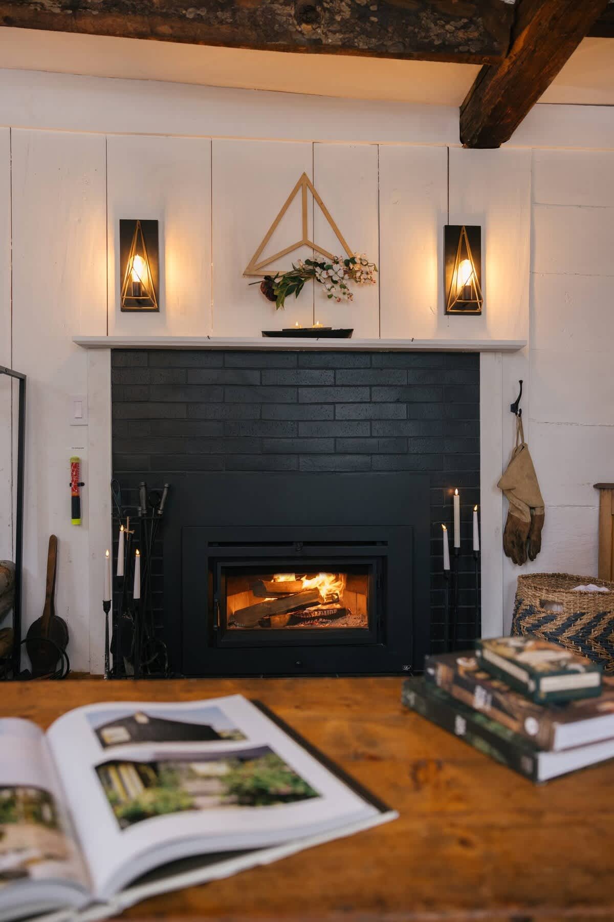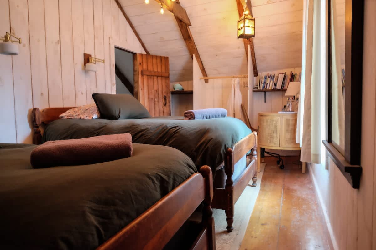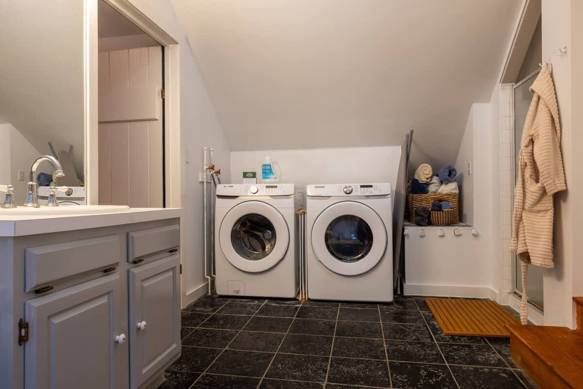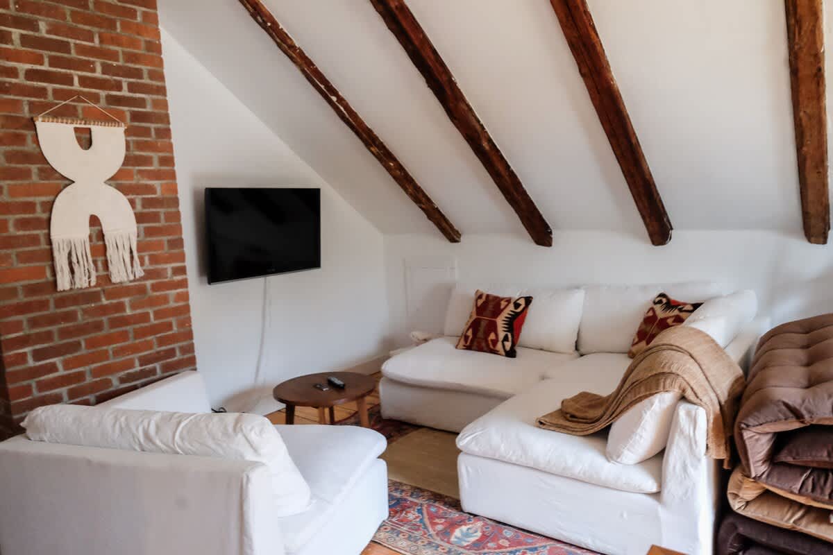 The house features four bedrooms: (upstairs) bedroom 1: king with ensuite bathroom, bedroom 2: two twins (upstairs) bedroom 3: queen, bedroom 4: one twin, two full bathrooms (one upstairs, one downstairs), a fully stocked, open-concept kitchen with stove, oven, toaster, drip coffee maker, wood burning fireplace, curated farmhouse decor, Starlink WiFi, TV, Marshall blue tooth speaker, record player, dedicated workspace, soaking tub, Public Goods products, yoga mats, selected literary works, and countless cozy nooks to read, draw, and relax!