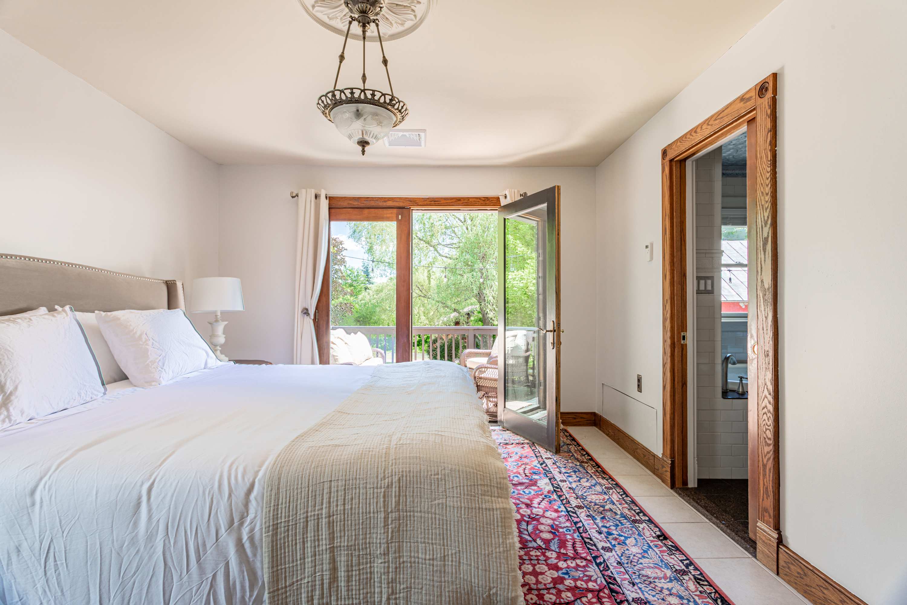 The backyard is set up for year-round enjoyment with a hot tub, fire pit, and a deck equipped with a grill, outdoor seating, and dining space. During the summer season, the on-site barn with a second floor yoga room plus fairy lights is available for events, workshops and retreats, offering a unique bonus space for gatherings.