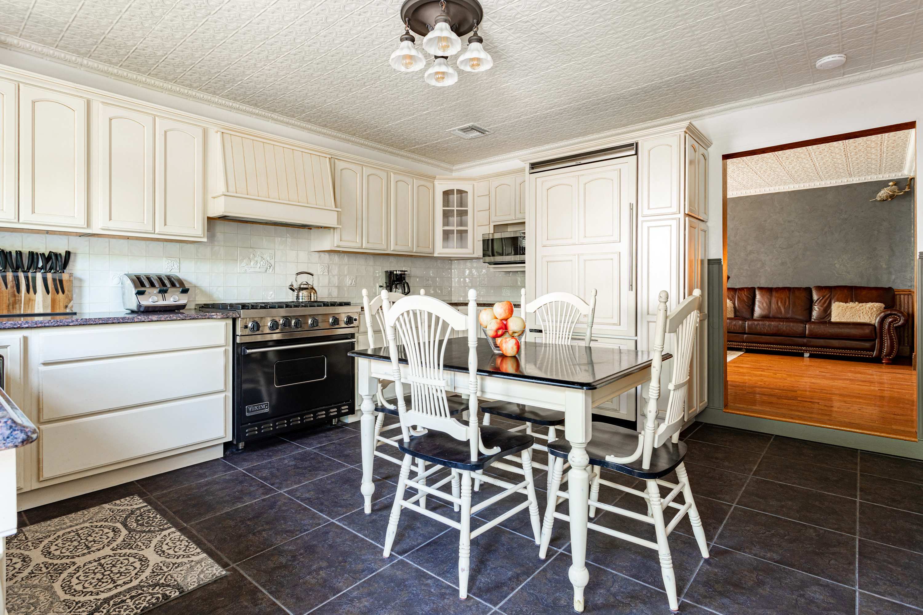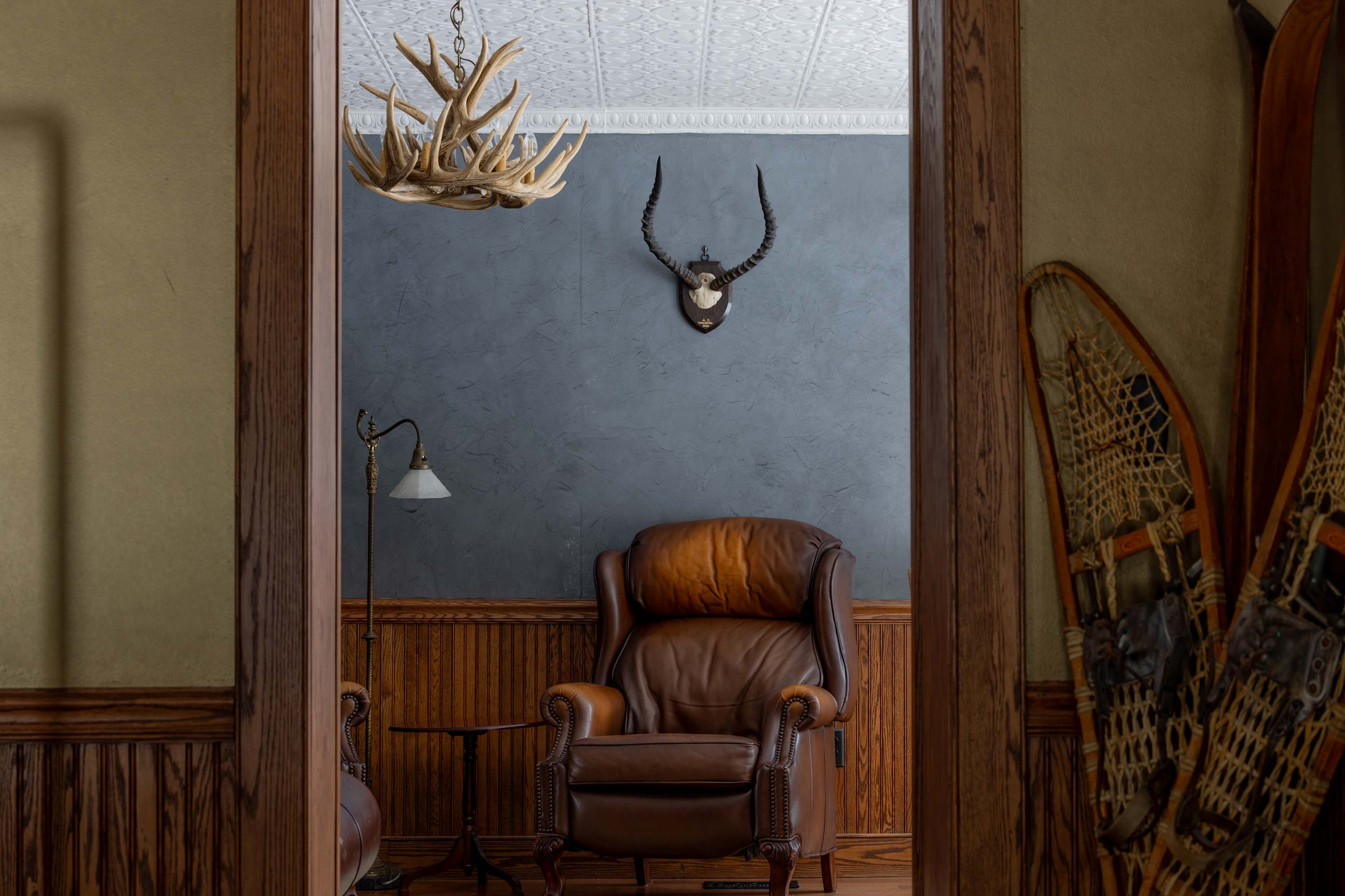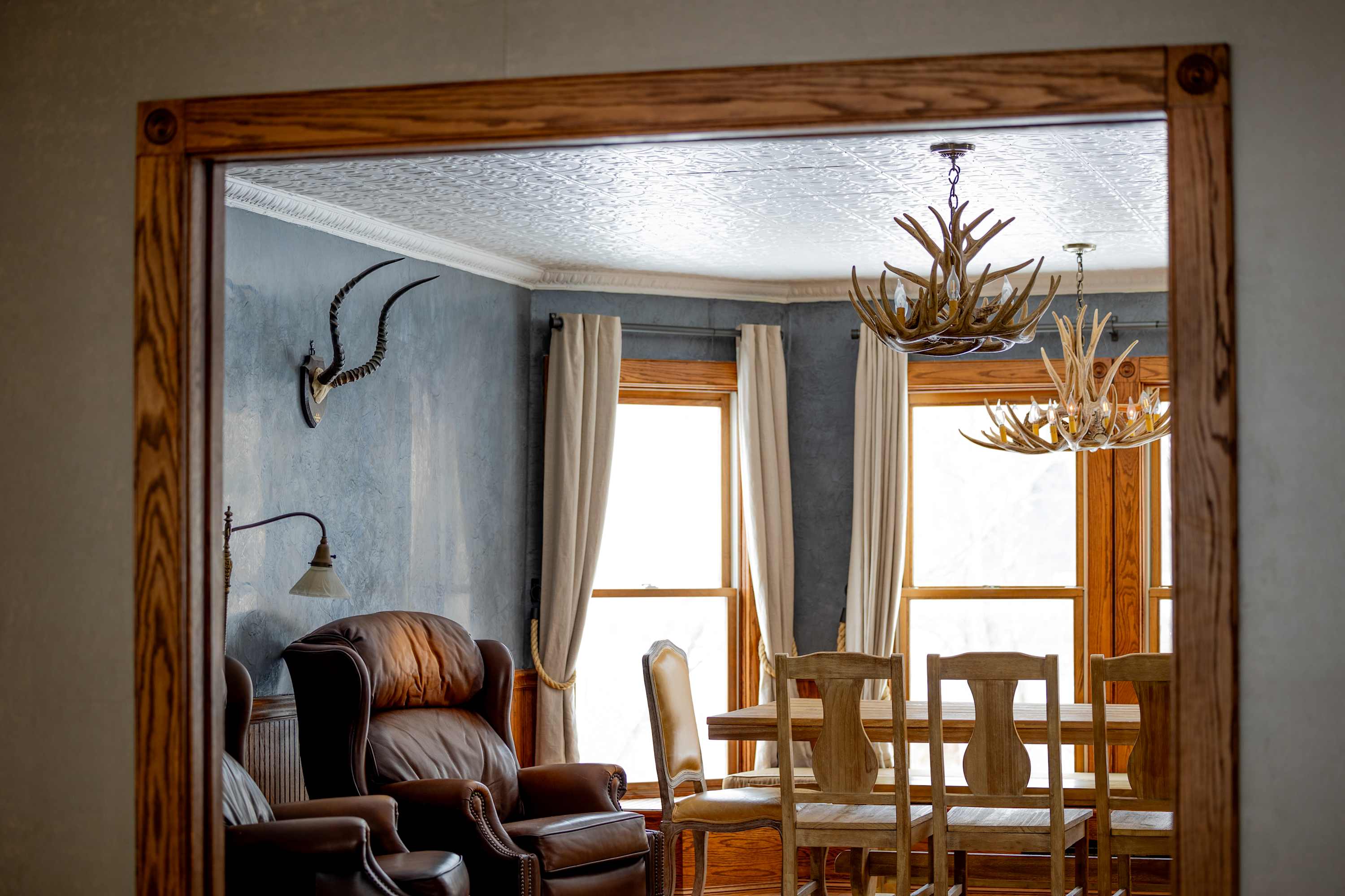 The main floor features a vintage industrial library style office with an antique desk ideal for focused work or reading. To the right is an oversized mudroom/coat room with plenty of space for all of your ski gear. Beyond the mudroom, a bright living room offers a retro inspired media console, a TV, cozy seating options and an armoire stocked with games. This space flows into a formal dining room with expansive windows, a large dining table and banquet for your group or enjoying family moments. The spacious chef’s kitchen boasts Viking appliances, classic white cabinetry, a dining table for four and direct access to the outdoor deck with additional seating and outdoor dining.