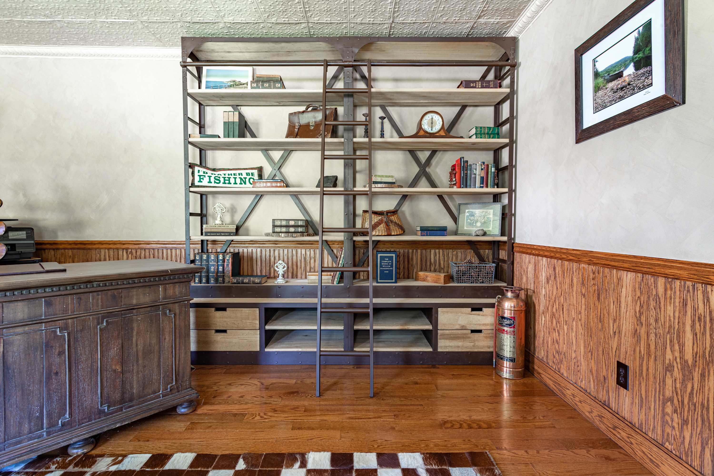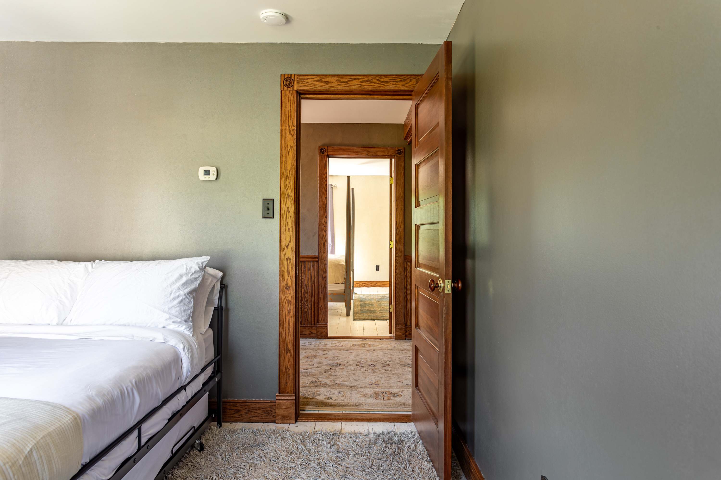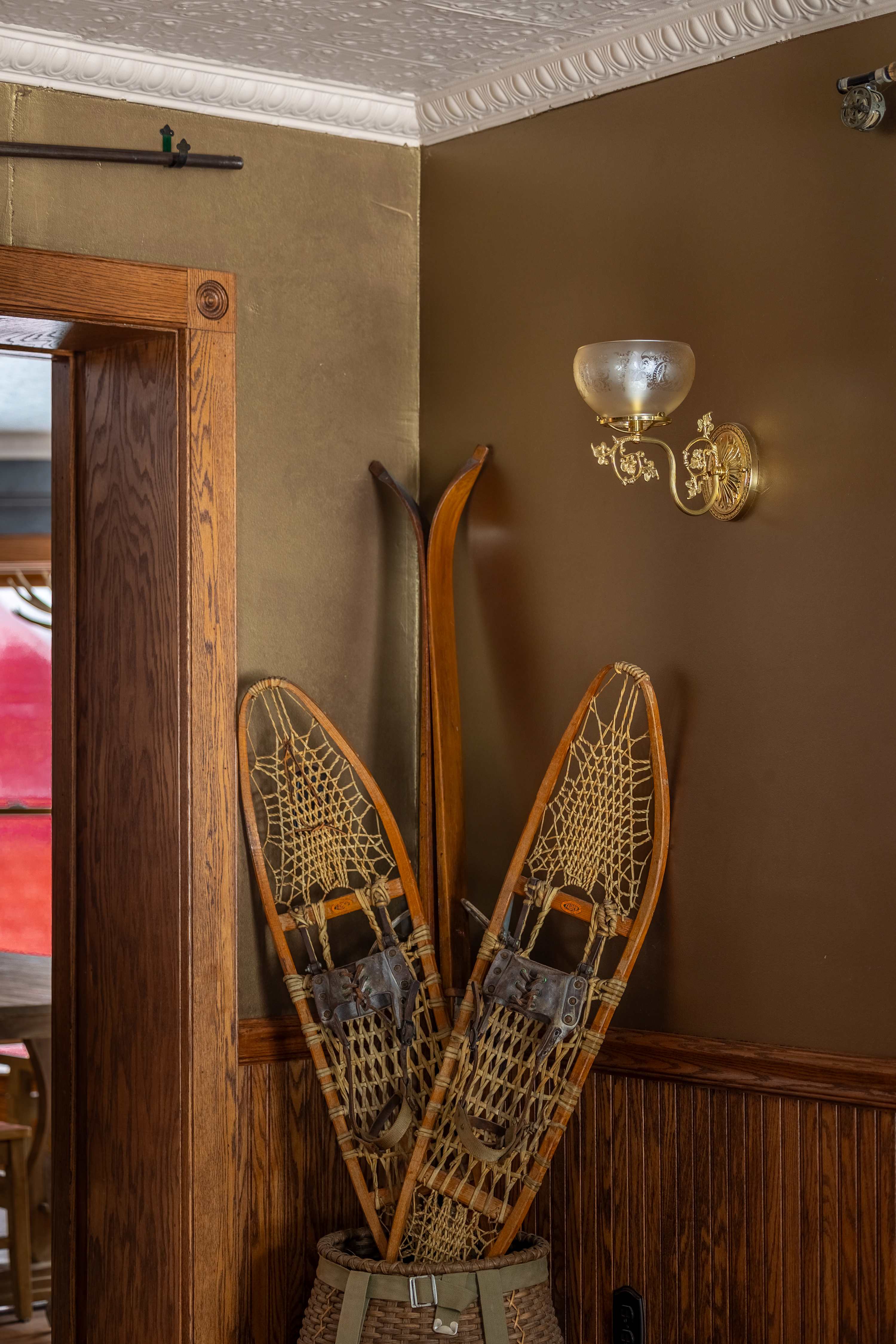 The main floor features a vintage industrial library style office with an antique desk ideal for focused work or reading. To the right is an oversized mudroom/coat room with plenty of space for all of your ski gear. Beyond the mudroom, a bright living room offers a retro inspired media console, a TV, cozy seating options and an armoire stocked with games. This space flows into a formal dining room with expansive windows, a large dining table and banquet for your group or enjoying family moments. The spacious chef’s kitchen boasts Viking appliances, classic white cabinetry, a dining table for four and direct access to the outdoor deck with additional seating and outdoor dining.