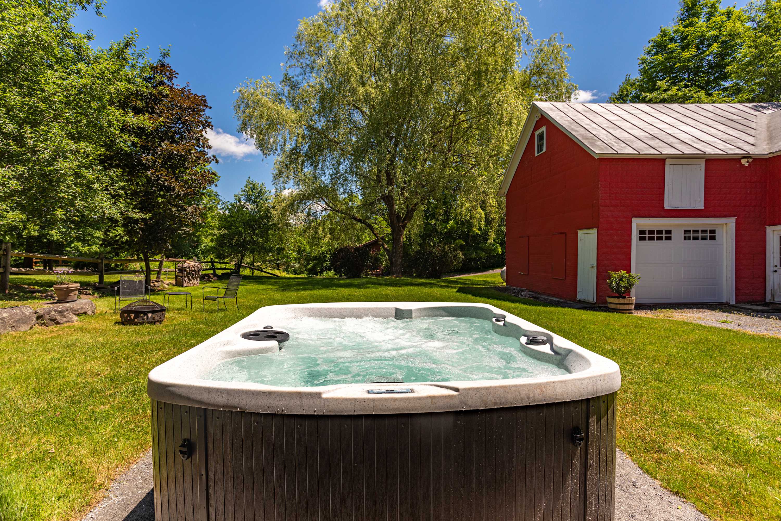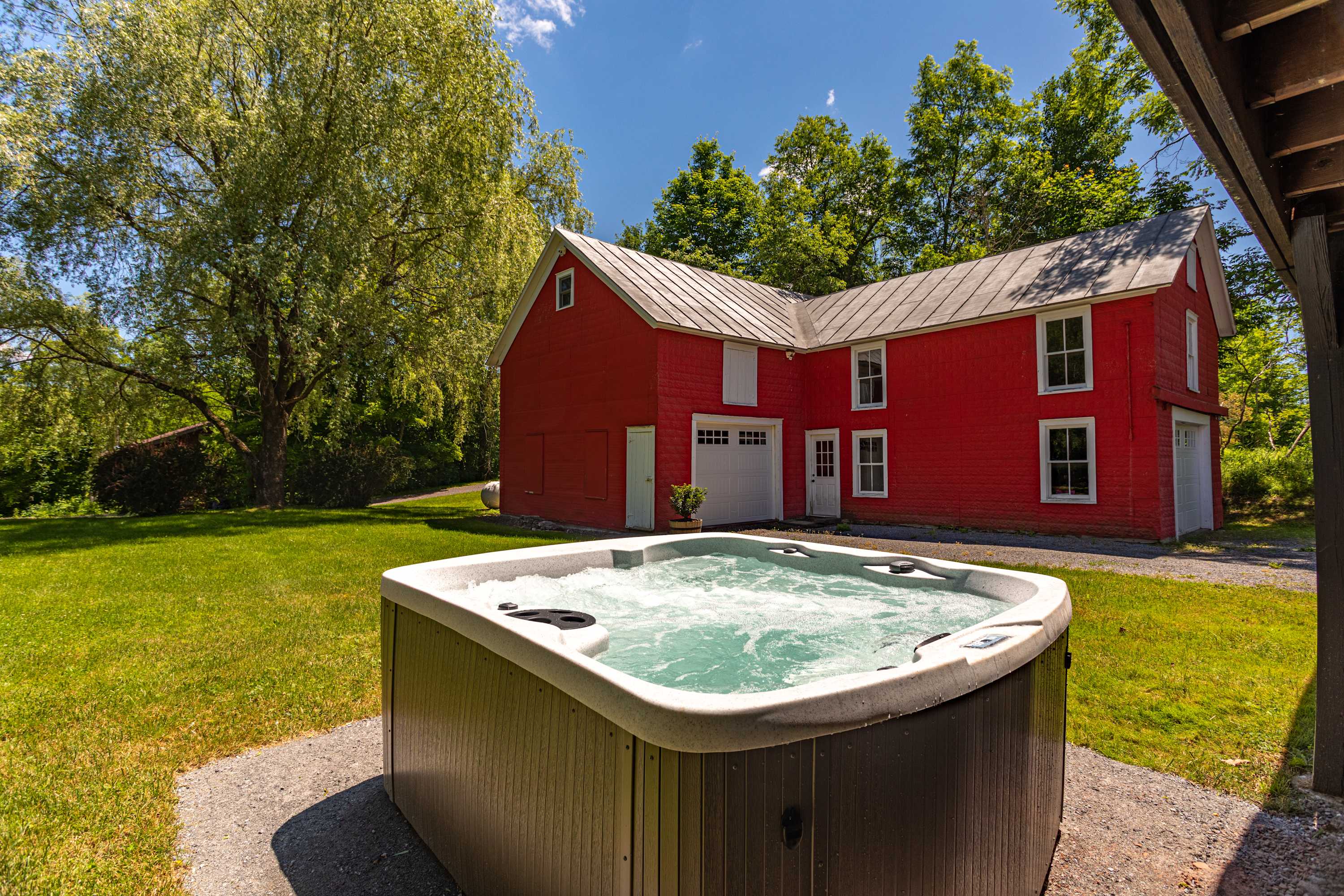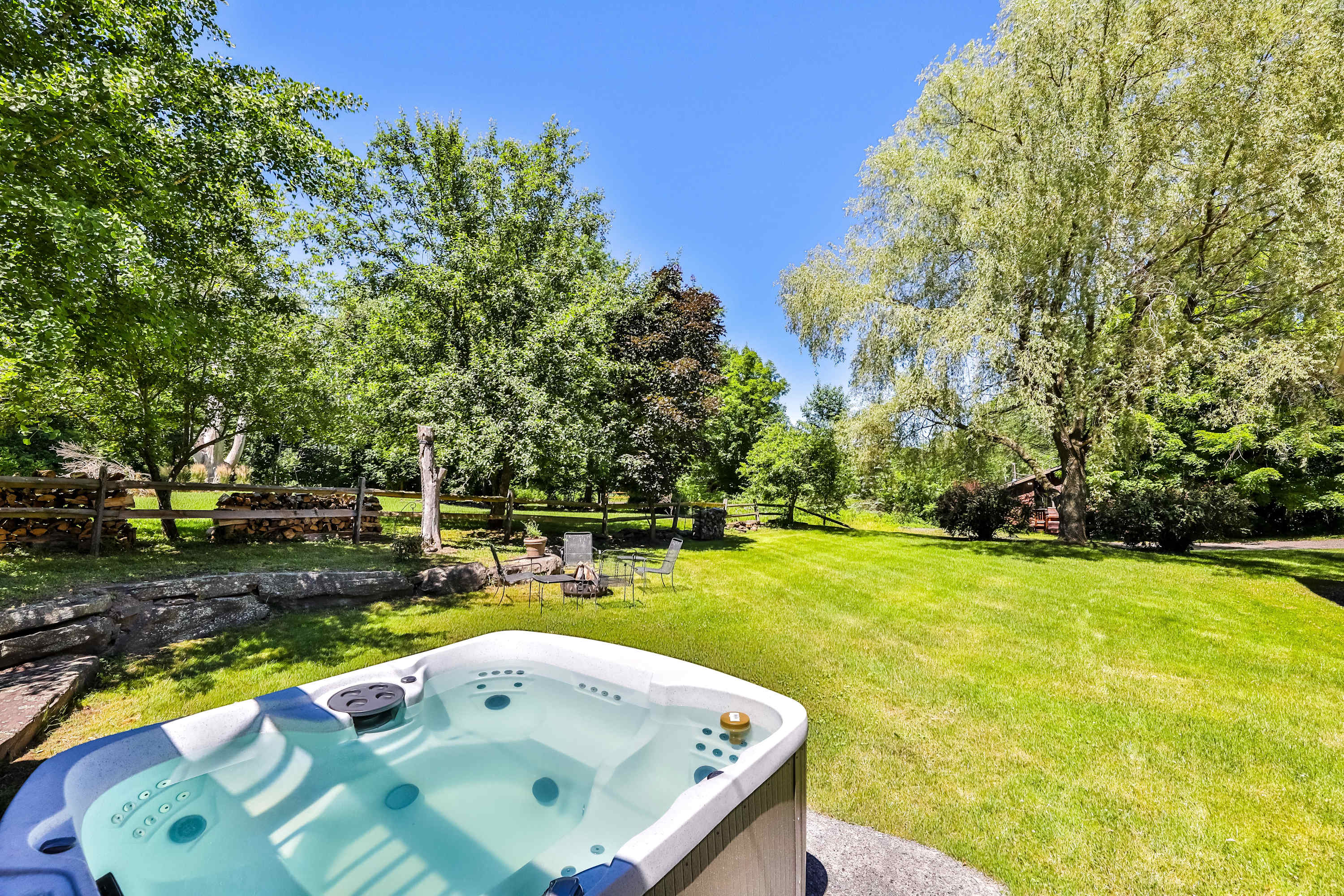 The backyard is set up for year-round enjoyment with a hot tub, fire pit, and a deck equipped with a grill, outdoor seating, and dining space. During the summer season, the on-site barn with a second floor yoga room plus fairy lights is available for events, workshops and retreats, offering a unique bonus space for gatherings.