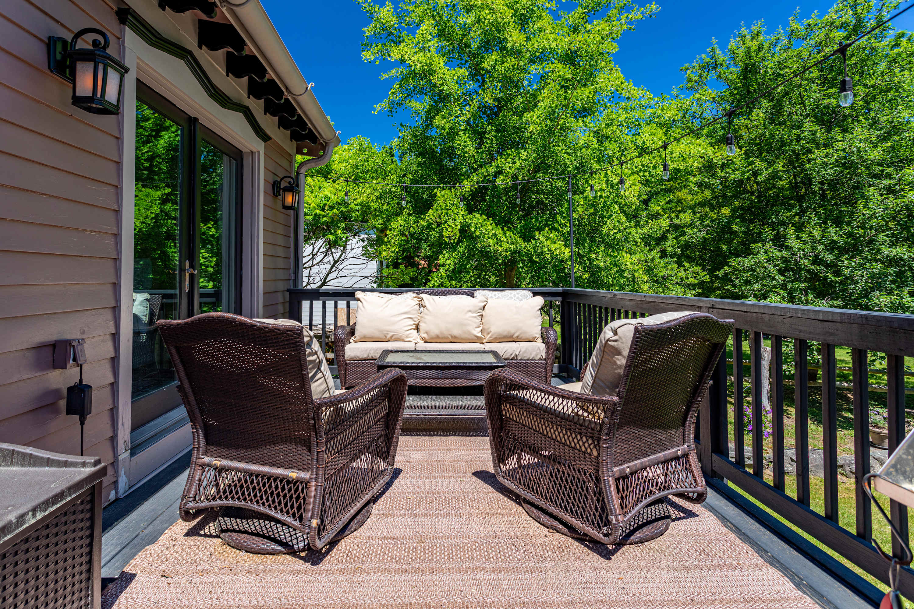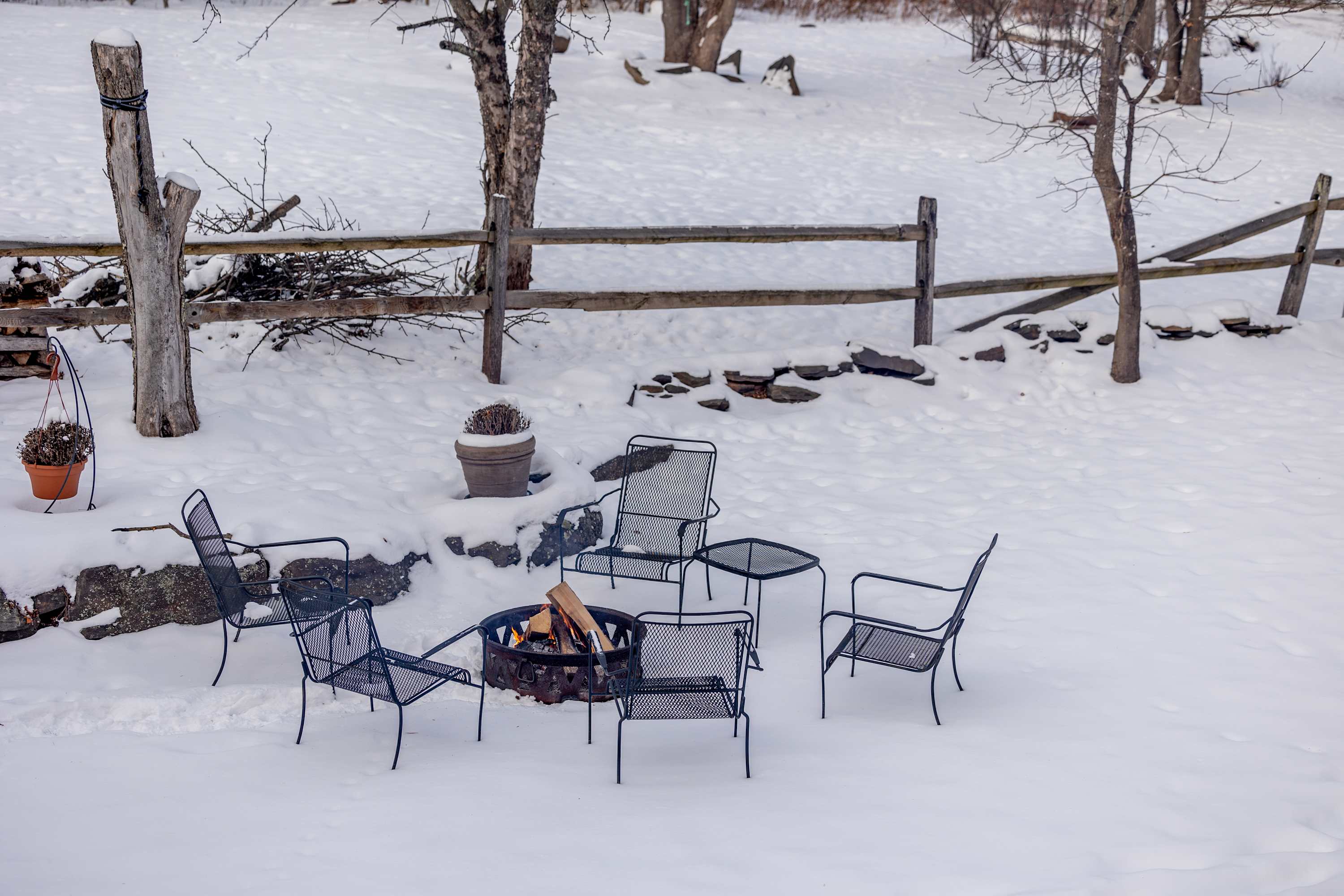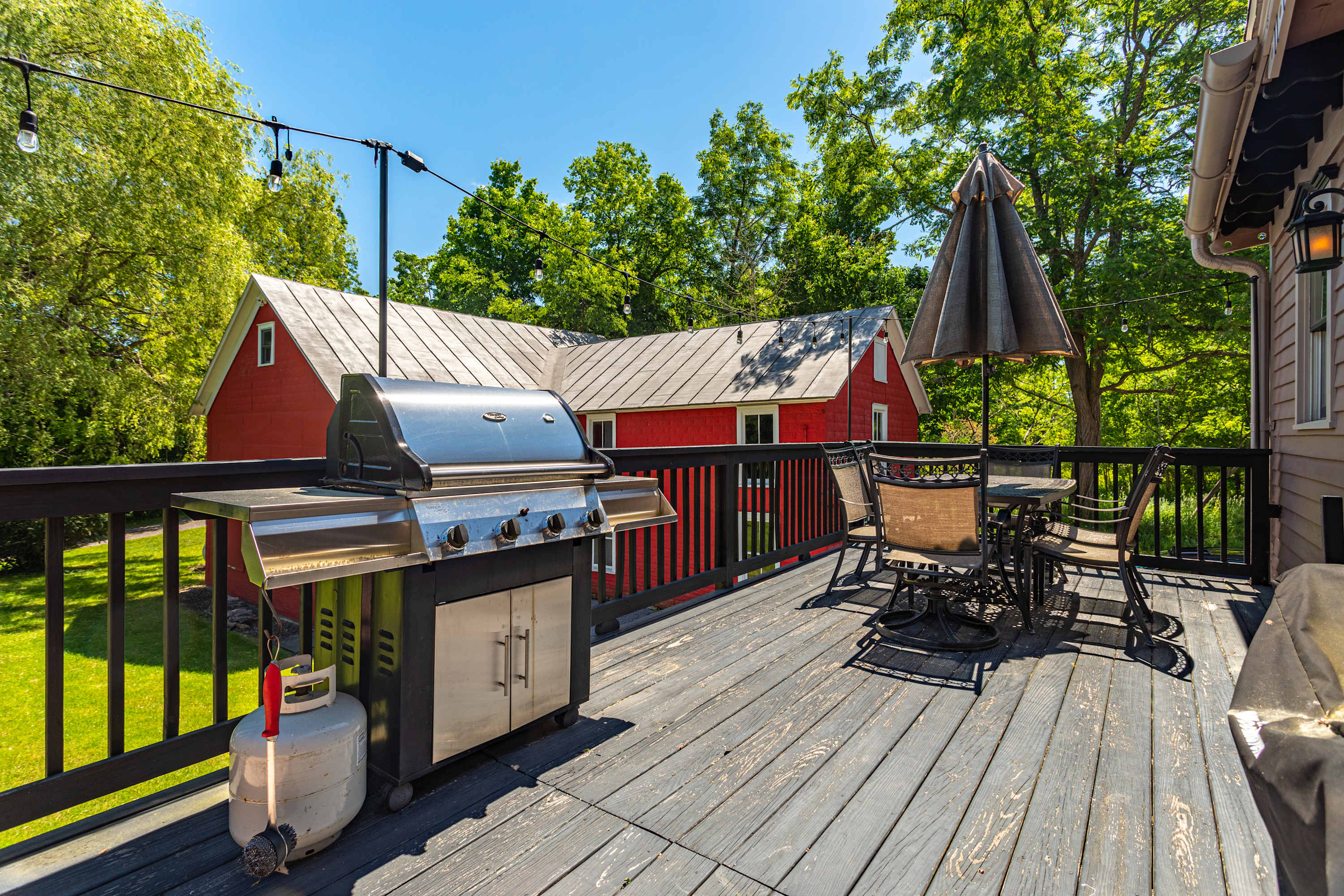 The backyard is set up for year-round enjoyment with a hot tub, fire pit, and a deck equipped with a grill, outdoor seating, and dining space. During the summer season, the on-site barn with a second floor yoga room plus fairy lights is available for events, workshops and retreats, offering a unique bonus space for gatherings.