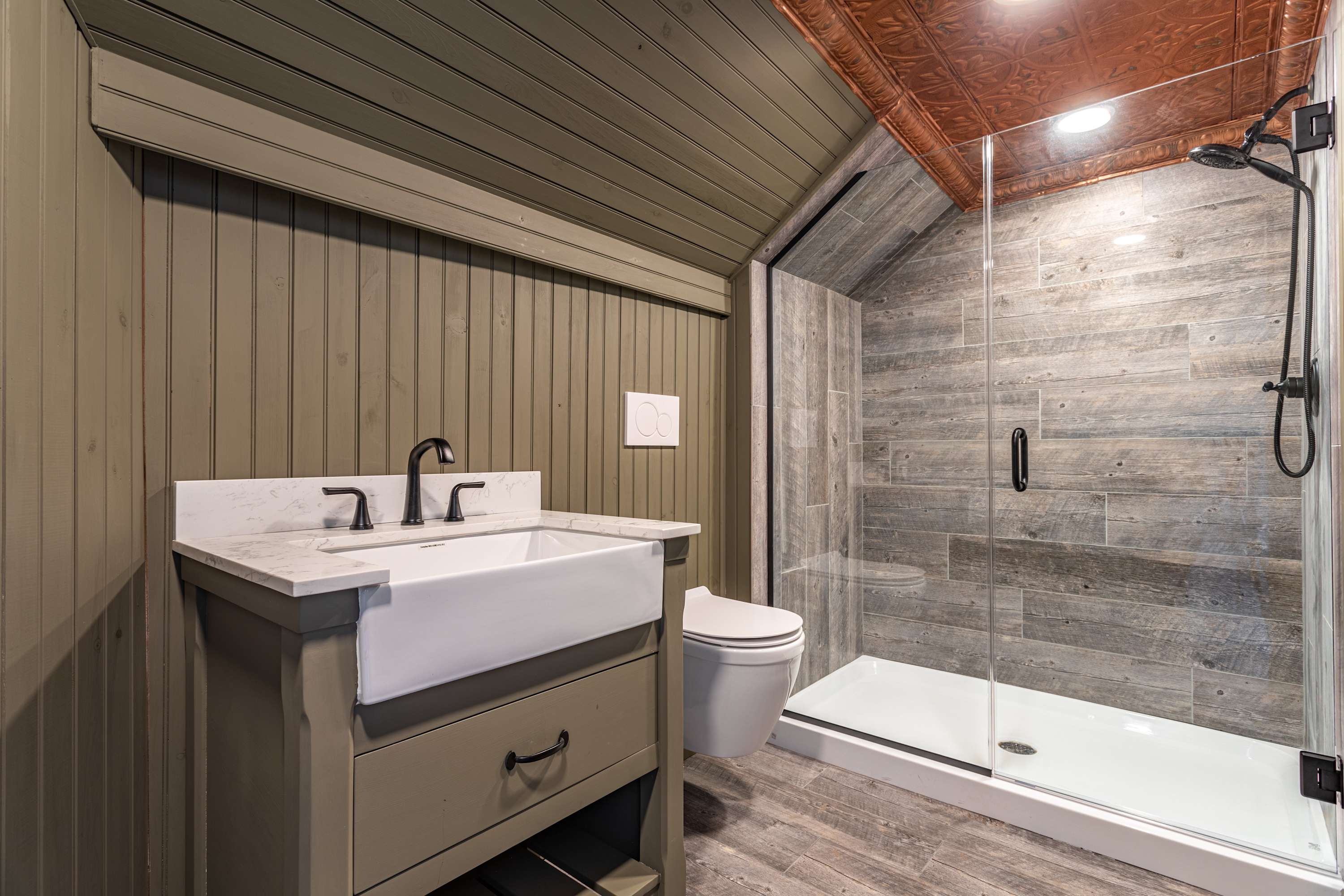 On the main floor, the primary bedroom features a king size bed, an en-suite bathroom with a separate tub and shower plus direct access to the outdoor deck. Four guest bedrooms are located upstairs on the second floor. The first guest bedroom presents a king size bed and an en-suite bathroom with a walk-in shower, the second and third bedrooms each feature a queen size bed and en-suite bathroom with a walk-in shower while the fourth bedroom includes a full bed with a twin trundle and has access to the jack and jill bathroom shared with the third guest bedroom. The third floor offers two more guest bedrooms both with en-suite bathrooms with a walk-in shower. One bedroom includes a queen size bed while the other presents two twin beds. This floor also provides a laundry area for guests.