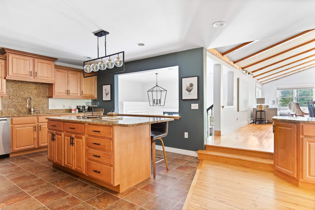 The gourmet kitchen is outfitted with a brand-new suite of stainless steel appliances – including a fully stocked coffee station (stocked with coffee, tea, sugar and creamers) and waffle bar for the kids (with genuine real VT maple syrup, of course).