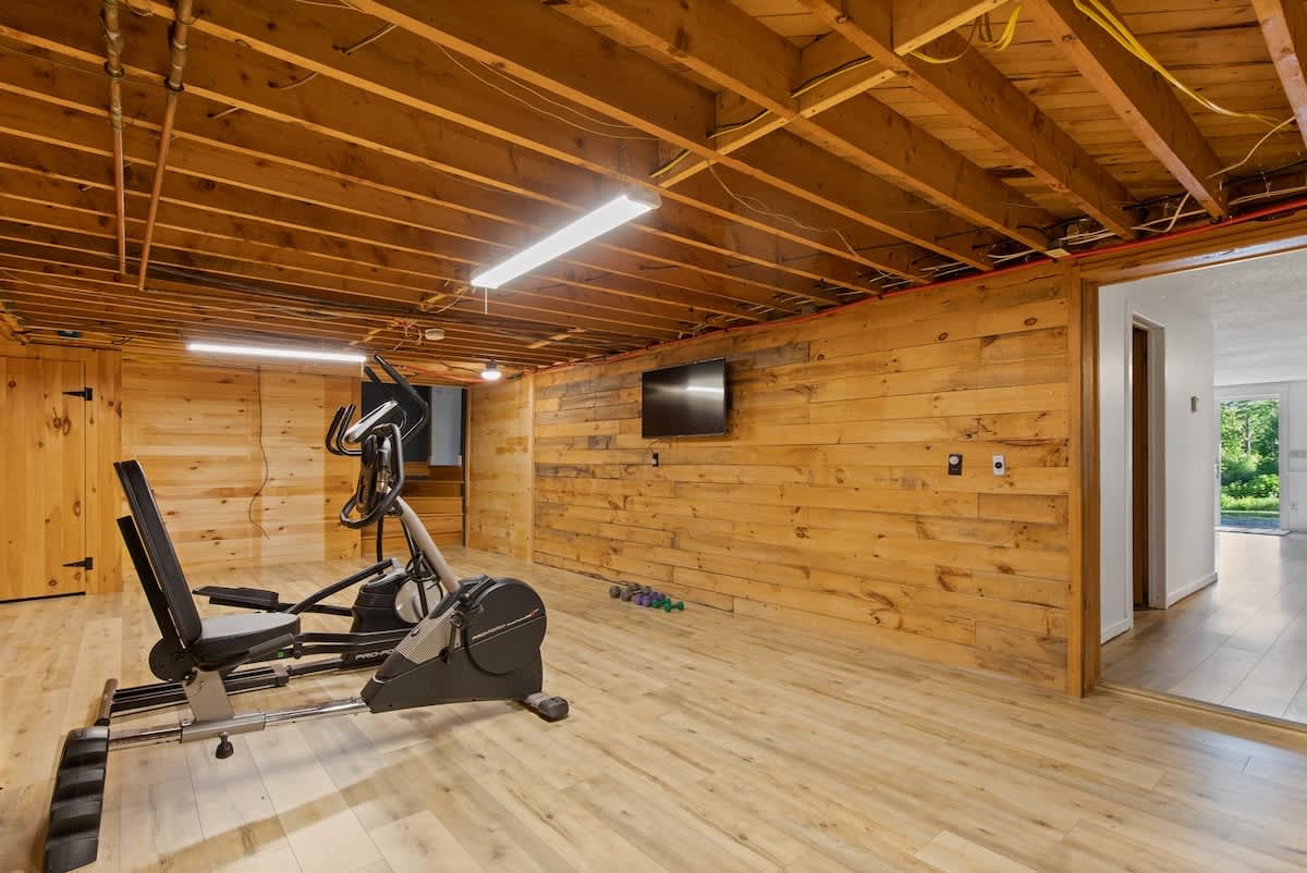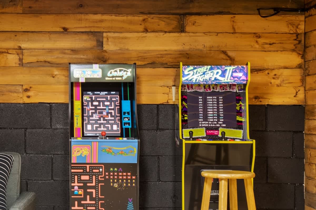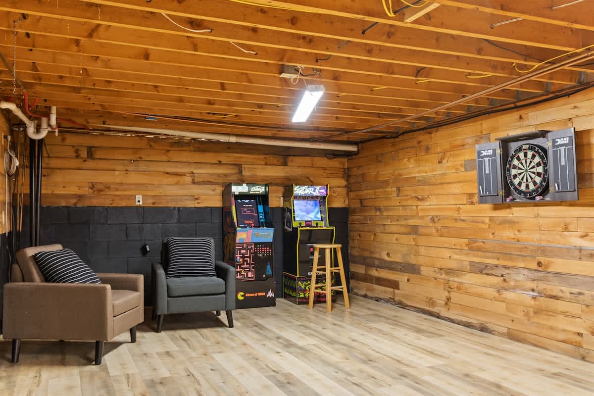 Off the lower living room you’ll find the game room and gym featuring two arcades (Pac Man and Street Fighter), darts, and gym equipment (eliptical, stationary bike, weights, yoga mats, and a flat screen smart TV to stream your favorite workout).