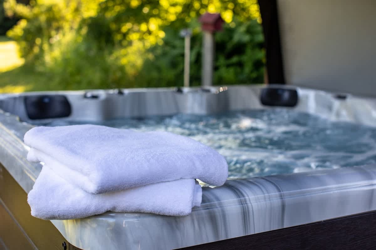 The private front yard includes a dining table for 8, a brand new 6 person hot tub, an upper patio with seating and a bbq and all with a view of the two beautifully landscaped ponds.