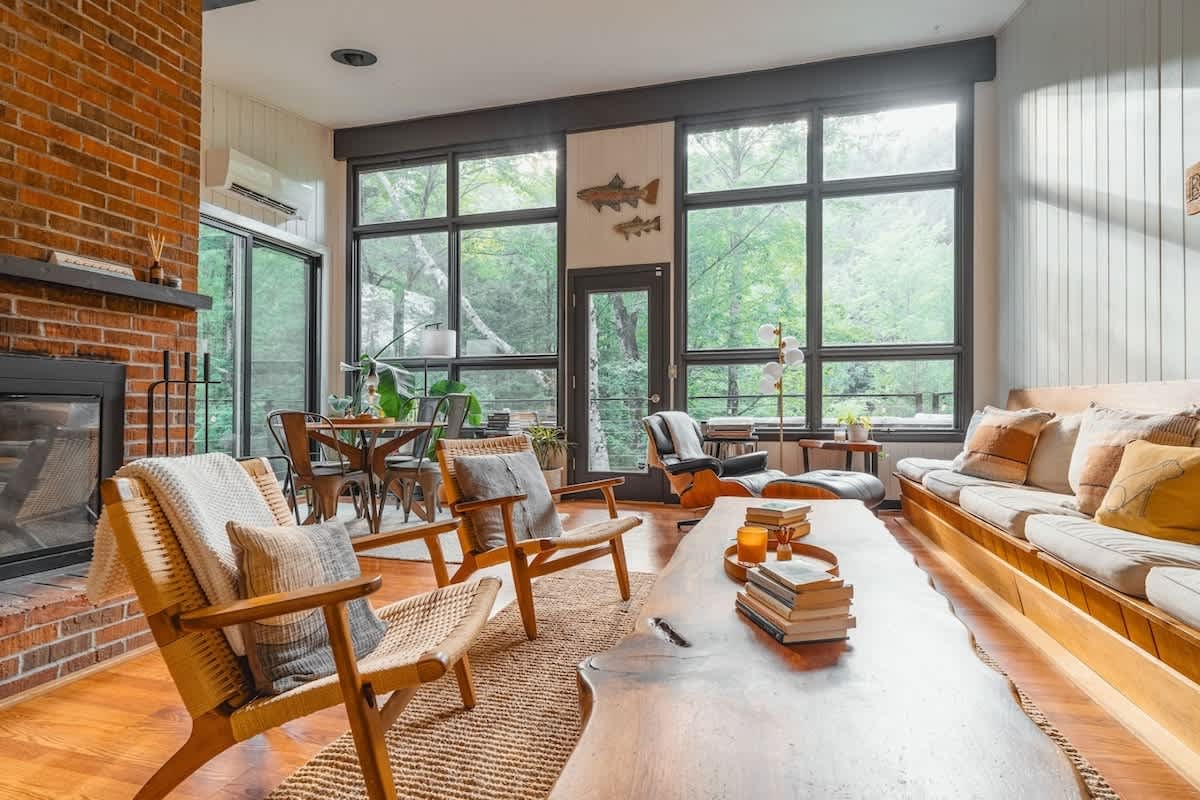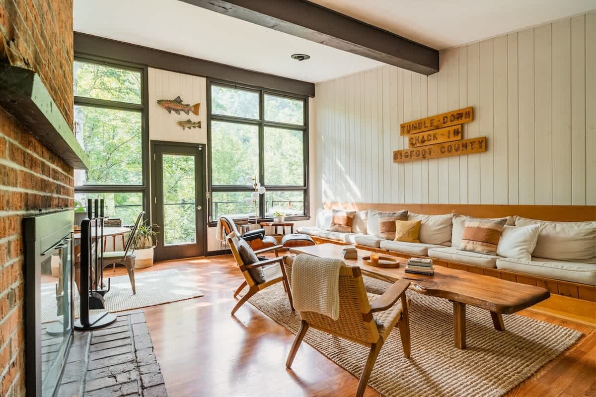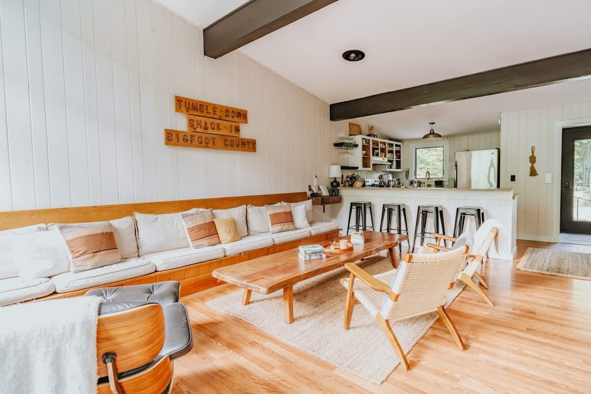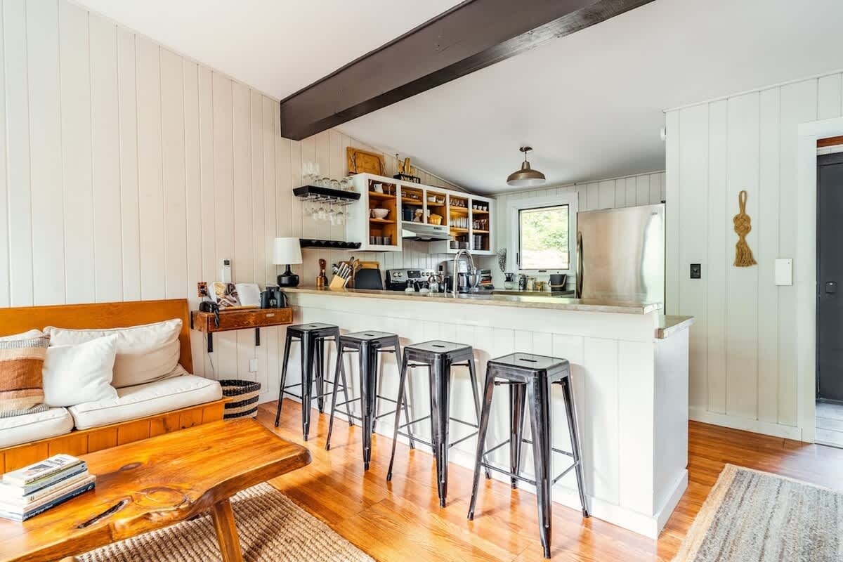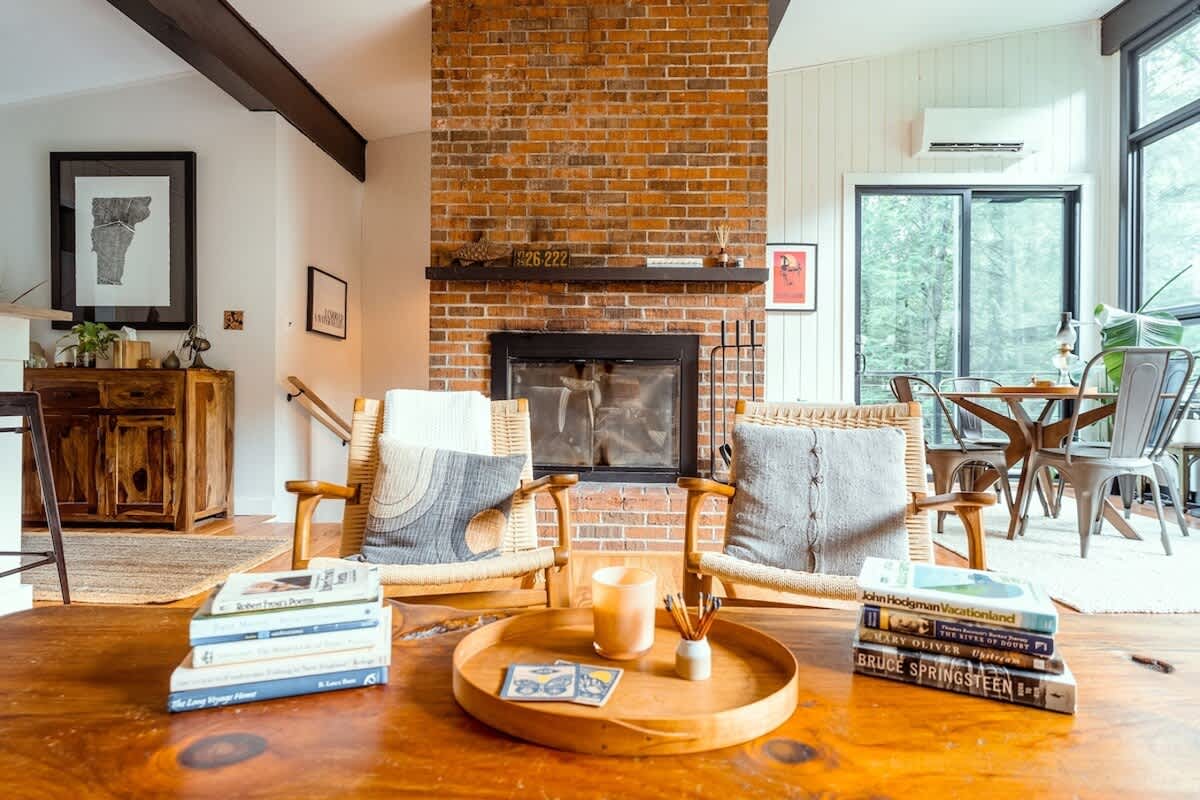 The house features three bedrooms: one queen, one full, and one twin-over-full bunk, a fully stocked, open-concept kitchen with stove, oven, toaster, two types of coffee makers (drip and pour over), WiFi, two TVs, two full bathrooms, Public Goods products, organic bed linens and towels, charcoal grill, outdoor dining and lounge areas, multiple decks, 3.25 wooded acres with trails, fire pit with Polywood Adirondack chairs, and 500 feet of river frontage on the Mad River with private river access and our own swimming hole just a few steps out our backdoor!