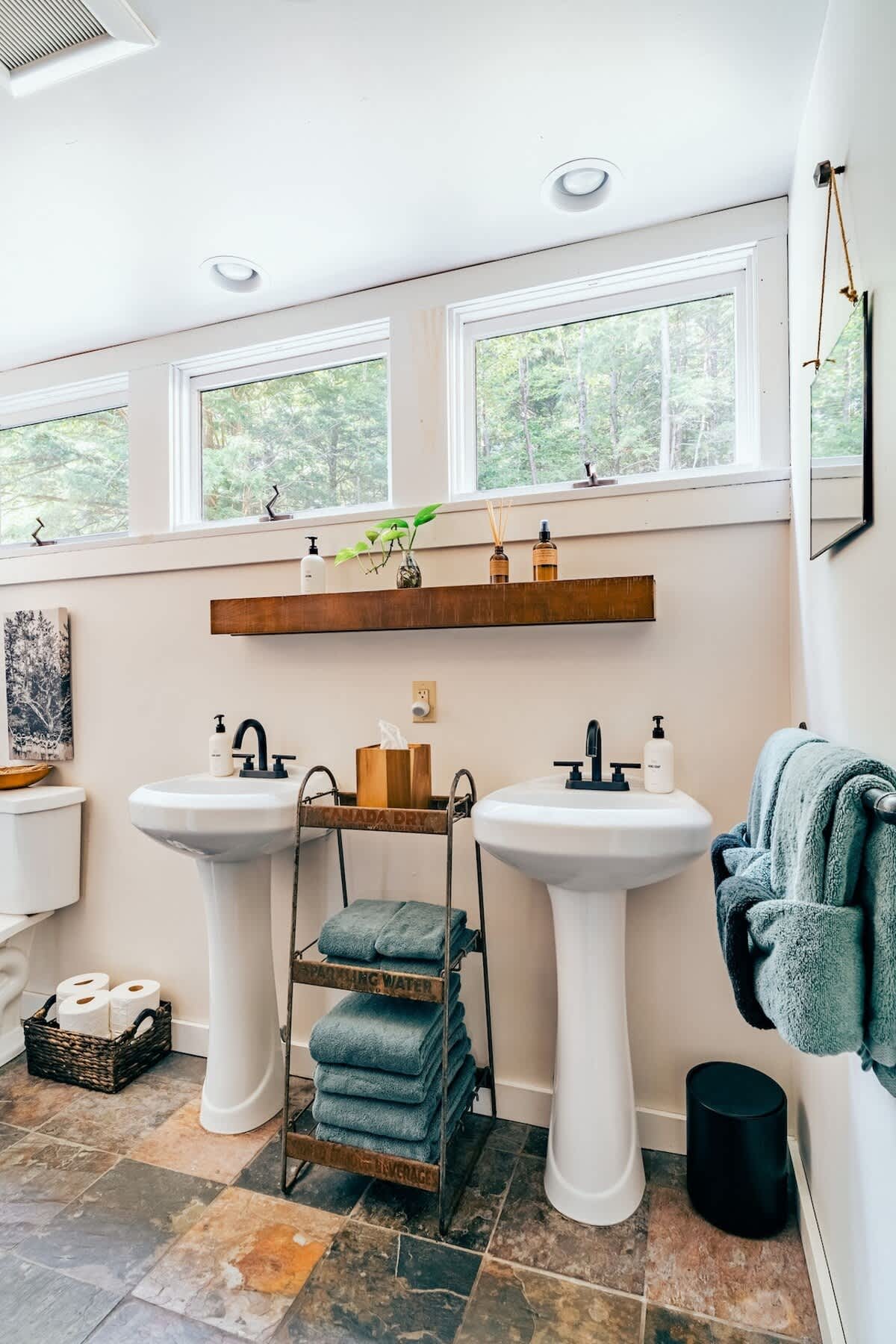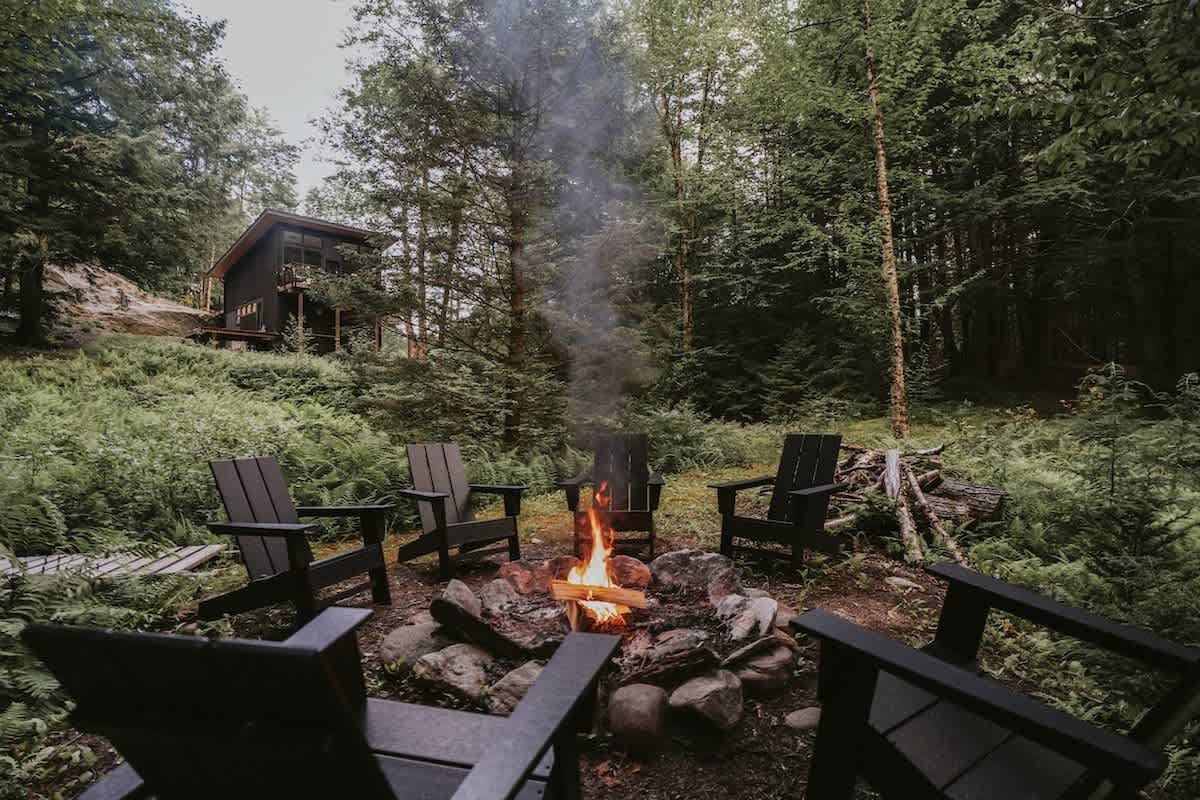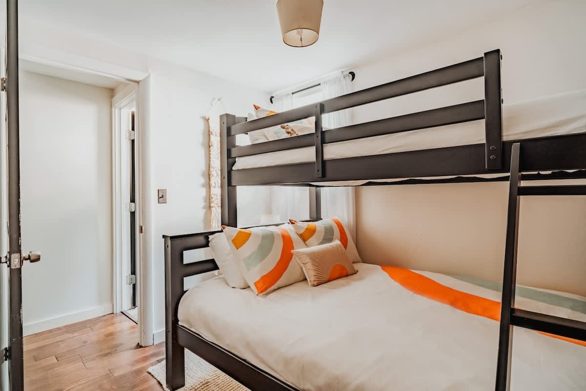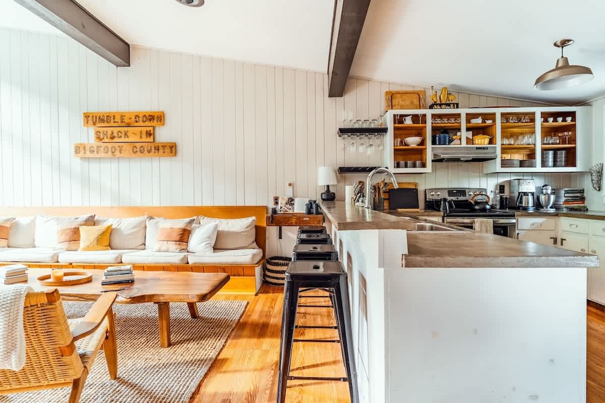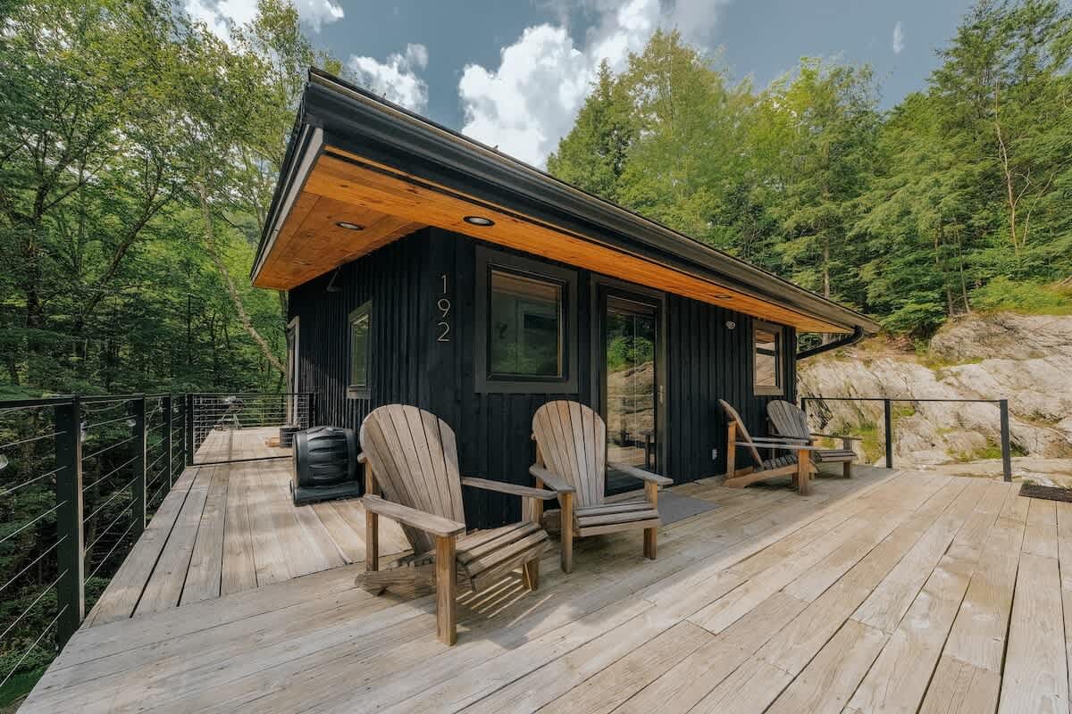 The house features three bedrooms: one queen, one full, and one twin-over-full bunk, a fully stocked, open-concept kitchen with stove, oven, toaster, two types of coffee makers (drip and pour over), WiFi, two TVs, two full bathrooms, Public Goods products, organic bed linens and towels, charcoal grill, outdoor dining and lounge areas, multiple decks, 3.25 wooded acres with trails, fire pit with Polywood Adirondack chairs, and 500 feet of river frontage on the Mad River with private river access and our own swimming hole just a few steps out our backdoor!