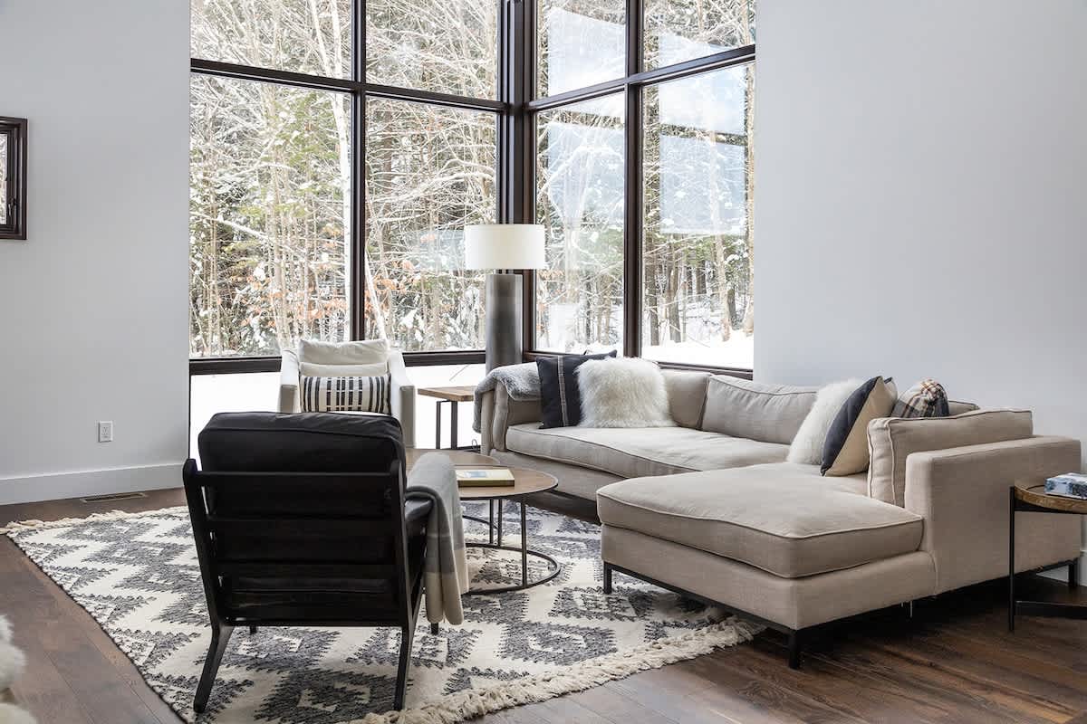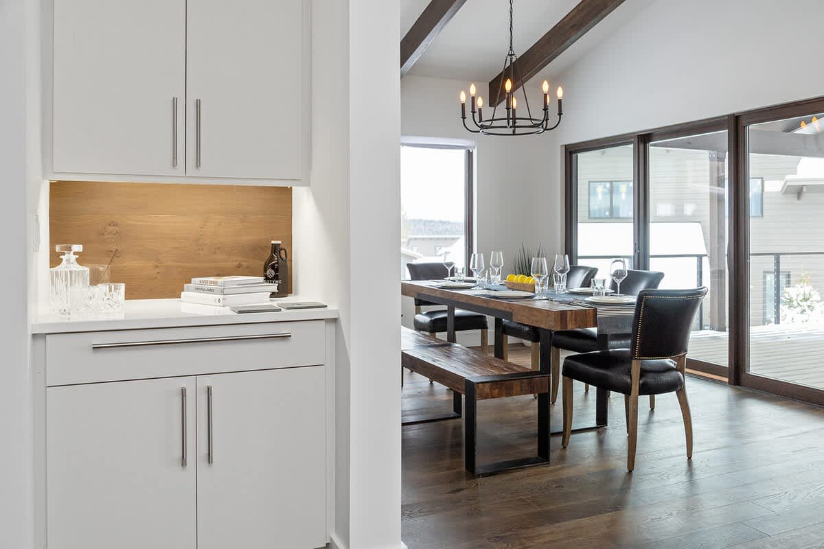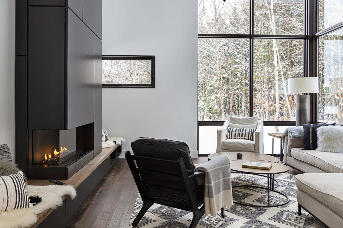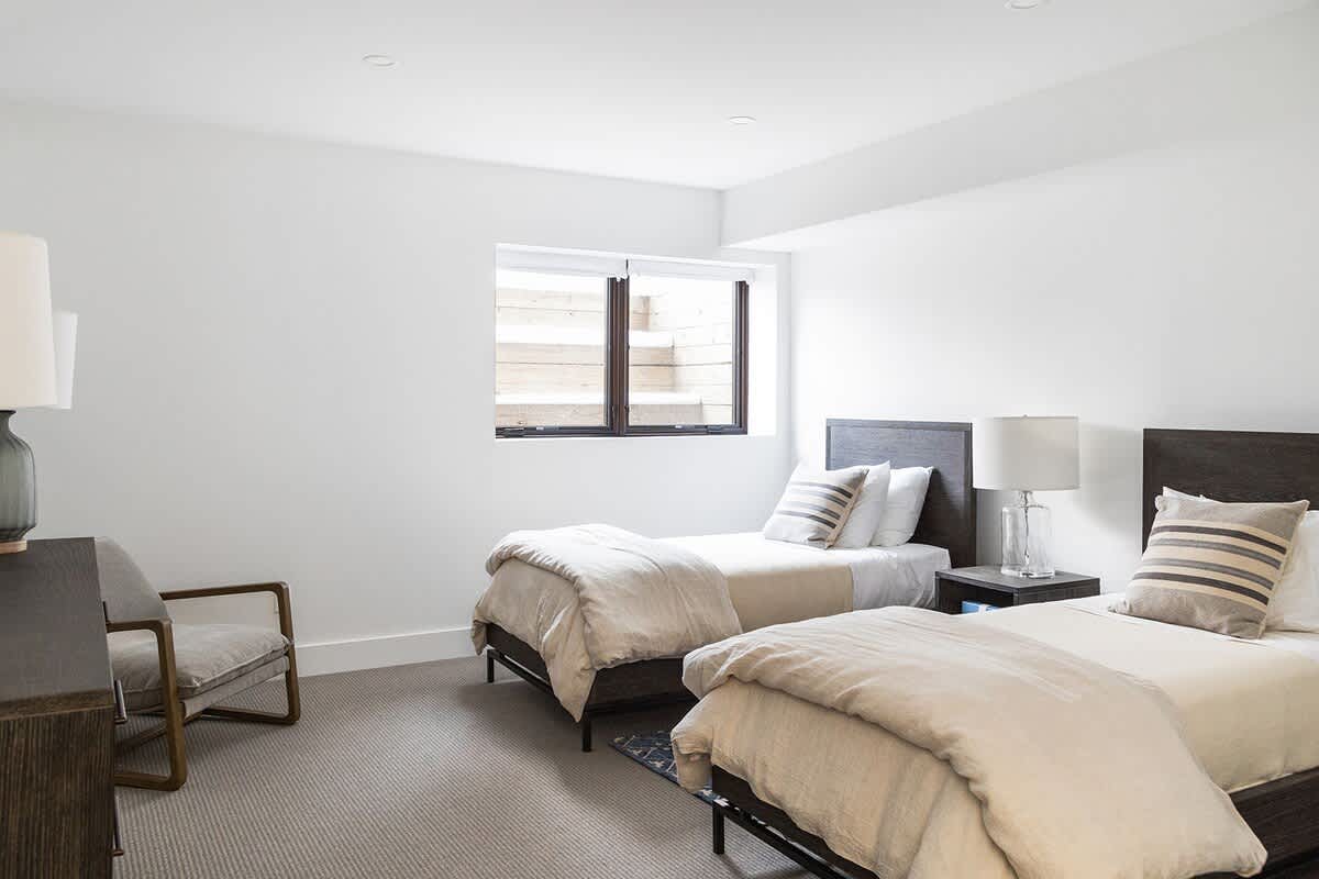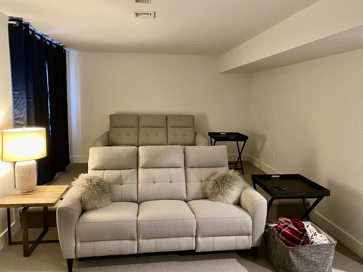 The bright, open living room features a modern gas fireplace, tall ceilings and a plush sectional. Adjacent to the kitchen is a private den where the kids can escape to watch a movie while the adults relax by the fire. The den features lounge furniture and a SmartTV. On the lower level youโll find the best part, a home theater with a 120โ 4K screen and staged theater seating to watch your favorite movie or the big game!