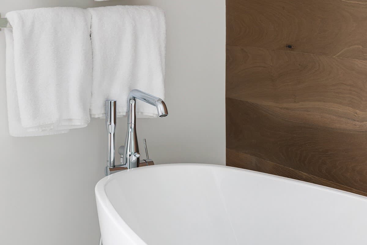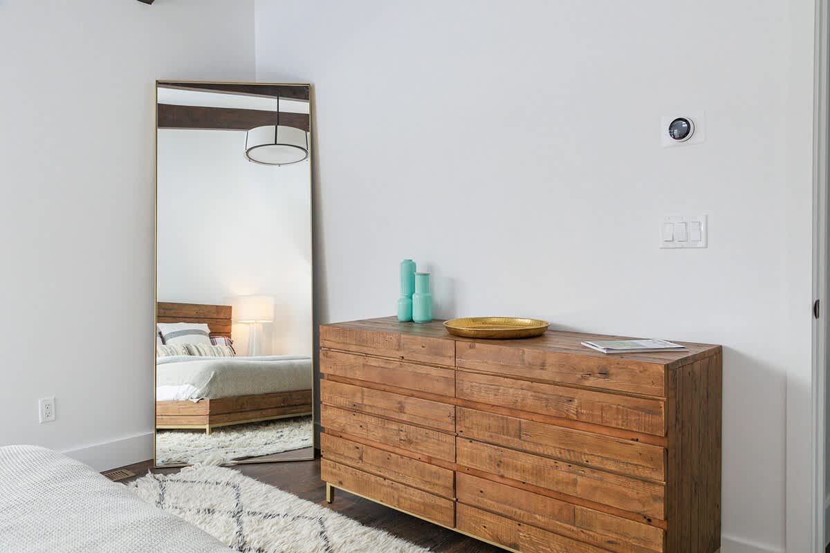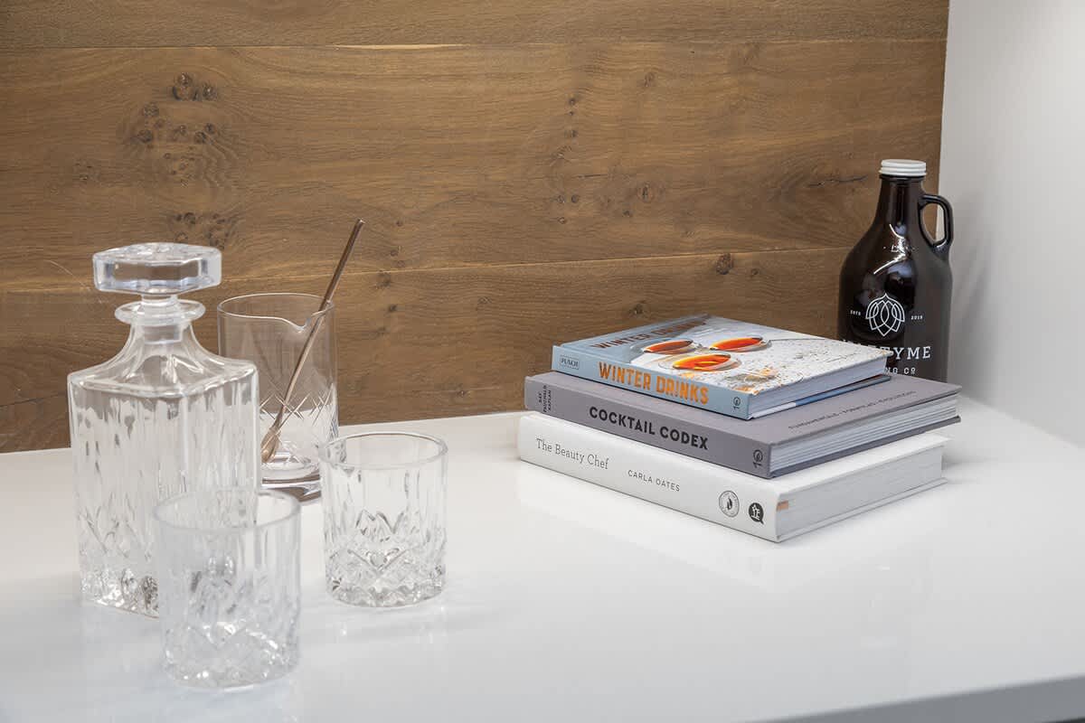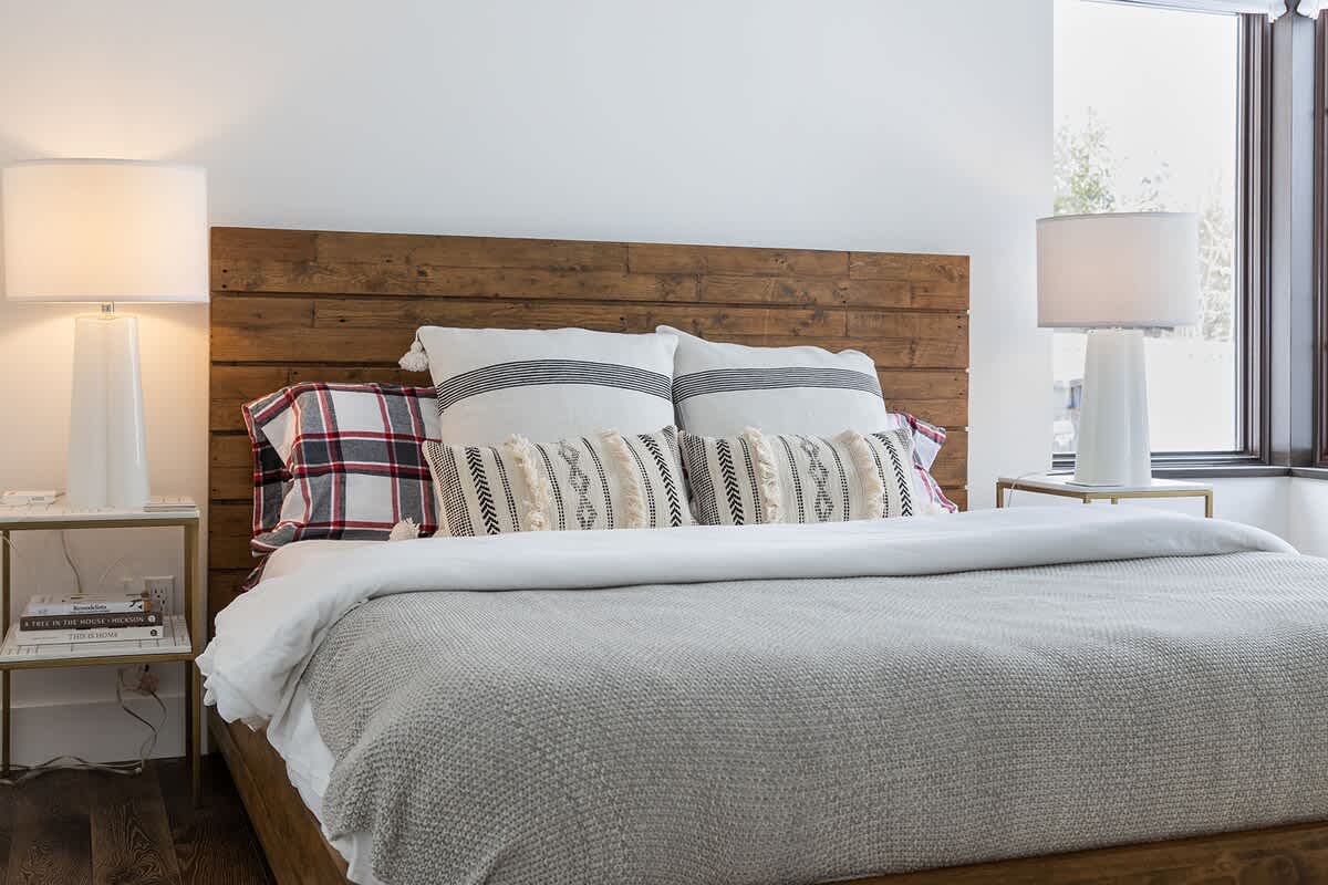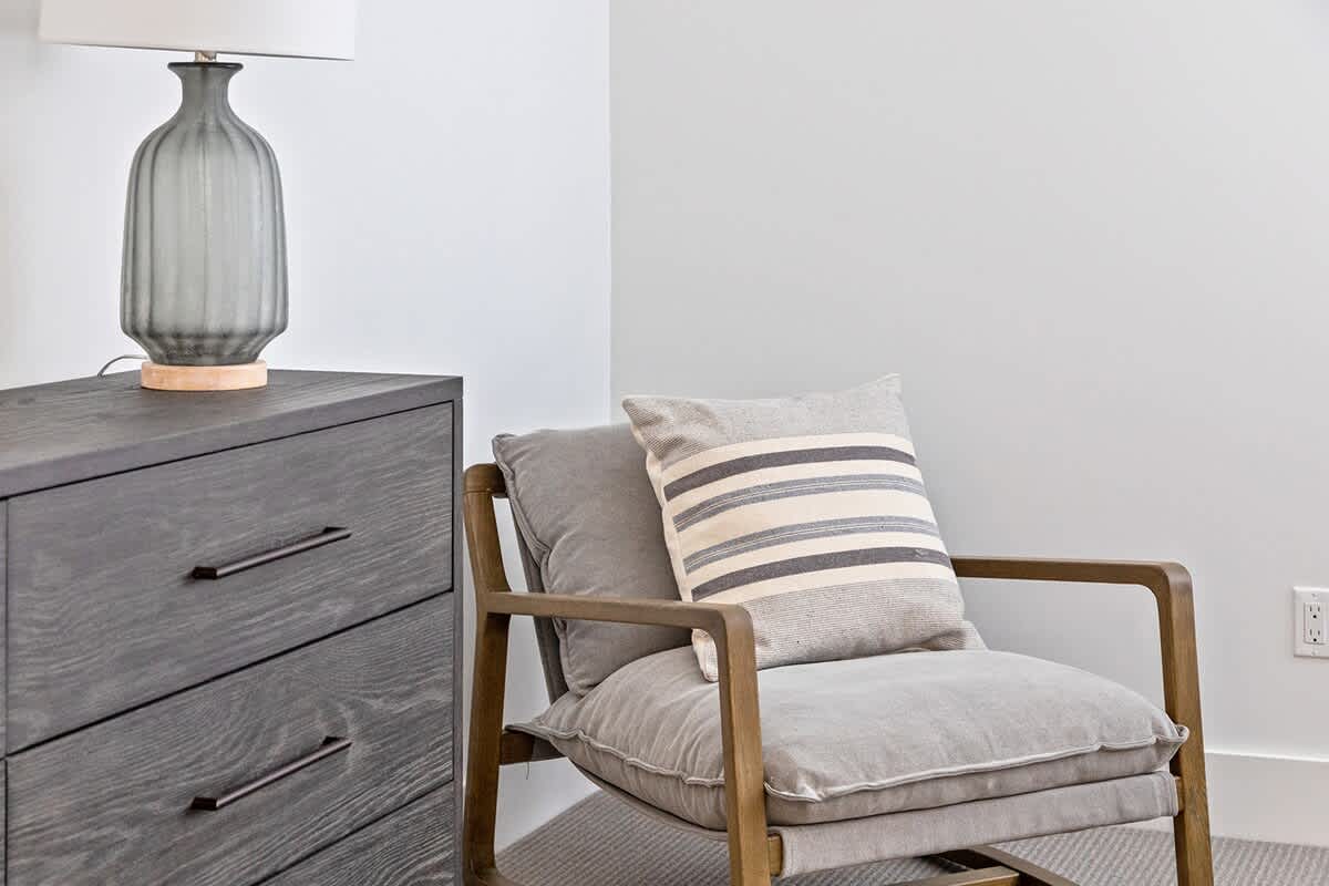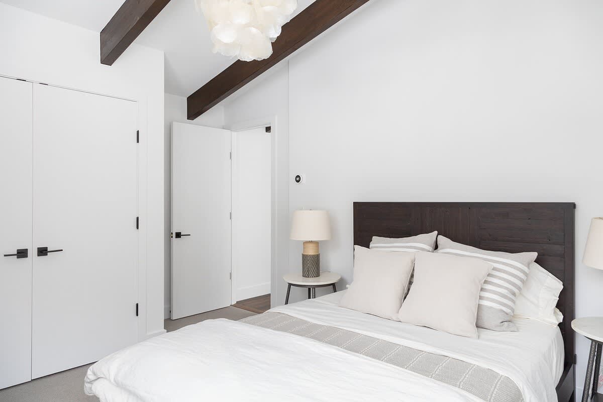 The gourmet chef’s kitchen is outfitted with a brand-new suite of top of the line appliances – including a gas range, a roomy French-door fridge, and an island seating four. Come together for a delicious meal at the beautiful open dining table and make memories that last a lifetime. The kitchen comes stocked with coffee, tea, sugar and creamers, olive oil, salt & pepper, and a surprise welcome basket!