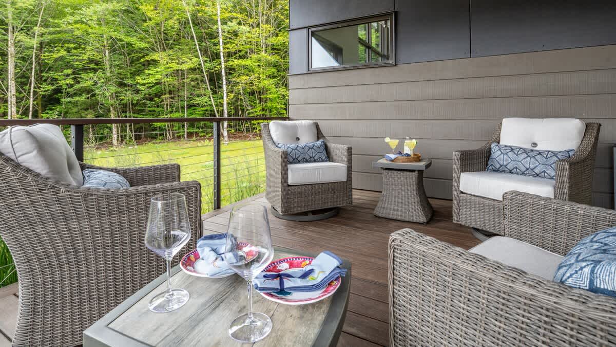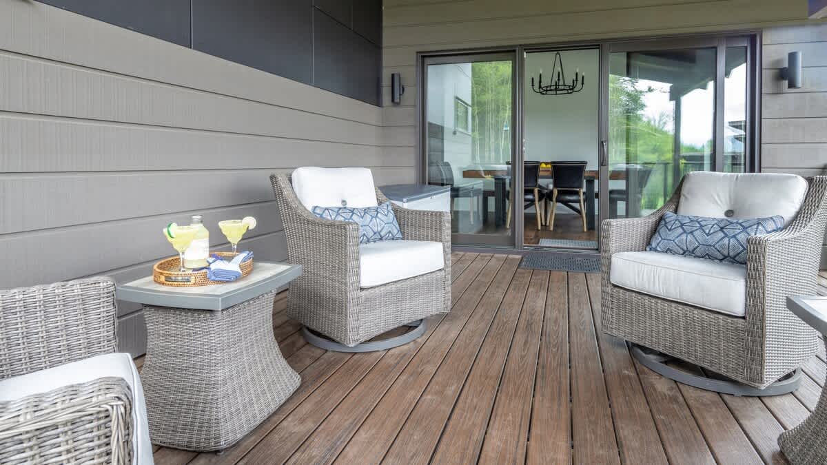 The private deck includes lounge seating and the back patio offers alfresco dining around the fire pit table for six.