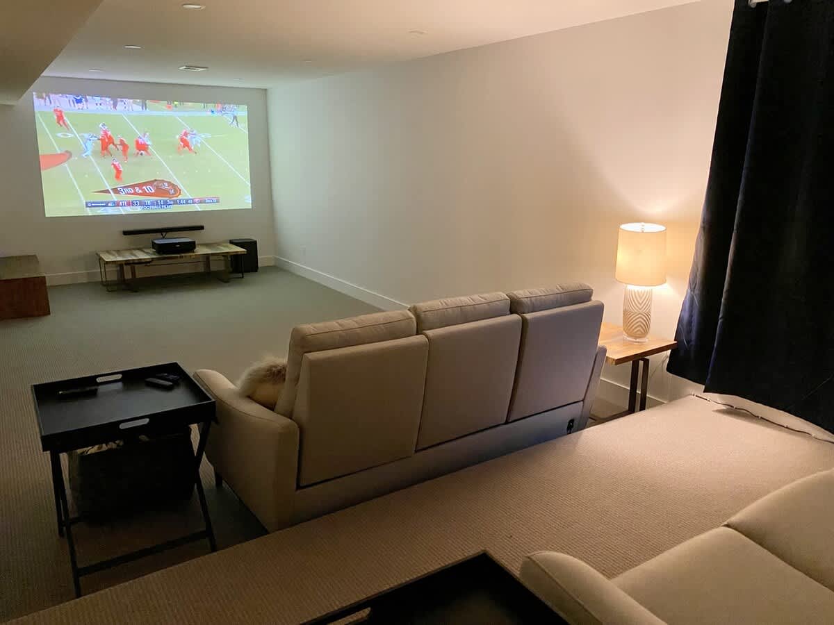 The bright, open living room features a modern gas fireplace, tall ceilings and a plush sectional. Adjacent to the kitchen is a private den where the kids can escape to watch a movie while the adults relax by the fire. The den features lounge furniture and a SmartTV. On the lower level you’ll find the best part, a home theater with a 120” 4K screen and staged theater seating to watch your favorite movie or the big game!