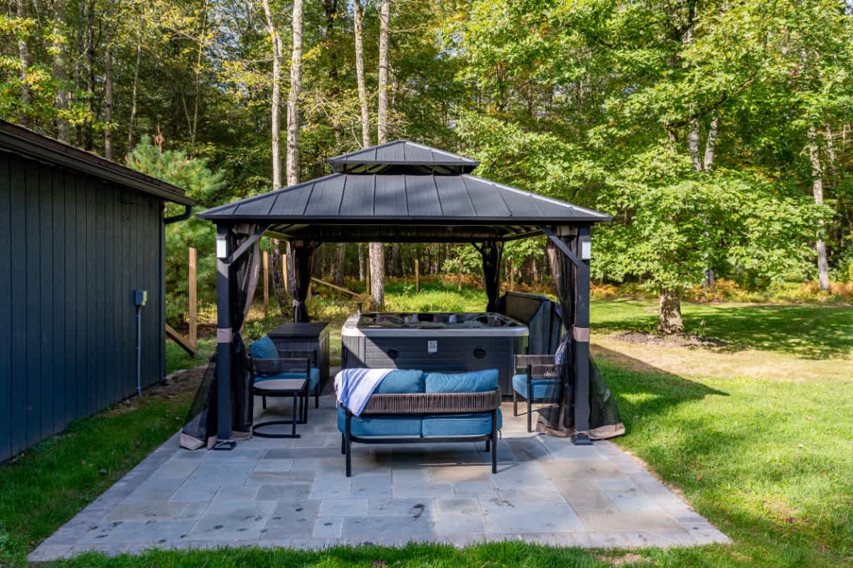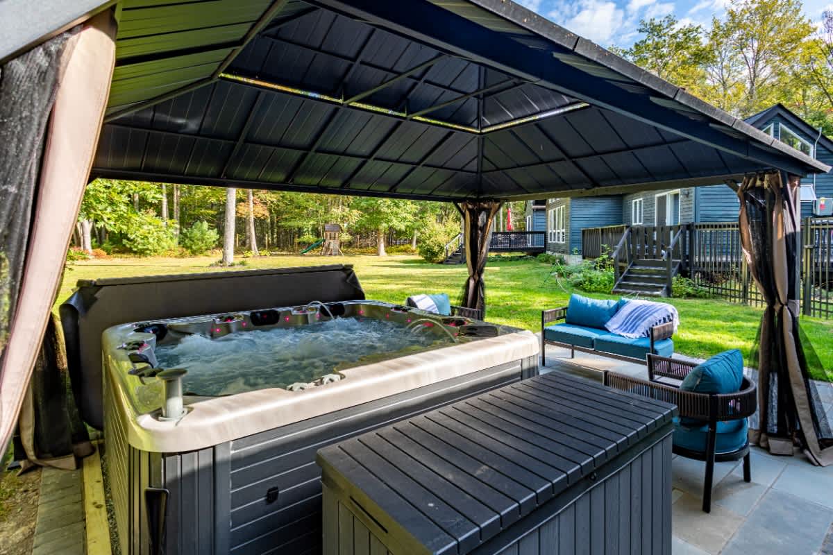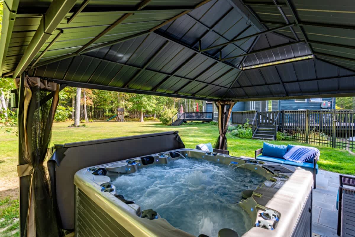 Stepping outside through the foyer’s sliding doors, enjoy an expansive wooden deck with a lounge area, dining table, BBQ grill, Traeger smoker, large umbrellas, and a covered hot tub—perfect for those summer days. The manicured yard features a firepit for evenings under the stars and a children's playhouse for family fun.