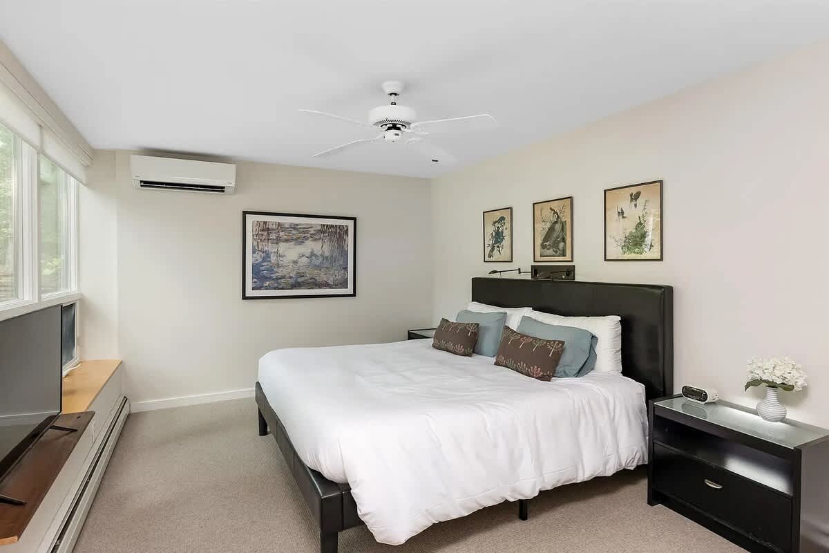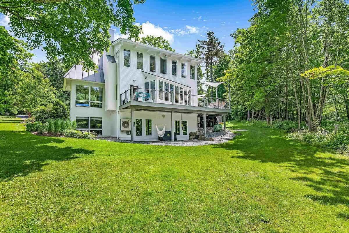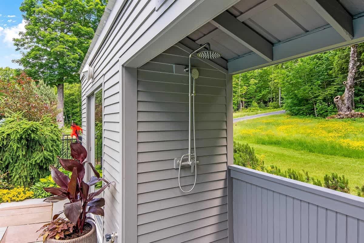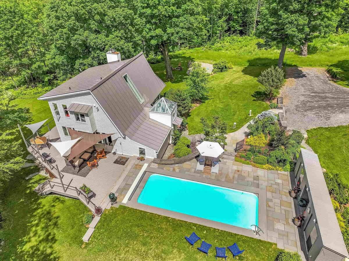 Outside, extend the summer season in the in-ground heated pool, pool house, outdoor shower, and a large wrap around deck perfect for outdoor dining or an escape from the sun. With winter views of Mt. Mansfield and an abundance of breathtaking landscaping, this stylish home is a truly unique and special place to visit! In the summer months, you can use the mini splits for AC- One in primary bedroom, one in living room and one in basement king bedroom. There is not central air AC.