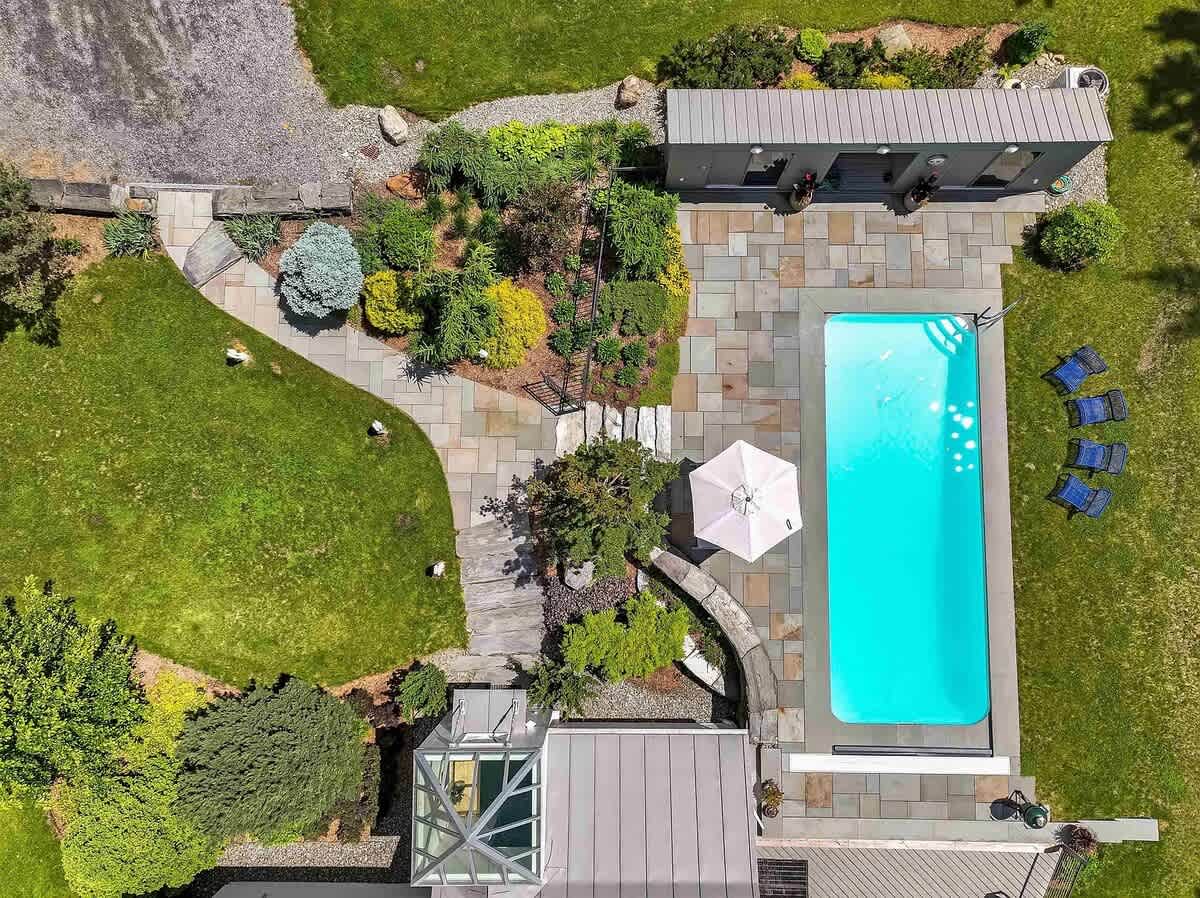This stylish and architecturally designed home brings together clean lines, 10’ ceilings and walls of windows for an abundance of natural light. Upon entering this newly renovated home you’ll be greeted by a glass ceiling, blue stone floor with radiant heat, large closet space and a ¾ bath beautifully tiled with the same fieldstone that surrounds the outdoor pool.