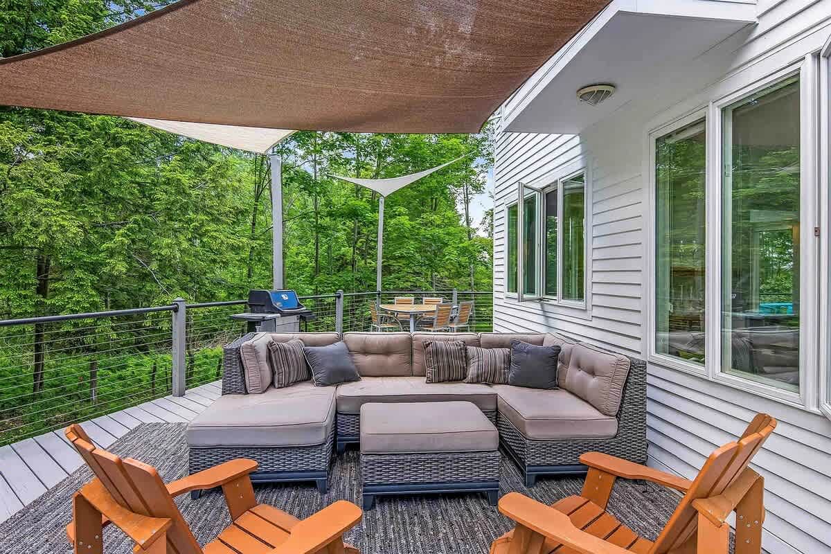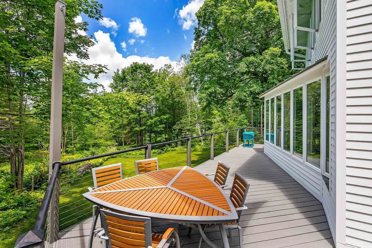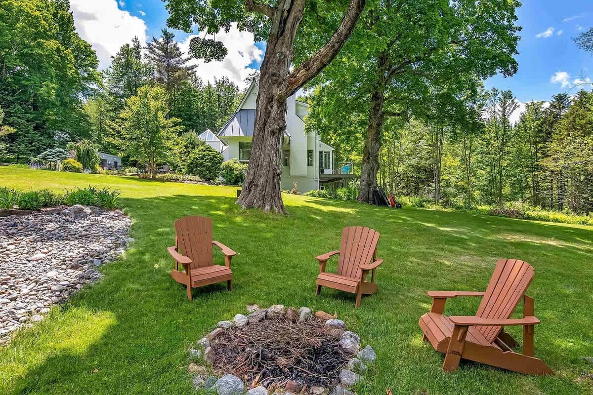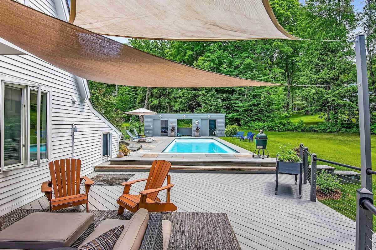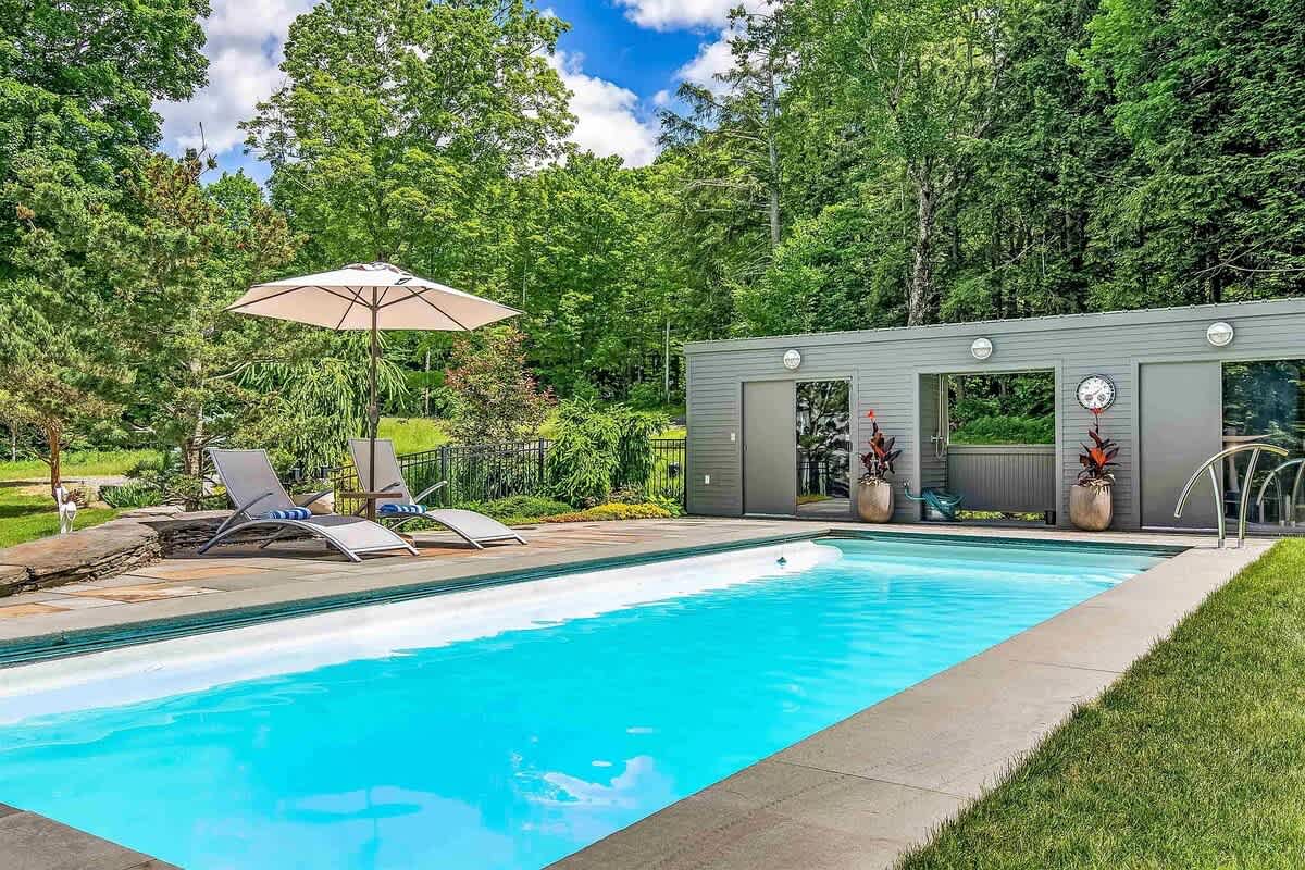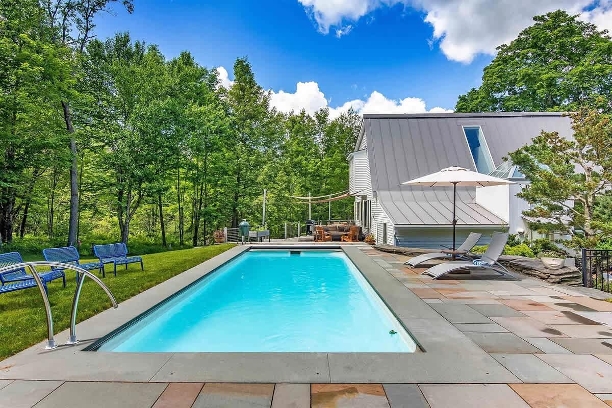 Retreat to this peaceful, modern home, nestled among the trees in the Stowe Vermont! Zenbrook has everything you need to have fun and relax. Pool table, sauna, heated outdoor pool (avail June 1 through September 26), wood fireplace, fire pit with Adirondack chairs and modern furnishings throughout. Expansive windows give you that indoor outdoor feel which makes visiting any time of year spectacular and perfect for soaking in nature.