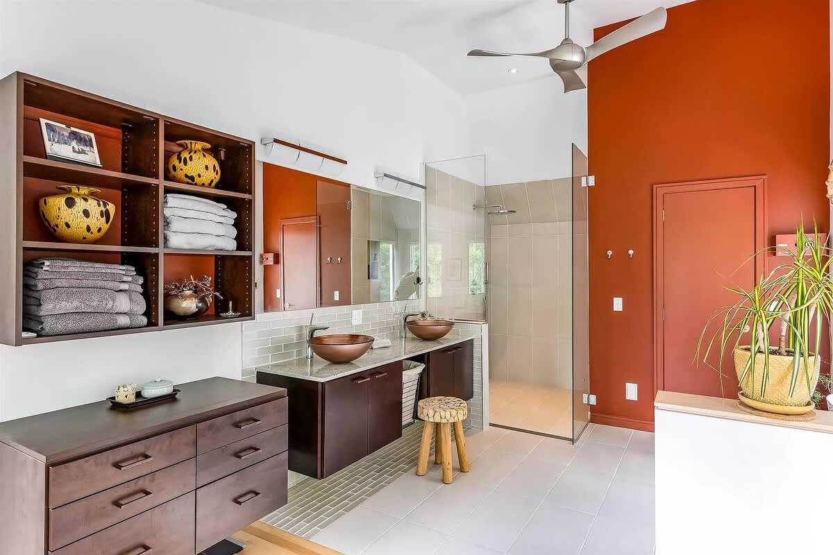 The primary bedroom ensuite encompasses the entire second floor featuring an ensuite bathroom that has dual vessel sinks, sauna, shower, and a soaking tub.