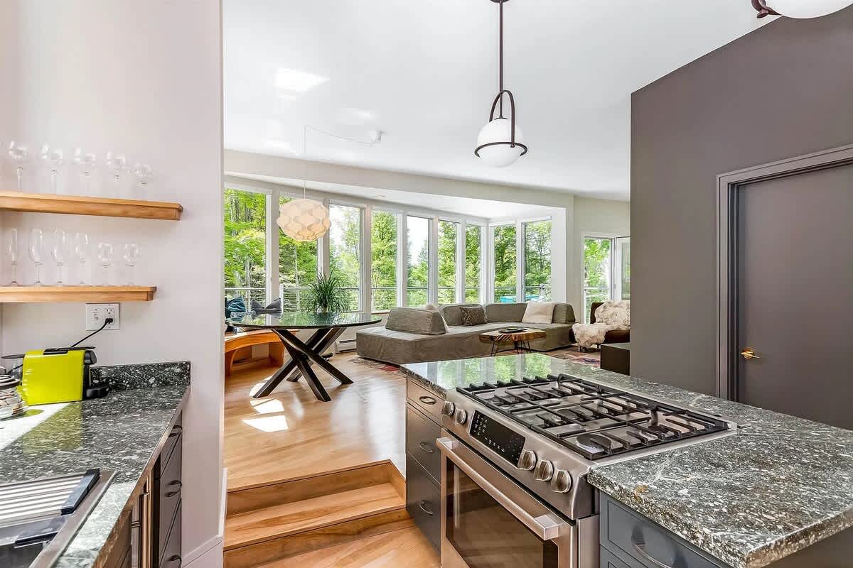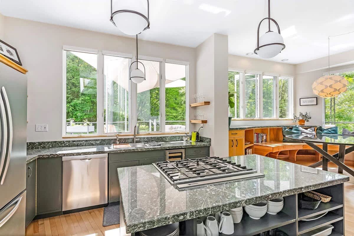 The open concept, fully stocked kitchen is perfect for a socializing and entertaining with a group. Has an in-counter downdraft for the cooktop. The windows and open concept continue, flowing into the dining room, living room and a large sunroom/recreational room.