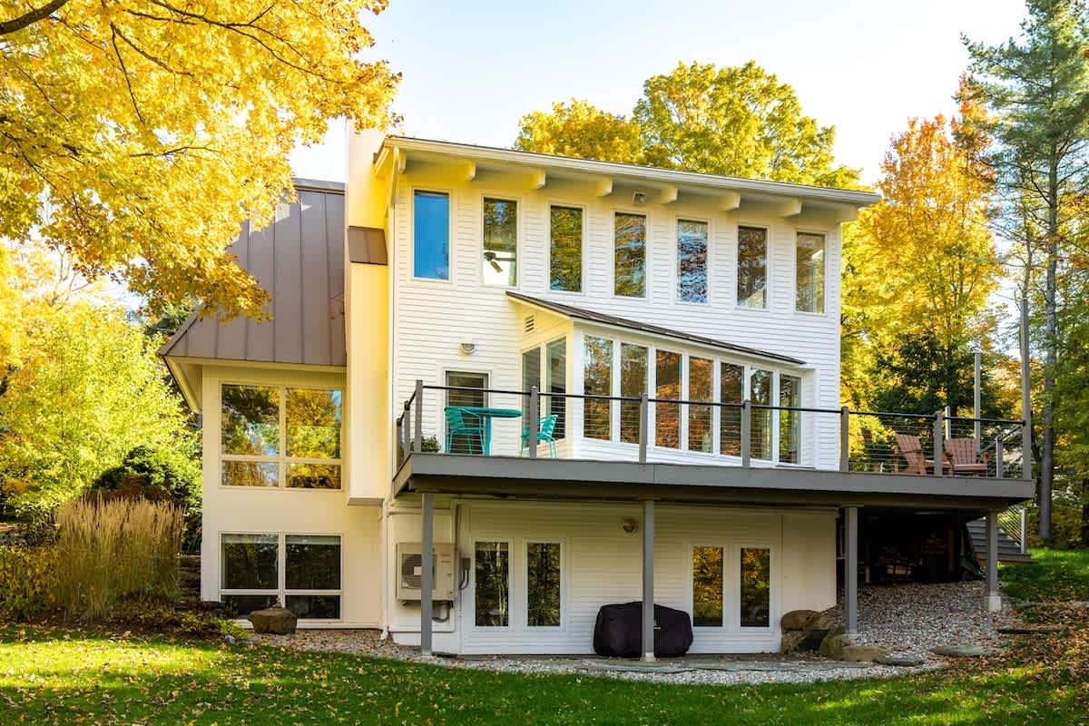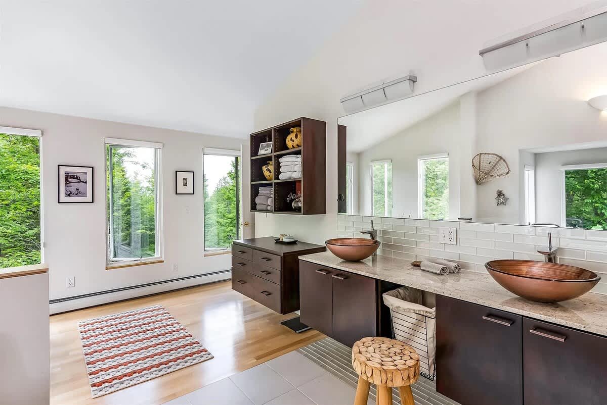 The lower level of the home has another bath and three bedrooms with floor to ceiling windows.
